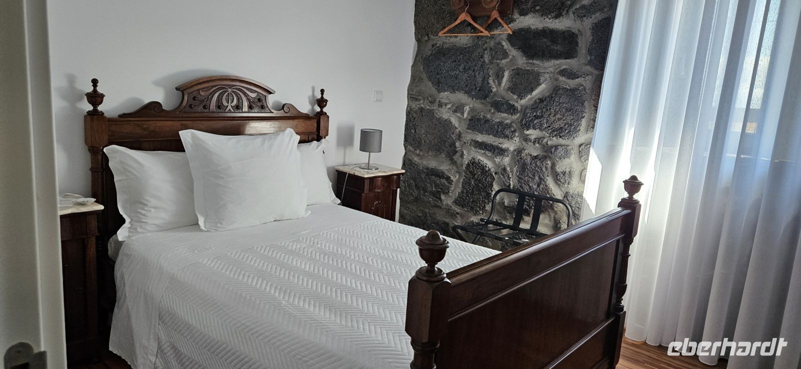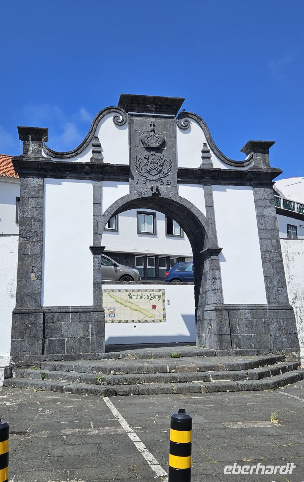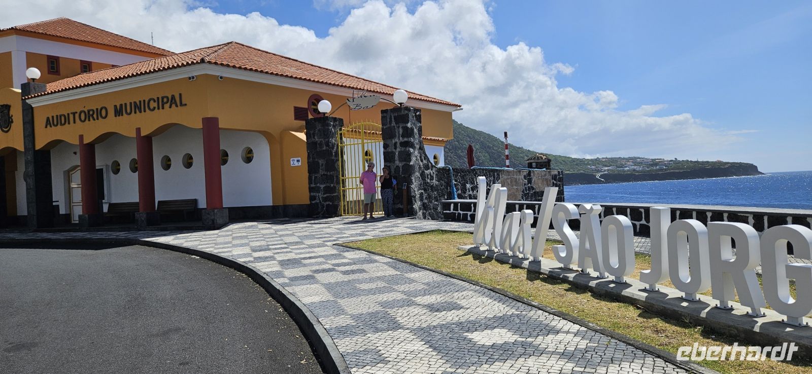 Ein letztes Mal genossen wir das Frühstück im Garten unserer Hotelanlage und dann brachte uns der Bus mit unserem Gepäck zur Fähre in Sao Roque. Auf der kurzen Überfahrt hatten wir Pico mit dem höchsten Berg Portugals immer im Blick und nach 45 Minuten Überfahrt erreichten wir Velas auf der Insel Sao Jorge. Wir verstauten unser Gepäck im Bus und begaben uns zu Fuss in die kleine, übersichtliche Stadt Velas. Heute leben 2000 Menschen im größten Ort der Insel Sao Jorge. Wir betraten die Stadt durch das alte Hafentor, einst Bestandteil der Stadtmauer und Ende des 18. Jahrhunderts errichtet. Gleich dahinter befindet sich ein Kachelbild der Insel und daran erläuterte uns Eva, was wir uns auf Sao Jorge alles anschauen werden. Auf dem Hauptplatz wurde einst Obst und Gemüse verkauft und heute ziert ein Bodenmosaik mit dem Heiligen Georg den Platz. Dahinter ist der Brunnen, aus dem der Drache schaut und auf dem Sockel steht Joao Inacio de Sousa. Die Kirche war leider schon geschlossen und so begaben wir uns zur Promenade am Meer. Dort gab es wieder schöne Meerwasserpools, einen Natursteinbogen und einen "Rahmen" für Fotos zu bewundern. Im Restaurant Acor machten wir unsere Mittagspause mit einem für die Mittagszeit typischen Menue. Einige nahmen dann ein kühlendes Bad im Atlantik und mit unserem Bus fuhren wir zum Supermarkt, um uns mit dem Nötigsten einzudecken, denn das nächste Hotel war sehr abgelegen. Die Quinta dos Misterios in der Nähe des kleinen Flughafens von Sao Jorge ist ein altes Herrenhaus, welches aufwendig renoviert wurde und mit Möbeln aus noch 2 weiteren Herrenhäusern der Besitzerin ausgestattet wurde. Wir erlebten einen sehr herzlichen Empfang durch Katarina und sie führte uns erst einmal durch das gesamte Anwesen. Man fühlte sich wie in einem Museum, welches zum Leben erweckt wurde und nun Gäste aufnehmen durfte. Alle Räumlichkeiten standen unseren Gästen offen, auch an einen großen Kühlschrank hatte man gedacht. Im Garten gab es einen wunderschönen Pool mit Aussicht bis hinüber zum Pico auf der Nachbarinsel. Beim Streifen durch die historischen Räume duftete es plötzlich nach frischem Kuchen und den hatte die Hausherrin selbst für unsere Gäste für das Frühstück gebacken. Dann wurden die Zimmer verteilt und alle waren ganz unterschiedlich möbliert, hatten aber alle ein eigenes Badezimmer. Es war ein absolutes Erlebnis, nur reichten die Zimmer für Eva und mich nicht aus und so wurden wir beide hinunter nach Velas in ein nettes B&B gebracht. Zum Abendessen waren wir wieder mit unseren Gästen zusammen und gingen gleich in das Restaurant neben der Quinta dos Misterios.