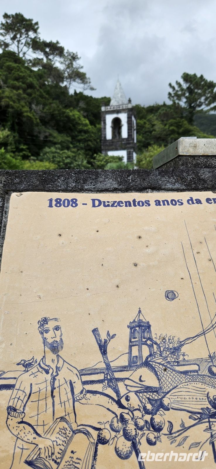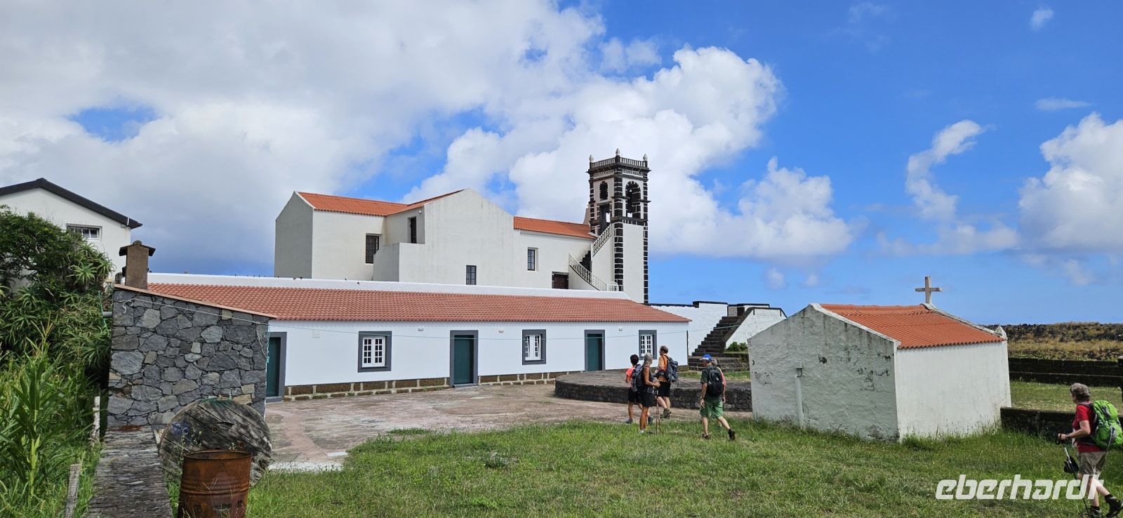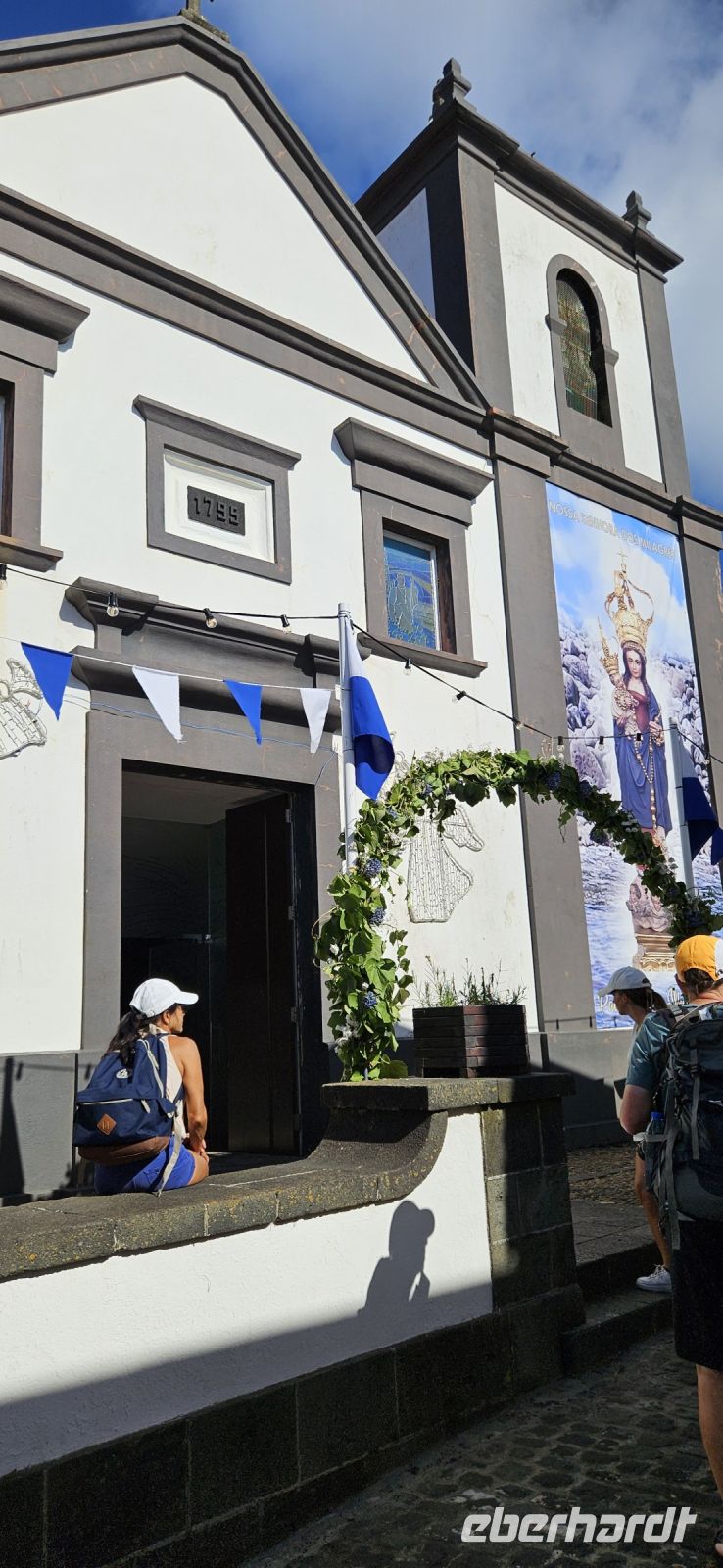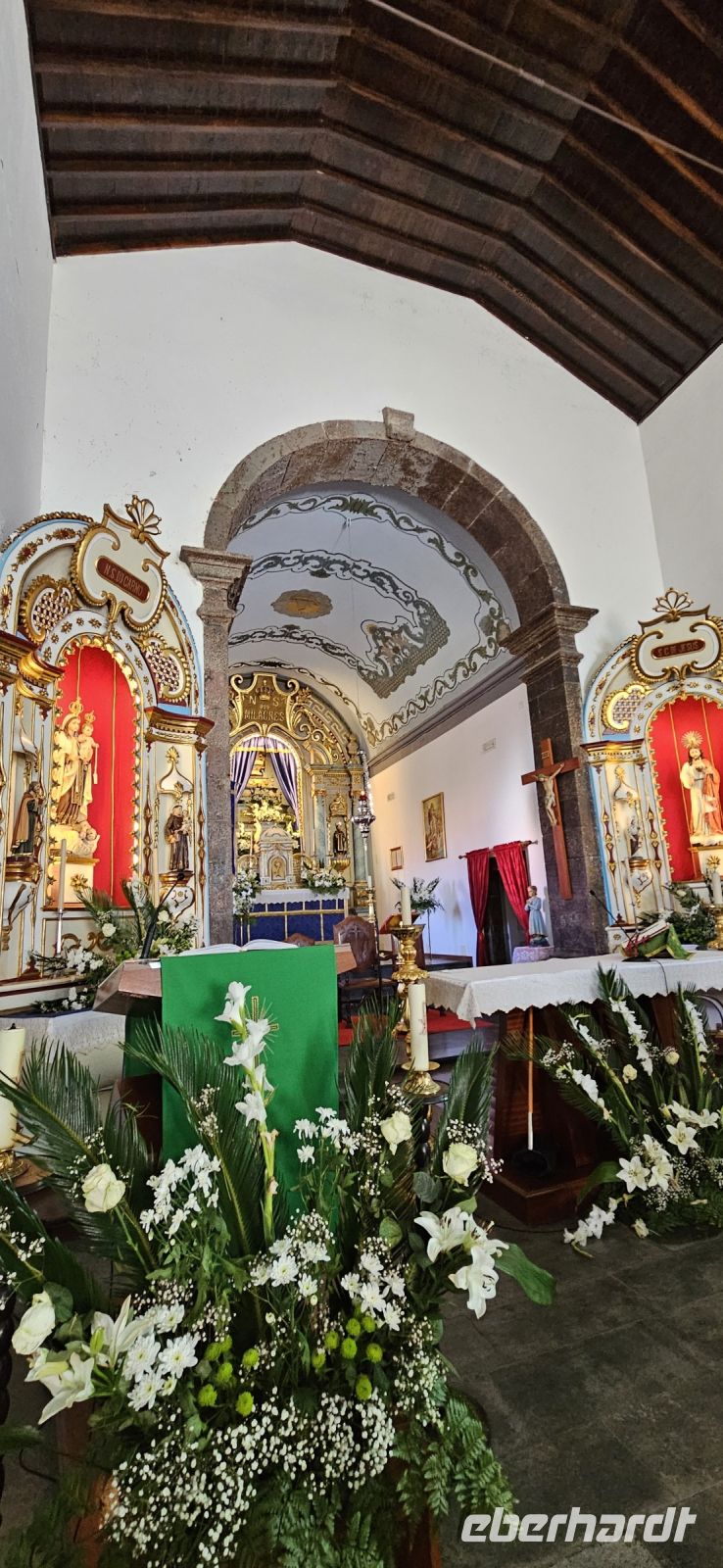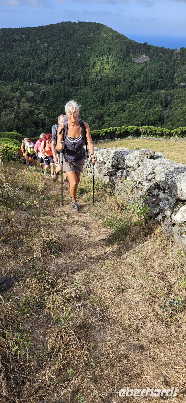 Der Tag begann mit einem grandiosen Frühstück in der Quinta dos Misterios und als Eva und ich oben ankamen, mussten wir auch noch von dem leckeren Kuchen probieren. Dann fuhren wir gut gestärkt zum Wanderausgangspunkt in der Faja dos Cubres. Es war wieder sehr warm und so begannen wir unser Tagesprogramm mit der Wanderung von der Faja dos Cubres zur Faja da Caldeira de Santo Cristo. Der gut ausgebaute Weg führt immer parallel zur Küste im ständigen Auf und Ab, mal im Schatten der Bäume, mal in der Sonne. Am Wegesrand stand der wilde Ingwer in voller Blüte und in der Faja de Santo Cristo kehrten wir kurz ein und besuchten die Pilgerkirche. Wieder zurück am Ausgangspunkt nahmen wir unsere Picknick Tüten aus dem Bus und stärkten uns. Das Picknick hatte man in der Busfirma sehr liebevoll zusammengestellt. Über die steile und serpentinenreiche Strasse fuhren wir wieder nach oben, machten am Aussichtspunkt einen Fotostopp und konnten von oben nochmals unseren Wanderweg verfolgen. Von der Nordküste der Insel Sao Jorge fuhren wir nun zur Südküste wieder über eine kurvenreiche kleine Strasse zur Faja dos Vimes. Dort betreibt die Familie Nunes seit 50 Jahren eine Kaffeeplantage mit ca. 1000 Kaffeepflanzen und "produziert" einen wohlschmeckenden Kaffee. In der kleinen Cafeteria durften wir ihn probieren und danach führte uns ein Mitarbeiter durch den Garten mit den Kaffeebäumen und Feigenbäumen. Zum Anwesen der Familie gehört auch eine Weberei, in der aus Naturmaterialien verschieden große Decken gewebt werden. Auch in der Quinta dos Misterios lag eine so große und wertvolle Tagesdecke aus der Weberei Nunes auf einem Bett. Auf der Rückfahrt machten wir Stopp in Manadas und dort besuchten wir die Kirche der Heiligen Barbara. Dieses Kleinod stammt aus dem Jahr 1770 und ist im azorianischen Barock erbaut. Die Kirche ist aufwendig verziert und vergoldet und die Kassettendecke aus Zedernholz ist etwas ganz besonderes. Auf den Azulejos ist die tragische Geschichte der Heiligen Barbara dargestellt. Wir erlebten eine ausführliche Kirchenführung durch einen Mitarbeiter und Eva übersetzte für uns. Nun folgte noch die Besichtigung des alten Kirchturmes in Urzulina. Er blieb nach einem Erdbeben mit Erdrutsch als einziges Baudenkmal in Urzulina noch erhalten. Zum gemeinsamen Abendessen trafen wir uns im Restaurant der Cantinha das Buganvilias. Dort saßen wir draussen auf der Terrasse mit Blick zum Pico und auf Velas und wir genossen das gute Abendessen und einen traumhaften Sonnenuntergang.