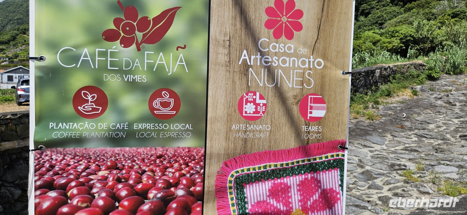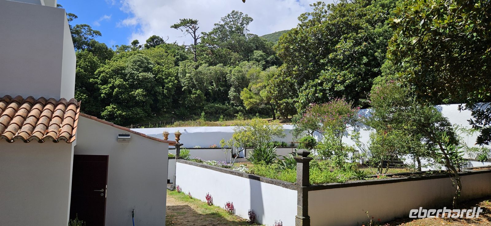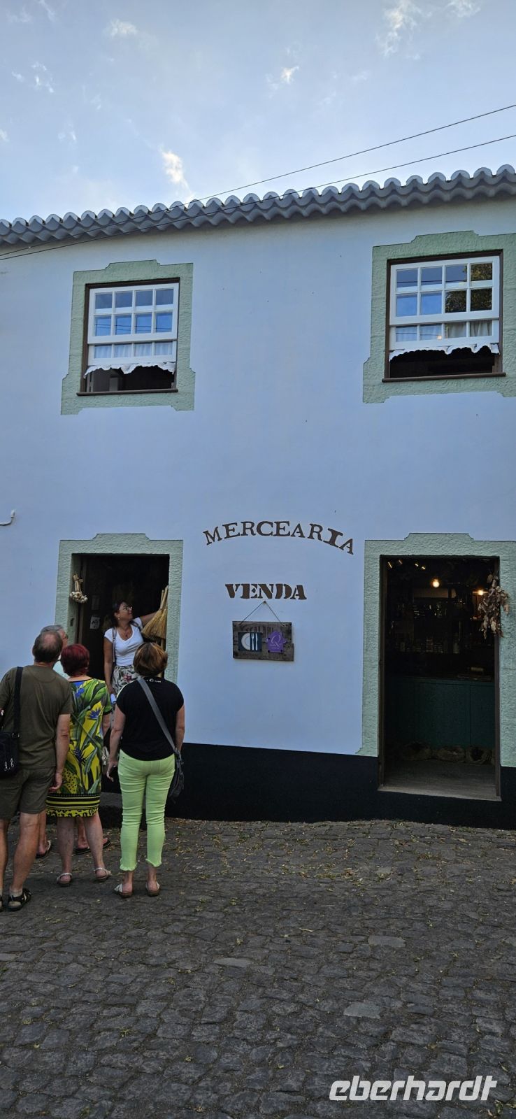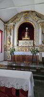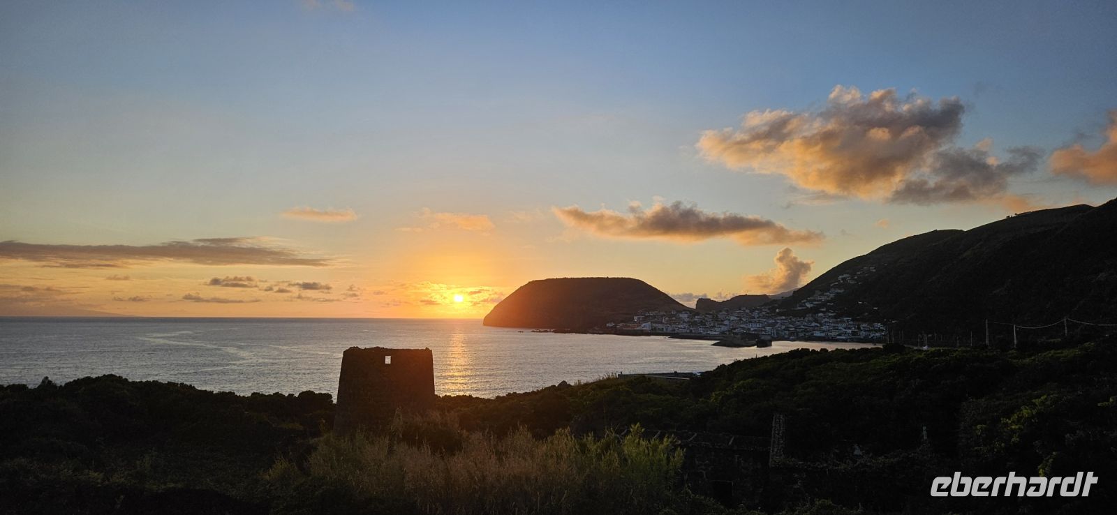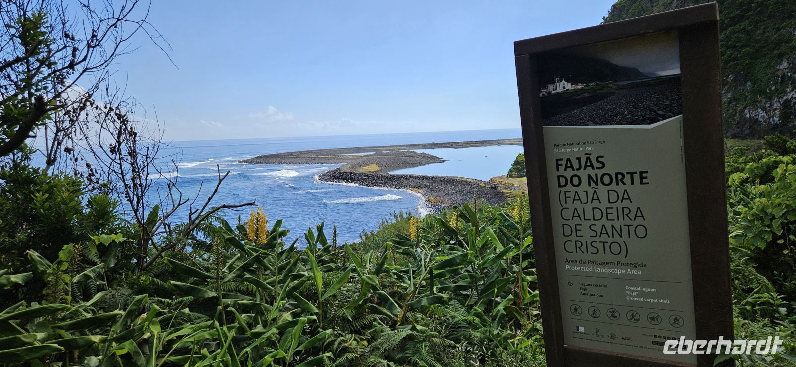 Der Tag begann mit einem grandiosen Frühstück in der Quinta dos Misterios und als Eva und ich oben ankamen, mussten wir auch noch von dem leckeren Kuchen probieren. Dann fuhren wir gut gestärkt zum Wanderausgangspunkt in der Faja dos Cubres. Es war wieder sehr warm und so begannen wir unser Tagesprogramm mit der Wanderung von der Faja dos Cubres zur Faja da Caldeira de Santo Cristo. Der gut ausgebaute Weg führt immer parallel zur Küste im ständigen Auf und Ab, mal im Schatten der Bäume, mal in der Sonne. Am Wegesrand stand der wilde Ingwer in voller Blüte und in der Faja de Santo Cristo kehrten wir kurz ein und besuchten die Pilgerkirche. Wieder zurück am Ausgangspunkt nahmen wir unsere Picknick Tüten aus dem Bus und stärkten uns. Das Picknick hatte man in der Busfirma sehr liebevoll zusammengestellt. Über die steile und serpentinenreiche Strasse fuhren wir wieder nach oben, machten am Aussichtspunkt einen Fotostopp und konnten von oben nochmals unseren Wanderweg verfolgen. Von der Nordküste der Insel Sao Jorge fuhren wir nun zur Südküste wieder über eine kurvenreiche kleine Strasse zur Faja dos Vimes. Dort betreibt die Familie Nunes seit 50 Jahren eine Kaffeeplantage mit ca. 1000 Kaffeepflanzen und "produziert" einen wohlschmeckenden Kaffee. In der kleinen Cafeteria durften wir ihn probieren und danach führte uns ein Mitarbeiter durch den Garten mit den Kaffeebäumen und Feigenbäumen. Zum Anwesen der Familie gehört auch eine Weberei, in der aus Naturmaterialien verschieden große Decken gewebt werden. Auch in der Quinta dos Misterios lag eine so große und wertvolle Tagesdecke aus der Weberei Nunes auf einem Bett. Auf der Rückfahrt machten wir Stopp in Manadas und dort besuchten wir die Kirche der Heiligen Barbara. Dieses Kleinod stammt aus dem Jahr 1770 und ist im azorianischen Barock erbaut. Die Kirche ist aufwendig verziert und vergoldet und die Kassettendecke aus Zedernholz ist etwas ganz besonderes. Auf den Azulejos ist die tragische Geschichte der Heiligen Barbara dargestellt. Wir erlebten eine ausführliche Kirchenführung durch einen Mitarbeiter und Eva übersetzte für uns. Nun folgte noch die Besichtigung des alten Kirchturmes in Urzulina. Er blieb nach einem Erdbeben mit Erdrutsch als einziges Baudenkmal in Urzulina noch erhalten. Zum gemeinsamen Abendessen trafen wir uns im Restaurant der Cantinha das Buganvilias. Dort saßen wir draussen auf der Terrasse mit Blick zum Pico und auf Velas und wir genossen das gute Abendessen und einen traumhaften Sonnenuntergang.