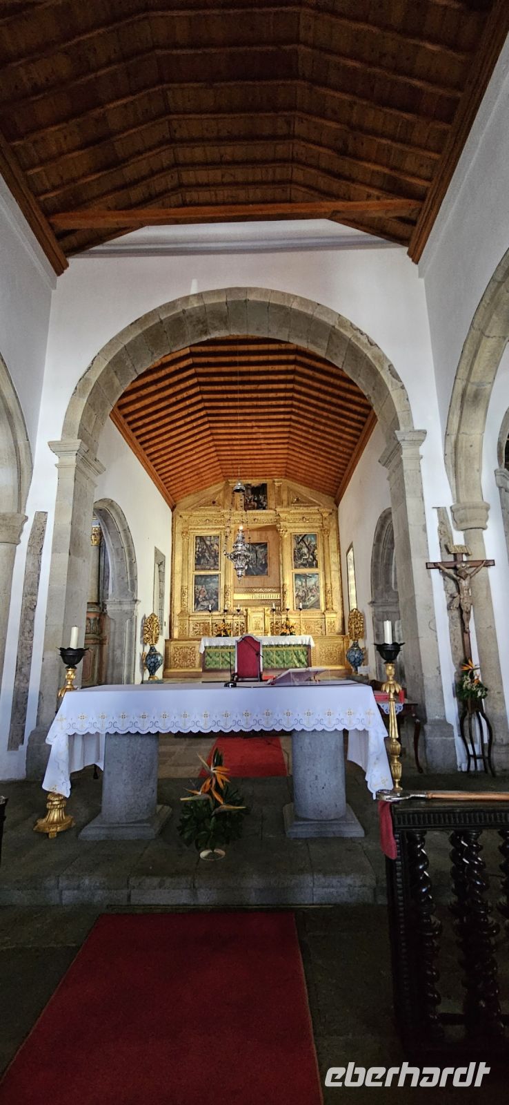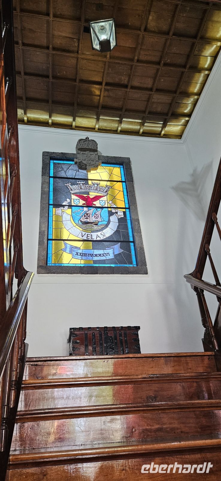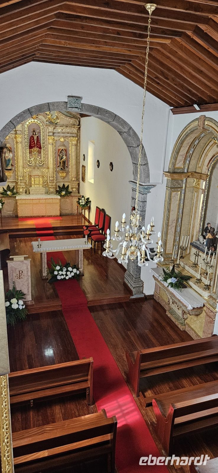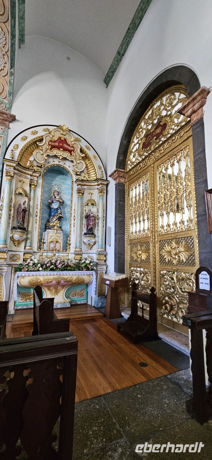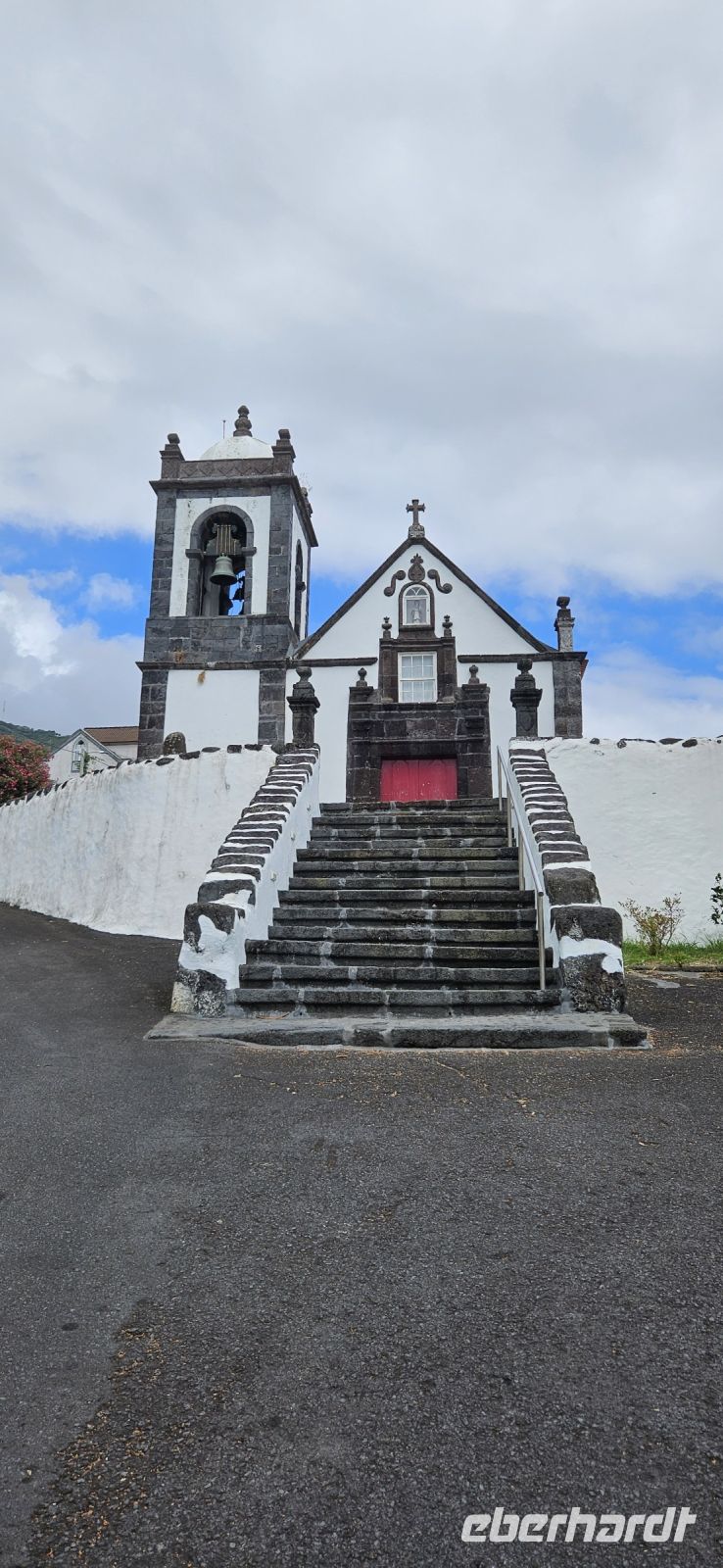 Der Tag begann mit einem grandiosen Frühstück in der Quinta dos Misterios und als Eva und ich oben ankamen, mussten wir auch noch von dem leckeren Kuchen probieren. Dann fuhren wir gut gestärkt zum Wanderausgangspunkt in der Faja dos Cubres. Es war wieder sehr warm und so begannen wir unser Tagesprogramm mit der Wanderung von der Faja dos Cubres zur Faja da Caldeira de Santo Cristo. Der gut ausgebaute Weg führt immer parallel zur Küste im ständigen Auf und Ab, mal im Schatten der Bäume, mal in der Sonne. Am Wegesrand stand der wilde Ingwer in voller Blüte und in der Faja de Santo Cristo kehrten wir kurz ein und besuchten die Pilgerkirche. Wieder zurück am Ausgangspunkt nahmen wir unsere Picknick Tüten aus dem Bus und stärkten uns. Das Picknick hatte man in der Busfirma sehr liebevoll zusammengestellt. Über die steile und serpentinenreiche Strasse fuhren wir wieder nach oben, machten am Aussichtspunkt einen Fotostopp und konnten von oben nochmals unseren Wanderweg verfolgen. Von der Nordküste der Insel Sao Jorge fuhren wir nun zur Südküste wieder über eine kurvenreiche kleine Strasse zur Faja dos Vimes. Dort betreibt die Familie Nunes seit 50 Jahren eine Kaffeeplantage mit ca. 1000 Kaffeepflanzen und "produziert" einen wohlschmeckenden Kaffee. In der kleinen Cafeteria durften wir ihn probieren und danach führte uns ein Mitarbeiter durch den Garten mit den Kaffeebäumen und Feigenbäumen. Zum Anwesen der Familie gehört auch eine Weberei, in der aus Naturmaterialien verschieden große Decken gewebt werden. Auch in der Quinta dos Misterios lag eine so große und wertvolle Tagesdecke aus der Weberei Nunes auf einem Bett. Auf der Rückfahrt machten wir Stopp in Manadas und dort besuchten wir die Kirche der Heiligen Barbara. Dieses Kleinod stammt aus dem Jahr 1770 und ist im azorianischen Barock erbaut. Die Kirche ist aufwendig verziert und vergoldet und die Kassettendecke aus Zedernholz ist etwas ganz besonderes. Auf den Azulejos ist die tragische Geschichte der Heiligen Barbara dargestellt. Wir erlebten eine ausführliche Kirchenführung durch einen Mitarbeiter und Eva übersetzte für uns. Nun folgte noch die Besichtigung des alten Kirchturmes in Urzulina. Er blieb nach einem Erdbeben mit Erdrutsch als einziges Baudenkmal in Urzulina noch erhalten. Zum gemeinsamen Abendessen trafen wir uns im Restaurant der Cantinha das Buganvilias. Dort saßen wir draussen auf der Terrasse mit Blick zum Pico und auf Velas und wir genossen das gute Abendessen und einen traumhaften Sonnenuntergang.