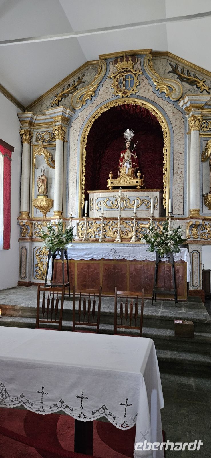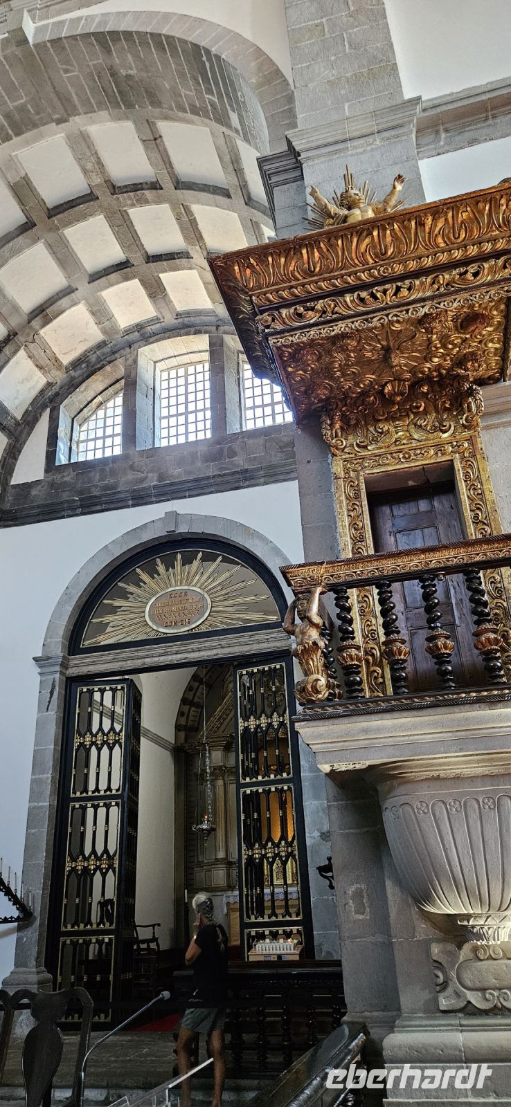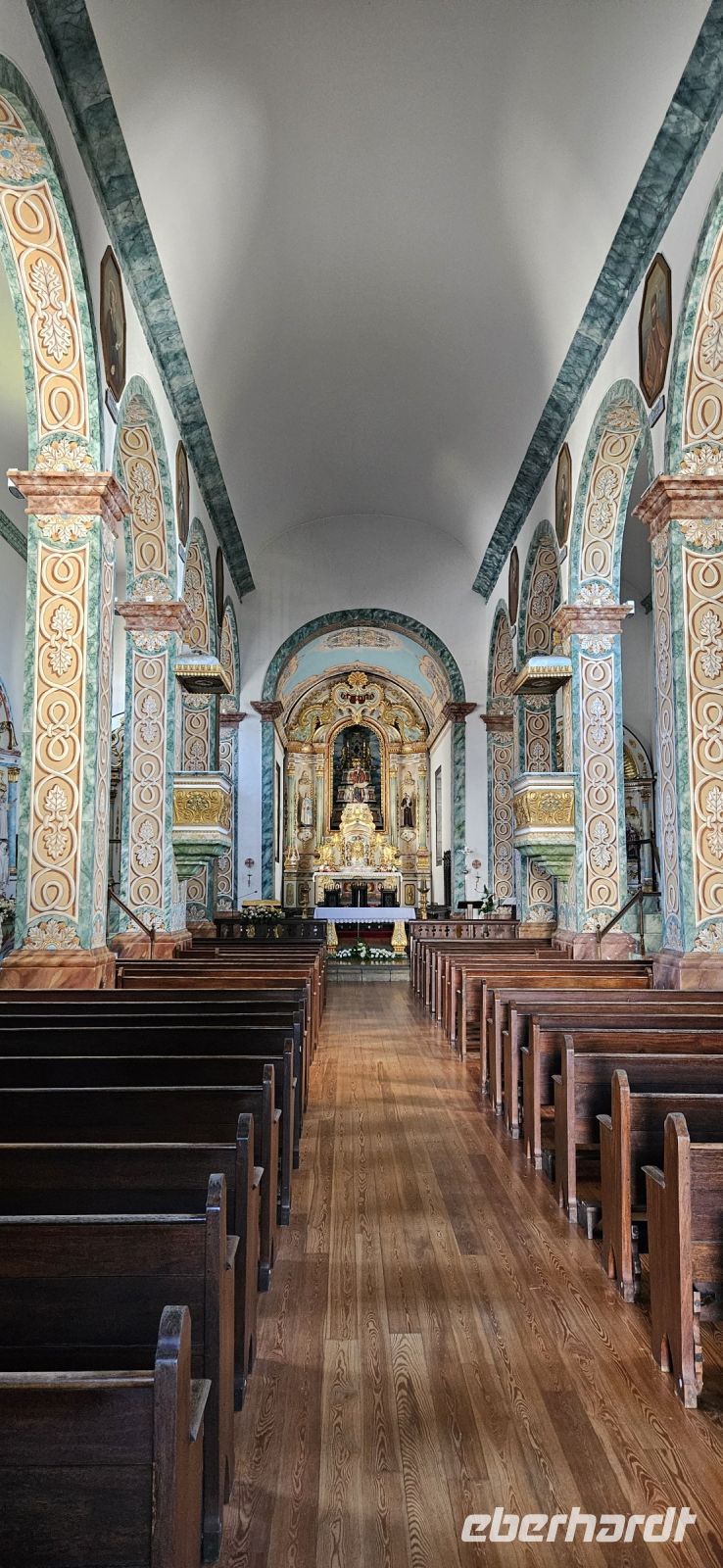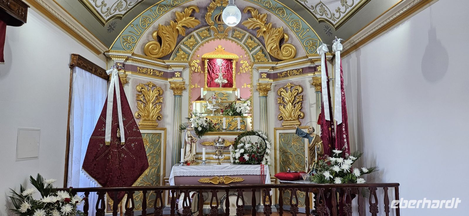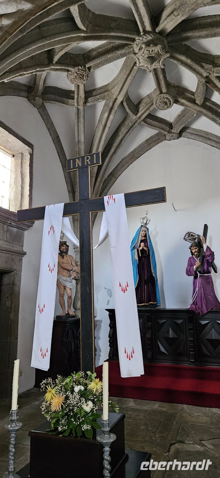 Der Tag begann mit einem grandiosen Frühstück in der Quinta dos Misterios und als Eva und ich oben ankamen, mussten wir auch noch von dem leckeren Kuchen probieren. Dann fuhren wir gut gestärkt zum Wanderausgangspunkt in der Faja dos Cubres. Es war wieder sehr warm und so begannen wir unser Tagesprogramm mit der Wanderung von der Faja dos Cubres zur Faja da Caldeira de Santo Cristo. Der gut ausgebaute Weg führt immer parallel zur Küste im ständigen Auf und Ab, mal im Schatten der Bäume, mal in der Sonne. Am Wegesrand stand der wilde Ingwer in voller Blüte und in der Faja de Santo Cristo kehrten wir kurz ein und besuchten die Pilgerkirche. Wieder zurück am Ausgangspunkt nahmen wir unsere Picknick Tüten aus dem Bus und stärkten uns. Das Picknick hatte man in der Busfirma sehr liebevoll zusammengestellt. Über die steile und serpentinenreiche Strasse fuhren wir wieder nach oben, machten am Aussichtspunkt einen Fotostopp und konnten von oben nochmals unseren Wanderweg verfolgen. Von der Nordküste der Insel Sao Jorge fuhren wir nun zur Südküste wieder über eine kurvenreiche kleine Strasse zur Faja dos Vimes. Dort betreibt die Familie Nunes seit 50 Jahren eine Kaffeeplantage mit ca. 1000 Kaffeepflanzen und "produziert" einen wohlschmeckenden Kaffee. In der kleinen Cafeteria durften wir ihn probieren und danach führte uns ein Mitarbeiter durch den Garten mit den Kaffeebäumen und Feigenbäumen. Zum Anwesen der Familie gehört auch eine Weberei, in der aus Naturmaterialien verschieden große Decken gewebt werden. Auch in der Quinta dos Misterios lag eine so große und wertvolle Tagesdecke aus der Weberei Nunes auf einem Bett. Auf der Rückfahrt machten wir Stopp in Manadas und dort besuchten wir die Kirche der Heiligen Barbara. Dieses Kleinod stammt aus dem Jahr 1770 und ist im azorianischen Barock erbaut. Die Kirche ist aufwendig verziert und vergoldet und die Kassettendecke aus Zedernholz ist etwas ganz besonderes. Auf den Azulejos ist die tragische Geschichte der Heiligen Barbara dargestellt. Wir erlebten eine ausführliche Kirchenführung durch einen Mitarbeiter und Eva übersetzte für uns. Nun folgte noch die Besichtigung des alten Kirchturmes in Urzulina. Er blieb nach einem Erdbeben mit Erdrutsch als einziges Baudenkmal in Urzulina noch erhalten. Zum gemeinsamen Abendessen trafen wir uns im Restaurant der Cantinha das Buganvilias. Dort saßen wir draussen auf der Terrasse mit Blick zum Pico und auf Velas und wir genossen das gute Abendessen und einen traumhaften Sonnenuntergang.