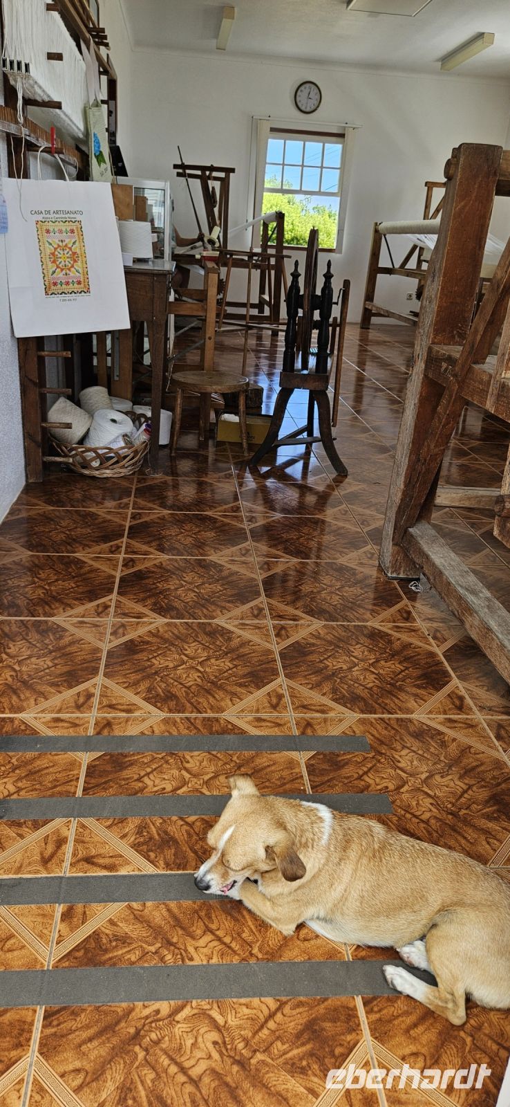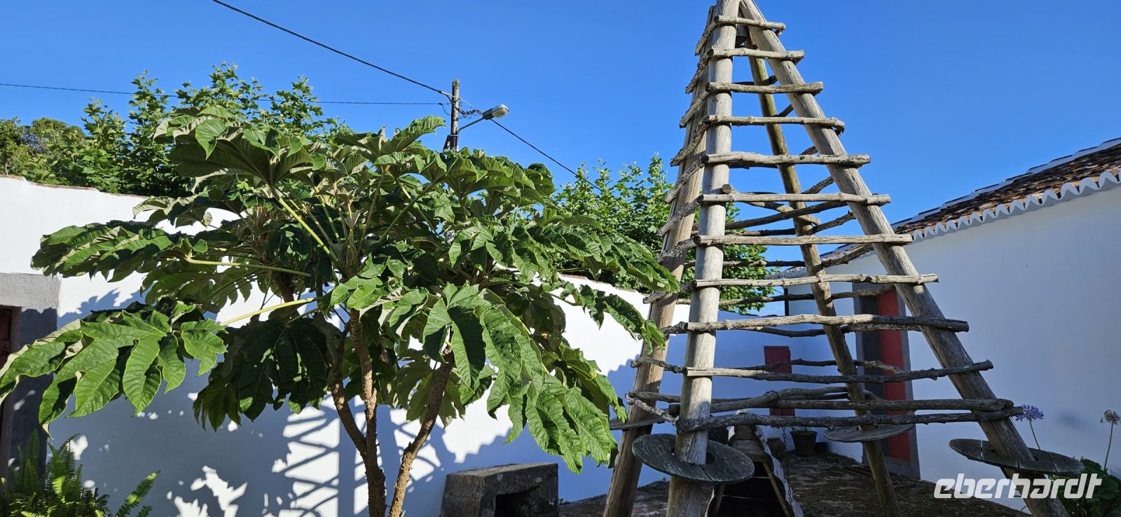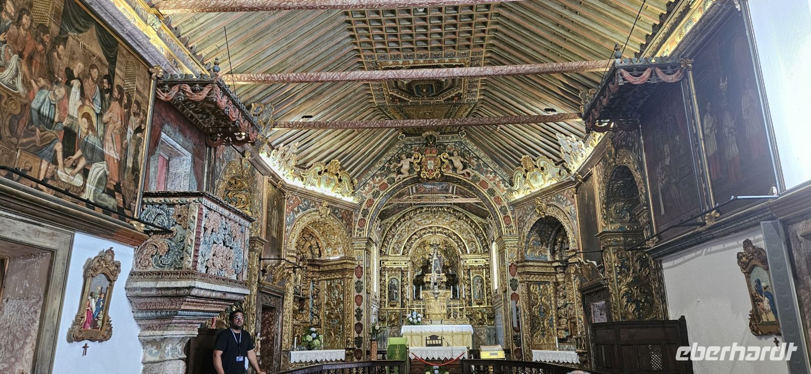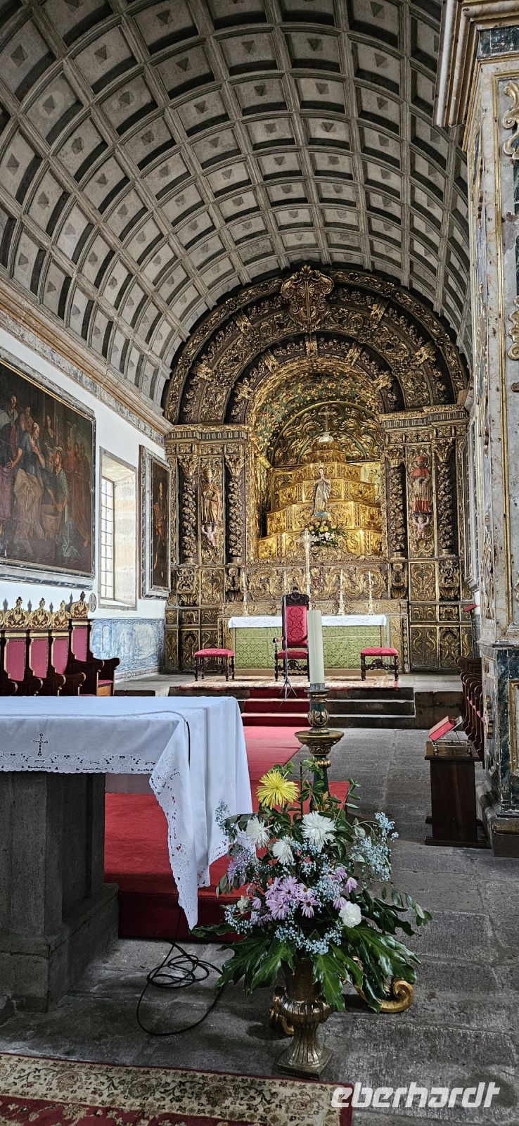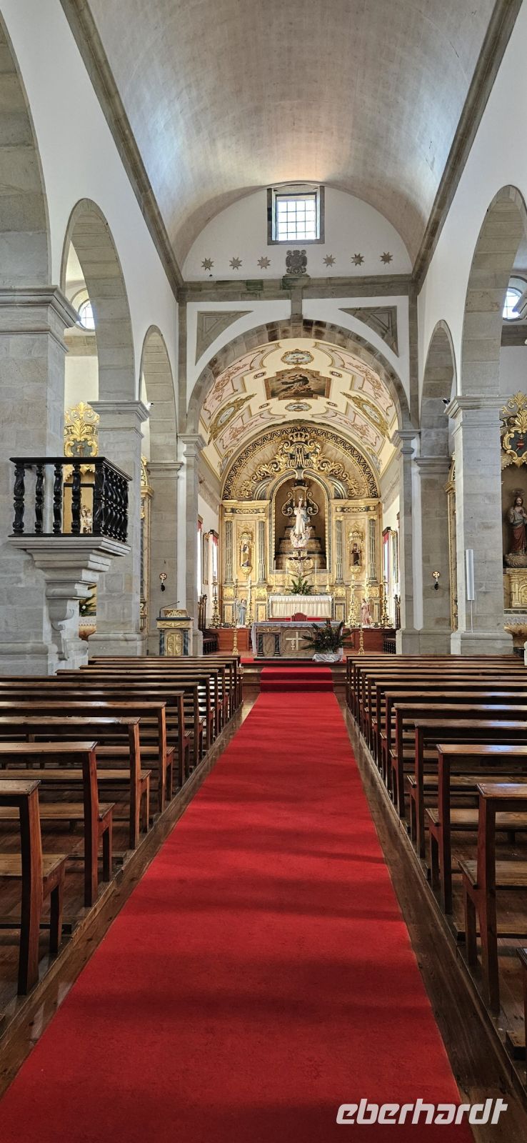 Der Tag begann mit einem grandiosen Frühstück in der Quinta dos Misterios und als Eva und ich oben ankamen, mussten wir auch noch von dem leckeren Kuchen probieren. Dann fuhren wir gut gestärkt zum Wanderausgangspunkt in der Faja dos Cubres. Es war wieder sehr warm und so begannen wir unser Tagesprogramm mit der Wanderung von der Faja dos Cubres zur Faja da Caldeira de Santo Cristo. Der gut ausgebaute Weg führt immer parallel zur Küste im ständigen Auf und Ab, mal im Schatten der Bäume, mal in der Sonne. Am Wegesrand stand der wilde Ingwer in voller Blüte und in der Faja de Santo Cristo kehrten wir kurz ein und besuchten die Pilgerkirche. Wieder zurück am Ausgangspunkt nahmen wir unsere Picknick Tüten aus dem Bus und stärkten uns. Das Picknick hatte man in der Busfirma sehr liebevoll zusammengestellt. Über die steile und serpentinenreiche Strasse fuhren wir wieder nach oben, machten am Aussichtspunkt einen Fotostopp und konnten von oben nochmals unseren Wanderweg verfolgen. Von der Nordküste der Insel Sao Jorge fuhren wir nun zur Südküste wieder über eine kurvenreiche kleine Strasse zur Faja dos Vimes. Dort betreibt die Familie Nunes seit 50 Jahren eine Kaffeeplantage mit ca. 1000 Kaffeepflanzen und "produziert" einen wohlschmeckenden Kaffee. In der kleinen Cafeteria durften wir ihn probieren und danach führte uns ein Mitarbeiter durch den Garten mit den Kaffeebäumen und Feigenbäumen. Zum Anwesen der Familie gehört auch eine Weberei, in der aus Naturmaterialien verschieden große Decken gewebt werden. Auch in der Quinta dos Misterios lag eine so große und wertvolle Tagesdecke aus der Weberei Nunes auf einem Bett. Auf der Rückfahrt machten wir Stopp in Manadas und dort besuchten wir die Kirche der Heiligen Barbara. Dieses Kleinod stammt aus dem Jahr 1770 und ist im azorianischen Barock erbaut. Die Kirche ist aufwendig verziert und vergoldet und die Kassettendecke aus Zedernholz ist etwas ganz besonderes. Auf den Azulejos ist die tragische Geschichte der Heiligen Barbara dargestellt. Wir erlebten eine ausführliche Kirchenführung durch einen Mitarbeiter und Eva übersetzte für uns. Nun folgte noch die Besichtigung des alten Kirchturmes in Urzulina. Er blieb nach einem Erdbeben mit Erdrutsch als einziges Baudenkmal in Urzulina noch erhalten. Zum gemeinsamen Abendessen trafen wir uns im Restaurant der Cantinha das Buganvilias. Dort saßen wir draussen auf der Terrasse mit Blick zum Pico und auf Velas und wir genossen das gute Abendessen und einen traumhaften Sonnenuntergang.