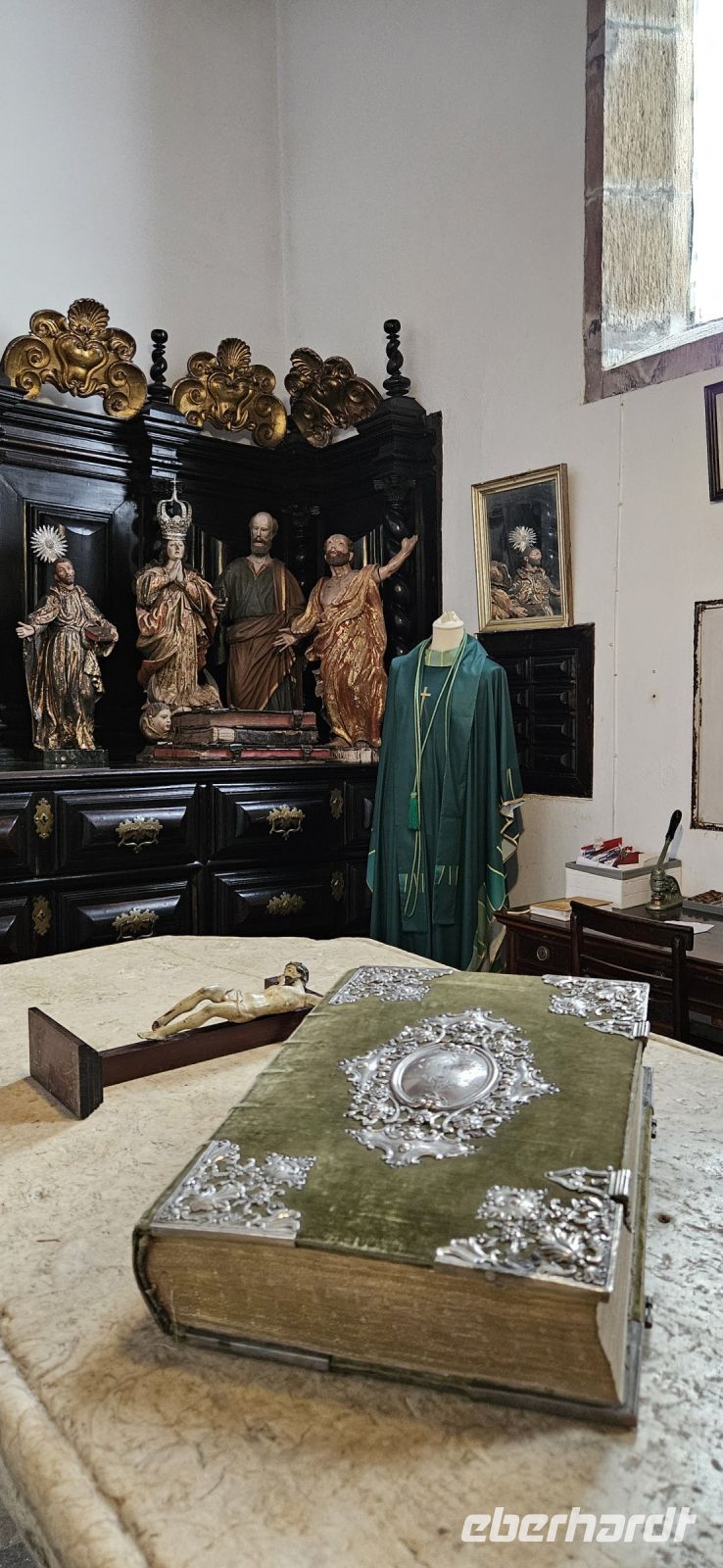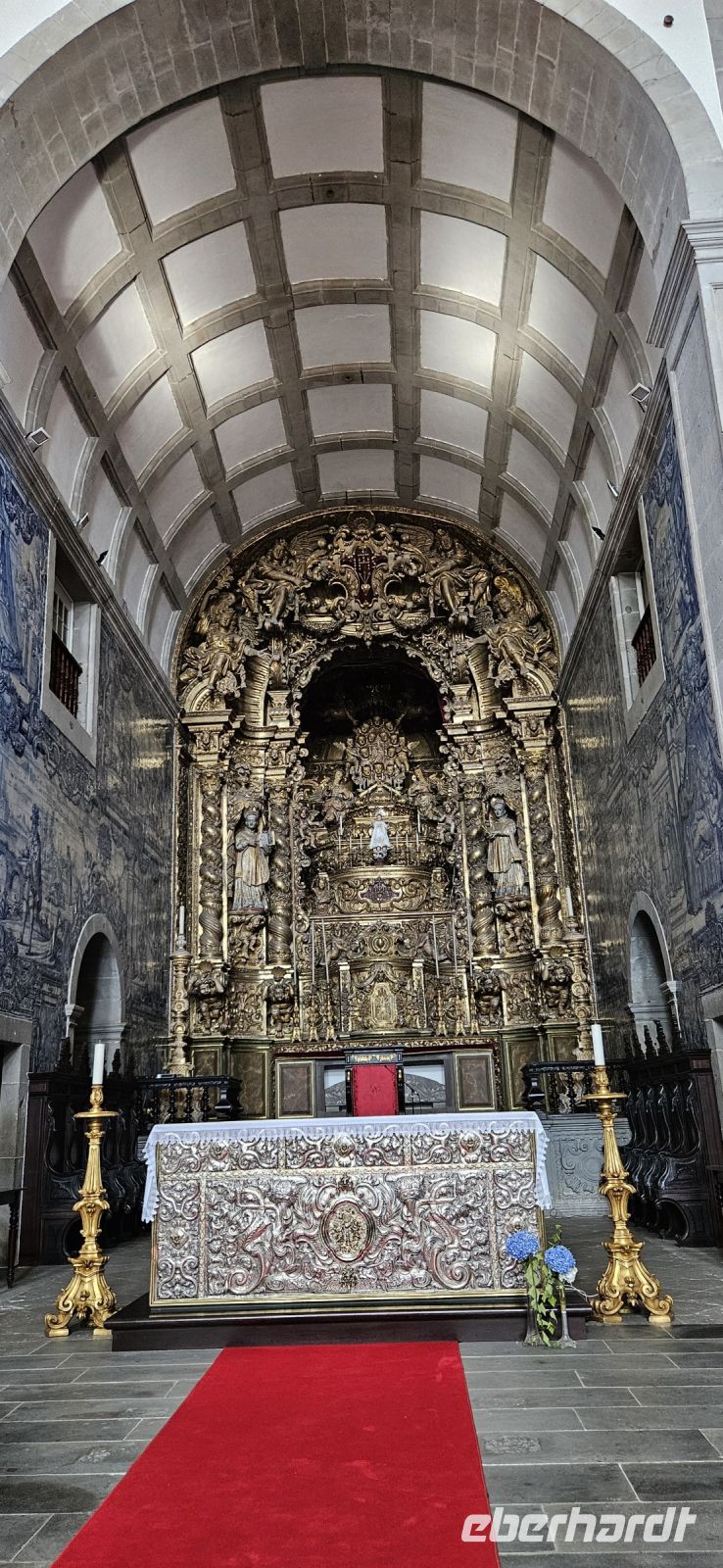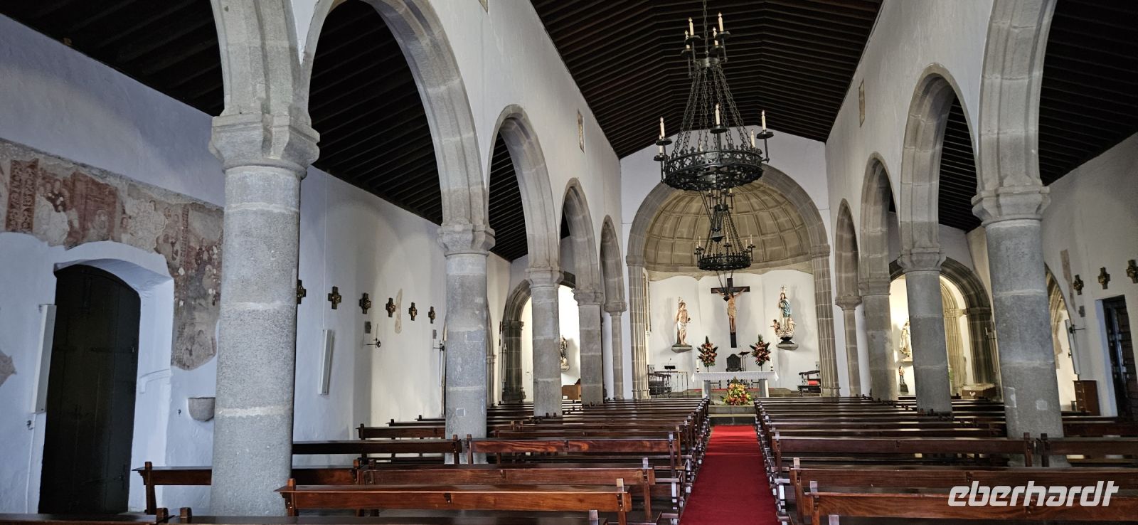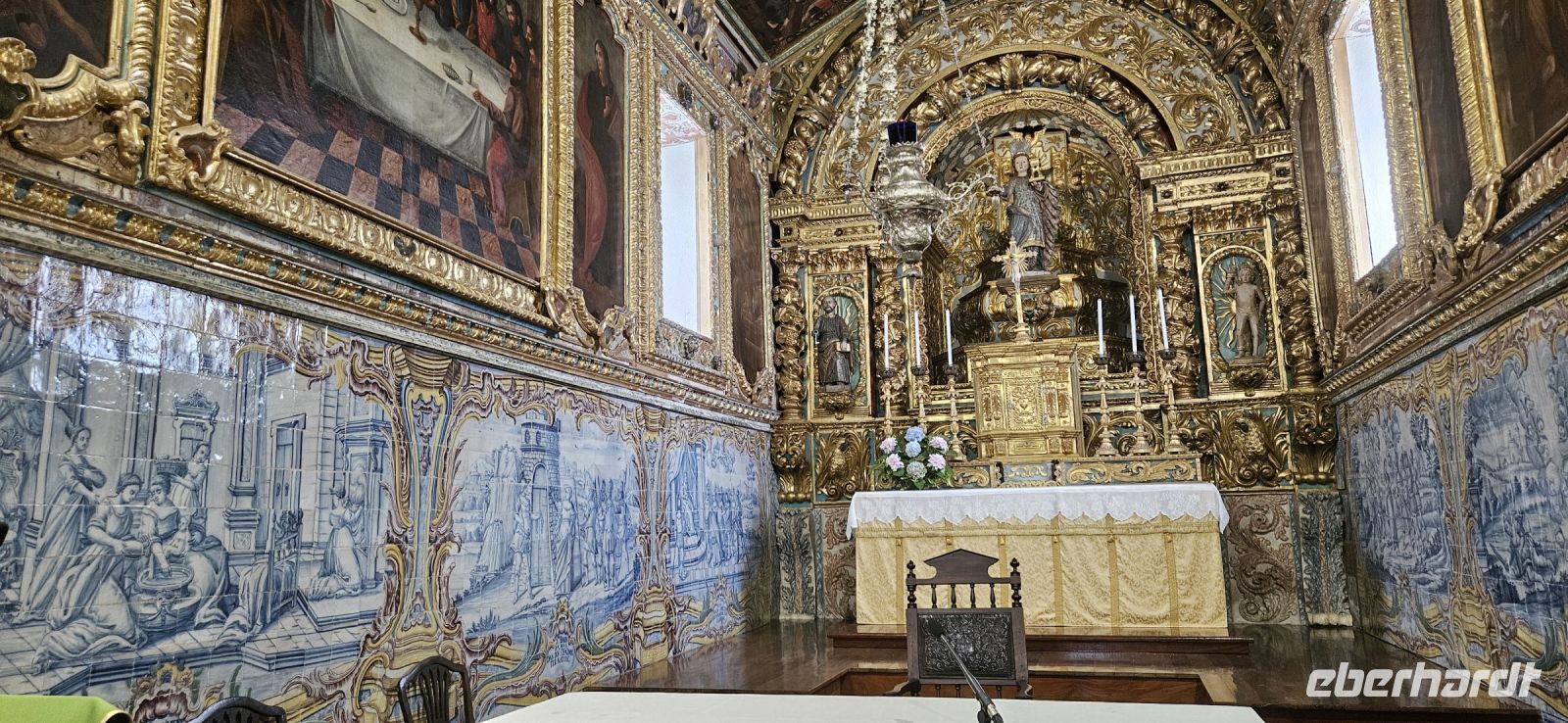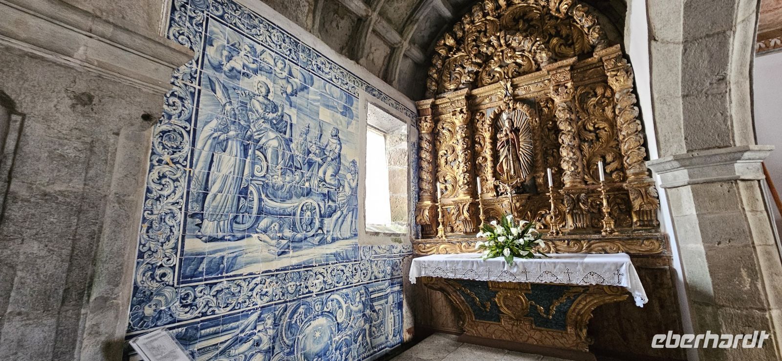 Der Tag begann mit einem grandiosen Frühstück in der Quinta dos Misterios und als Eva und ich oben ankamen, mussten wir auch noch von dem leckeren Kuchen probieren. Dann fuhren wir gut gestärkt zum Wanderausgangspunkt in der Faja dos Cubres. Es war wieder sehr warm und so begannen wir unser Tagesprogramm mit der Wanderung von der Faja dos Cubres zur Faja da Caldeira de Santo Cristo. Der gut ausgebaute Weg führt immer parallel zur Küste im ständigen Auf und Ab, mal im Schatten der Bäume, mal in der Sonne. Am Wegesrand stand der wilde Ingwer in voller Blüte und in der Faja de Santo Cristo kehrten wir kurz ein und besuchten die Pilgerkirche. Wieder zurück am Ausgangspunkt nahmen wir unsere Picknick Tüten aus dem Bus und stärkten uns. Das Picknick hatte man in der Busfirma sehr liebevoll zusammengestellt. Über die steile und serpentinenreiche Strasse fuhren wir wieder nach oben, machten am Aussichtspunkt einen Fotostopp und konnten von oben nochmals unseren Wanderweg verfolgen. Von der Nordküste der Insel Sao Jorge fuhren wir nun zur Südküste wieder über eine kurvenreiche kleine Strasse zur Faja dos Vimes. Dort betreibt die Familie Nunes seit 50 Jahren eine Kaffeeplantage mit ca. 1000 Kaffeepflanzen und "produziert" einen wohlschmeckenden Kaffee. In der kleinen Cafeteria durften wir ihn probieren und danach führte uns ein Mitarbeiter durch den Garten mit den Kaffeebäumen und Feigenbäumen. Zum Anwesen der Familie gehört auch eine Weberei, in der aus Naturmaterialien verschieden große Decken gewebt werden. Auch in der Quinta dos Misterios lag eine so große und wertvolle Tagesdecke aus der Weberei Nunes auf einem Bett. Auf der Rückfahrt machten wir Stopp in Manadas und dort besuchten wir die Kirche der Heiligen Barbara. Dieses Kleinod stammt aus dem Jahr 1770 und ist im azorianischen Barock erbaut. Die Kirche ist aufwendig verziert und vergoldet und die Kassettendecke aus Zedernholz ist etwas ganz besonderes. Auf den Azulejos ist die tragische Geschichte der Heiligen Barbara dargestellt. Wir erlebten eine ausführliche Kirchenführung durch einen Mitarbeiter und Eva übersetzte für uns. Nun folgte noch die Besichtigung des alten Kirchturmes in Urzulina. Er blieb nach einem Erdbeben mit Erdrutsch als einziges Baudenkmal in Urzulina noch erhalten. Zum gemeinsamen Abendessen trafen wir uns im Restaurant der Cantinha das Buganvilias. Dort saßen wir draussen auf der Terrasse mit Blick zum Pico und auf Velas und wir genossen das gute Abendessen und einen traumhaften Sonnenuntergang.