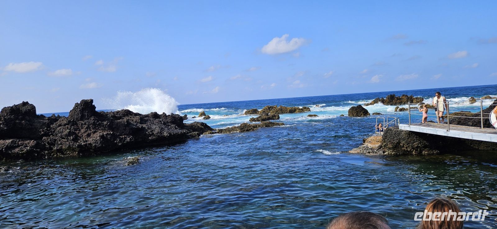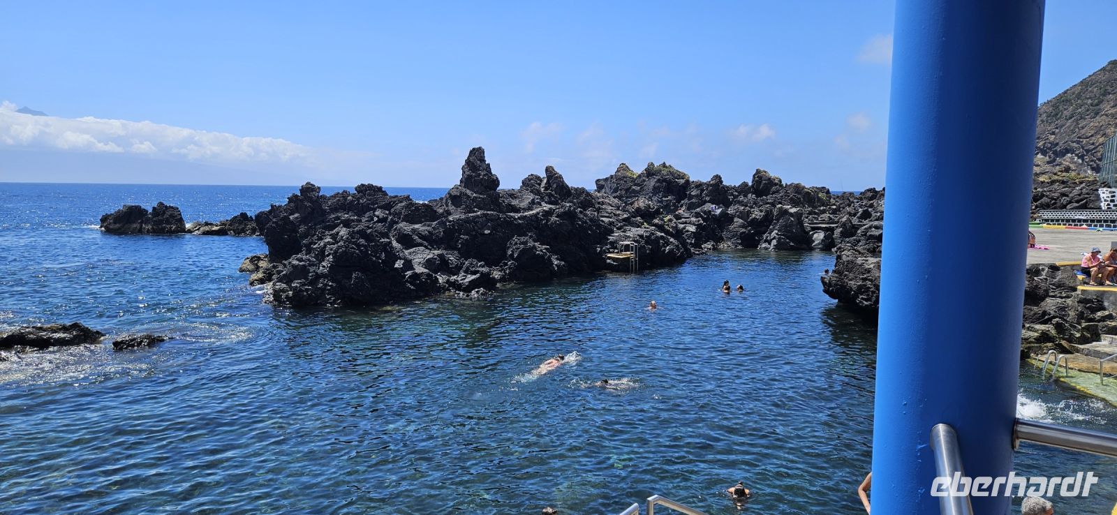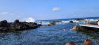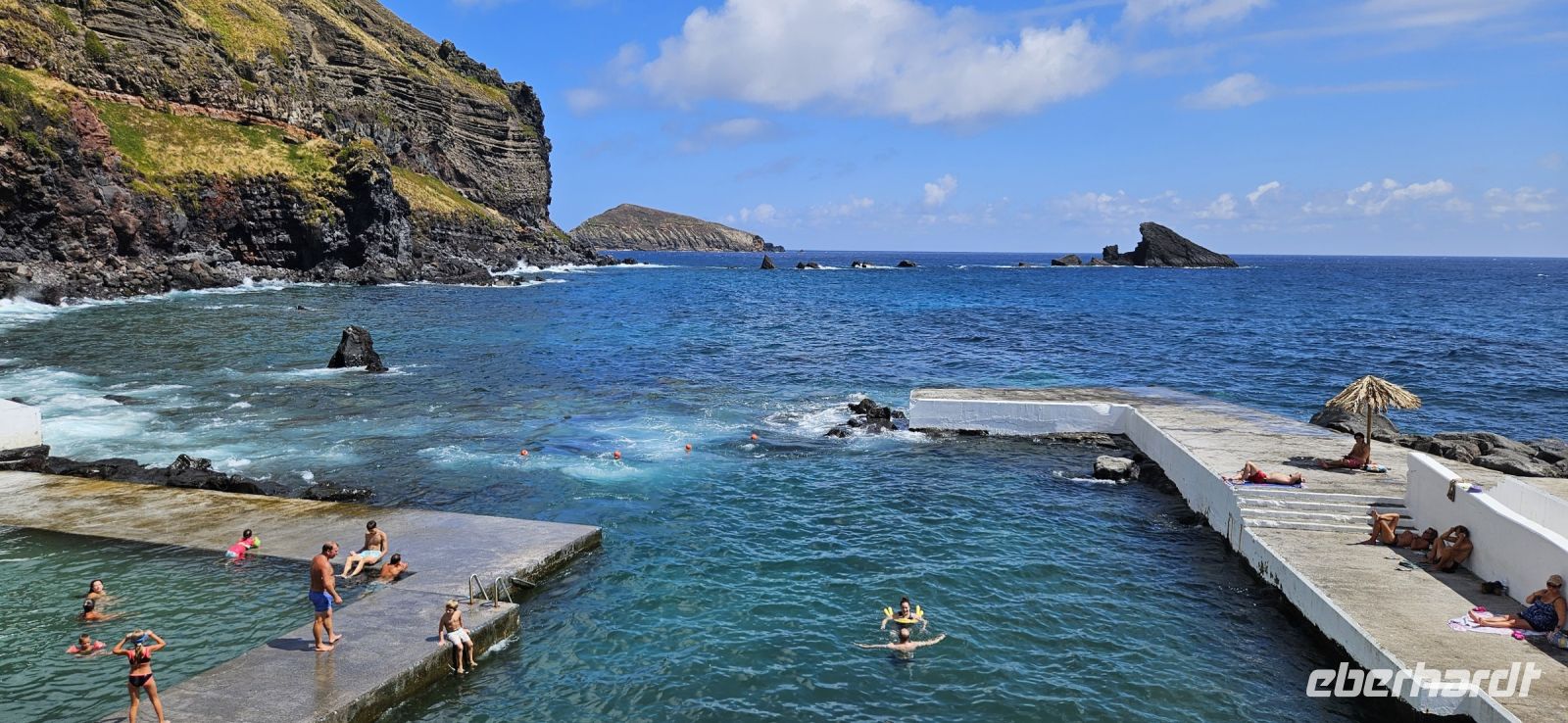 Heute durften wir länger schlafen und starteten erst 9 Uhr mit dem Bus. Bei bestem Wanderwetter und guter Sicht wanderten wir durch die Weingärten der Insel Pico und hatten eine wunderbare Sicht hinüber zur Insel Faial mit dem Hauptort Horta. Die ersten Weintrauben waren schon reif und ich kaufte einer netten Damen in der Windmühle eine Tüte zum Probieren für alle ab. Die blauen Weintrauben waren süss und sehr saftig und schmeckten nach "mehr". Nach der Wanderung brachte uns der Bus nach Madalena zum Mittagessen im Restaurant Arruda. Gut gestärkt fuhren wir danach zur Nordküste der Insel Pico und besuchten den interessanten Küstenabschnitt von Cacharro, was übersetzt "kleines Hündchen" bedeutet. Und tatsächlich ist im Lavagestein ein Hund zu erkennen. Daneben rollte man die Weinfässer über die "Rollo Pipas" hinunter zu den Booten im Meer. Unweit der Lavaformationen besuchten wir das Vulkanmuseum mit einer tollen Präsentation über die Vorgänge im Erdinneren und eine Simulation von 2 Erdbeben auf den Azoren. Das war sehr eindrücklich und Gott sei Dank nicht die Wirklichkeit. Neben dem Vulkanmuseum war noch eine Schnapsbrennerei, ein Gezeitenbrunnen und ein kleines Weinmuseum zu besichtigen. Unterwegs in Santo Antonio legten wir eine Badepause ein. Ein großer Pool gefüllt mit Meerwasser und eine fantastische Bucht, wo man sicher im Atlantik schwimmen konnte, machten das Badevergnügen perfekt. All diese Einrichtungen, wozu natürlich auch Umkleidekabinen, Duschen und Toiletten gehören, sind auf den Azoren kostenlos zu nutzen und das begeisterte unsere Teilnehmer immer wieder. Am späten Nachmittag erreichten wir die Adega a Buraca und da bekamen wir reichlich Hauswein und eine Probe von 2 guten Jahrgangsweissweinen. Reichlich Käse von den Azoren, Wurst und 2 Sorten Brot ersetzten uns das Abendessen.