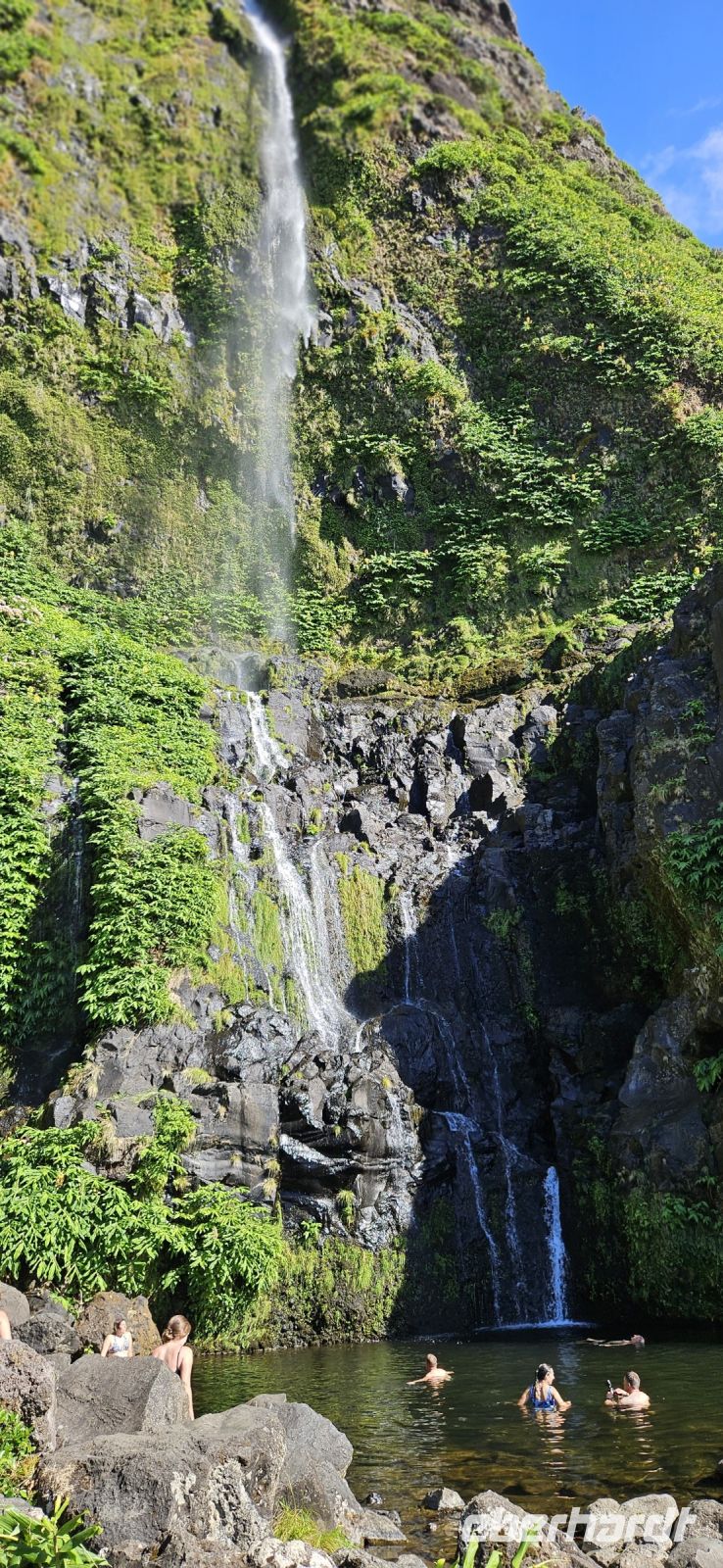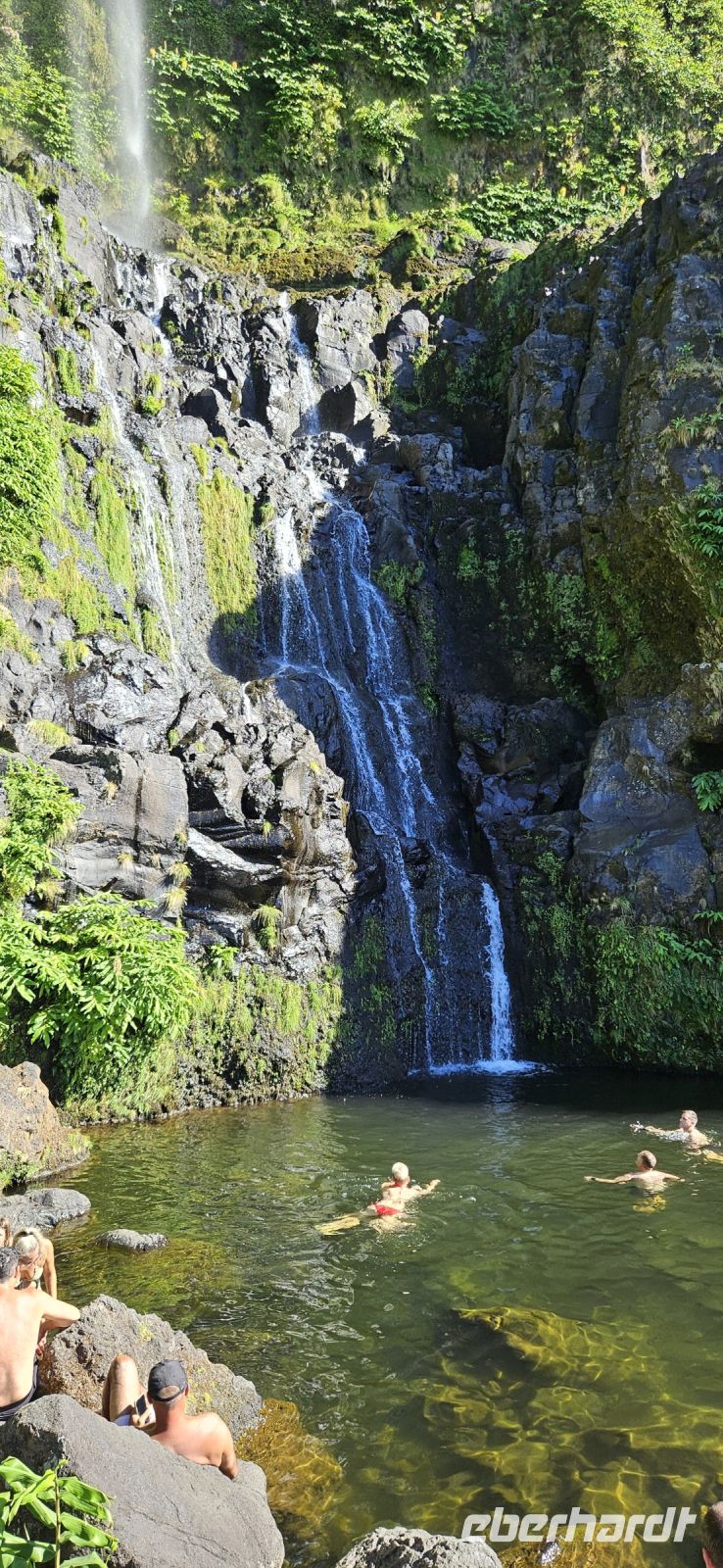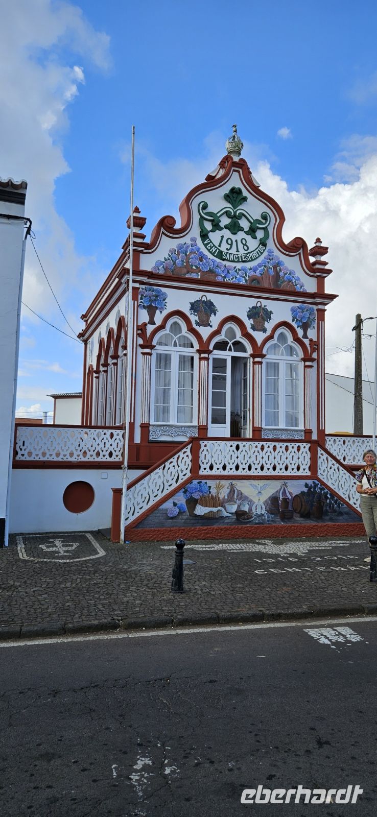 Es war wieder sehr warmes Wetter vorher gesagt und so begannen wir den Tag ganz entspannt und trafen uns 10 Uhr zur Besichtigung des Walmuseums in der ehemaligen Walfabrik, gegenüber von unserem Hotel. Dieses Museum zeigt neben dem Walfang vor allem die Weiterverarbeitung dieser riesigen Tiere und das sehr anschaulich mit den noch vorhandenen Arbeitsmitteln und Geräten. Nach dem Besuch legten wir eine Badepause am Hotelpool oder den Meerwasserpools ein und 13.30 Uhr begann unsere Inselrundfahrt mit 2 Kleinbussen und einem Taxi von der Experience Agentur der Insel. An diesem Tag hatten wir absolutes Glück mit dem Wetter und so sahen wir den Schwarzen und den Langen See bei herrlichem Sonnenschein. Eva schlug deshalb vor, das kurze Stück zur Lagoa Seca zu Fuss zu gehen und so hatten wir unterwegs auch noch die vielfältige Flora ganz aus der Nähe und super zum Fotografieren. Vom Mirador Ponta de Vista sahen wir die Westküste vor uns liegen und dorthin führte unsere Fahrt. Wir wanderten zu den Wasserfällen Poco da Ribeira und auch dort gab es keine Wolken sondern beste Sicht. Wieder zurück gab es eine Azoren Ananas von der Hauptinsel Sao Miguel und die hatten unsere 3 Fahrer meisterlich in Szene gesetzt und mit den Blüten vom wilden Ingwer verziert. Danke für diese Überraschgung ! Wir fuhren weiter die Westküste entlang bis zur Faja Grande und dort gönnten wir uns eine Trink- und Eispause. Danach spazierten wir zum nahe gelegenen Wasserfall Poco da Bacalhau und im See direkt am Wasserfall nahm eine Dame unserer Gruppe ein Bad. Nun fehlte auf unserer Besichtigungs "Liste" noch der Basaltfelsen Rocha dos Bordeos und auch der war bilderbuchhaft zu sehen und zu fotografieren. Auf der Rückfahrt über das Hochland besuchten wir noch die beiden Lagoas - Funda E Rasa und Caldeira Rasa. Damit hatten wir in kürzester Zeit alle Highligts der Insel Flores kennengelernt. Zurück im Hotel gönnten wir uns eine kleine Erfrischungspause und dann gings zum Heiliggeistfest.
