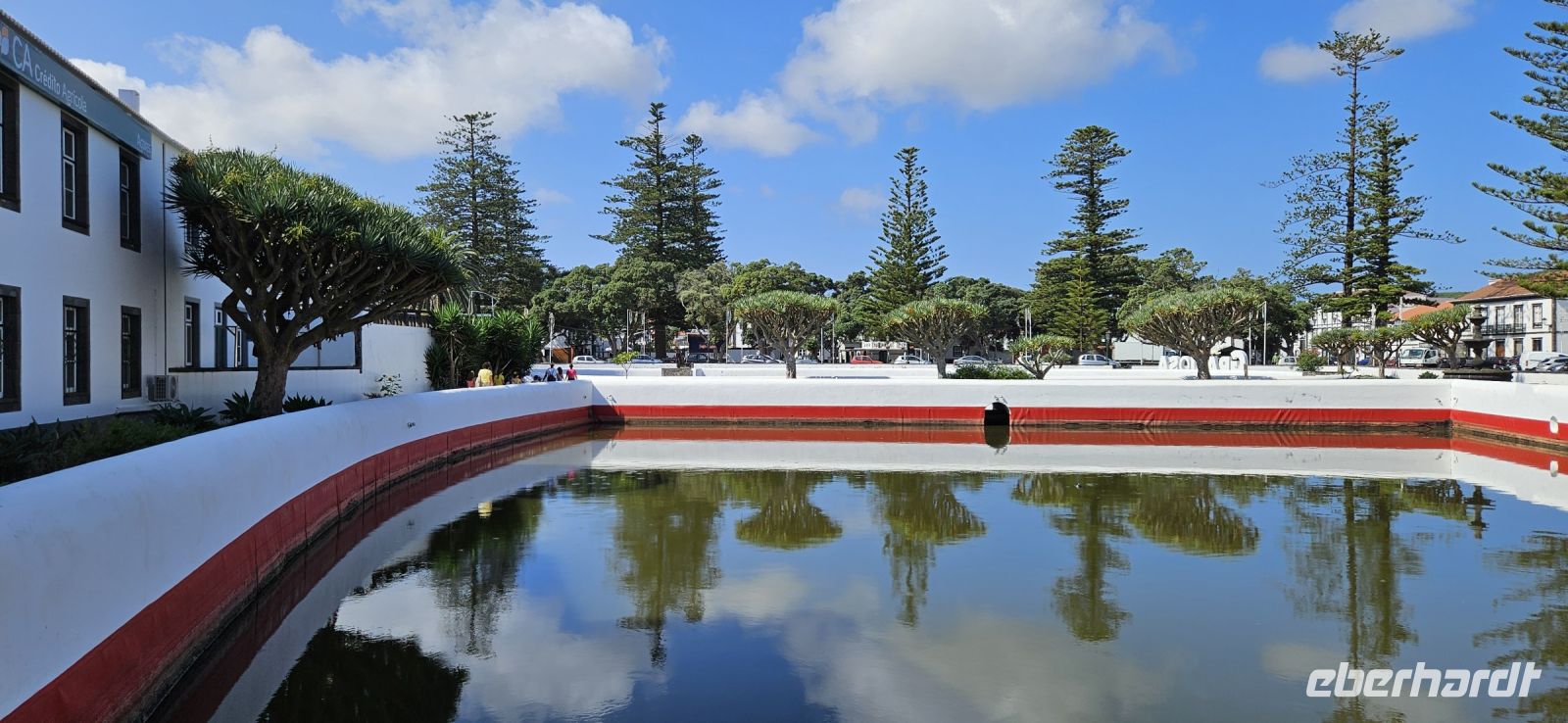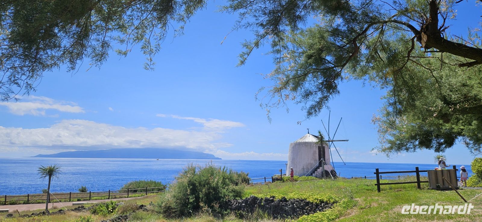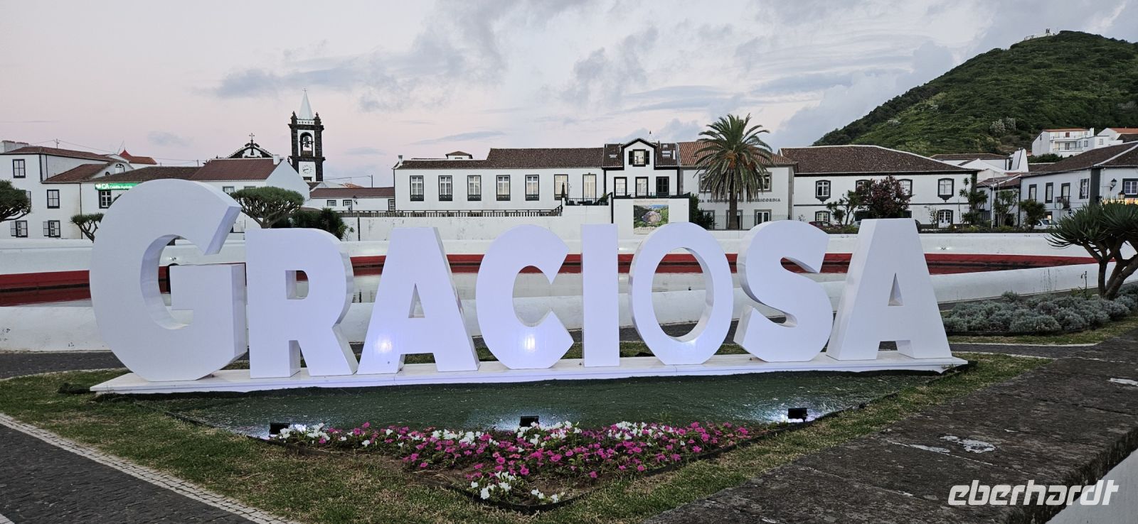 Es stand wieder ein Inselwechsel an und so fuhren wir zum Flughafen von Terceira, verabschiedeten uns von Marisa und Jose Manuel für 2 Tage und trafen im Sicherheitsbereich des Flughafens Eva wieder. Gemeinsam flogen wir von Terceira nach Graciosa und wurden dort von Fahrer Antonio empfangen. Wir brachten unsere Koffer ins Hotel und gingen zu Fuss ins Zentrum von Santa Cruz da Graciosa. Wir besichtigten die beiden Kirchen im Stadtzentrum und nahmen dann unser vorbestelltes Mittagessen im Freien unter den großen Neuseeländischen Eisenholzbäumen ein. Ab 14 Uhr stand der Bus wieder bereit und brachte uns hinauf auf den "Hausberg" von wo wir eine gute Sicht auf Santa Cruz, unser Hotel und die davor liegende Marina hatten. Wir spazierten hinunter zur Stierkampfarena, wo erst vor Kurzem ein Kampf stattfand. Mit dem Bus ging es dann weiter vorbei am Flughafen zum Leuchtturm Ponta da Barca und den konnten wir besteigen und die Sicht auf die schroffe Küste mit dem "Wal" geniessen. Für unseren ersten Tag auf Graciosa hatten wir uns das Erkunden der Westküste vorgenommen und so folgte die Fahrt hinauf zur Caldeirinha und diese kleine Caldeira umrundeten wir zu Fuss. Danach brachte der Bus uns zurück ins Hotel. Wir checkten ein und genossen den Rest des Tages am Pool der Hotels oder beim Baden im Meer.,
