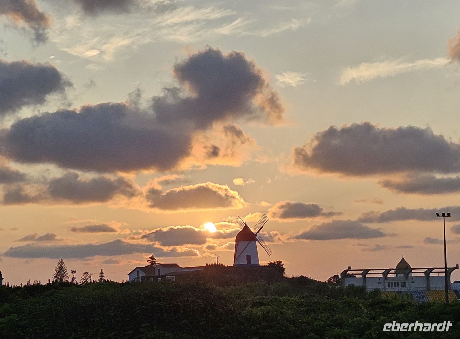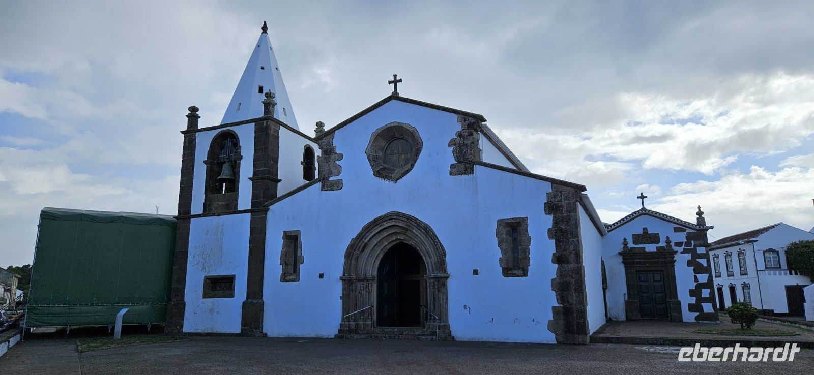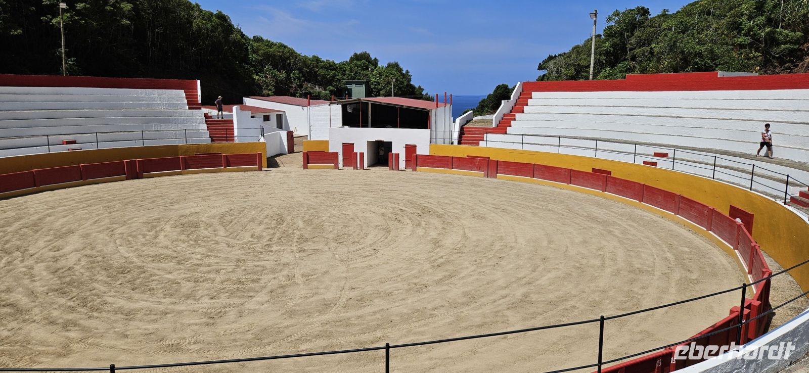 Es stand wieder ein Inselwechsel an und so fuhren wir zum Flughafen von Terceira, verabschiedeten uns von Marisa und Jose Manuel für 2 Tage und trafen im Sicherheitsbereich des Flughafens Eva wieder. Gemeinsam flogen wir von Terceira nach Graciosa und wurden dort von Fahrer Antonio empfangen. Wir brachten unsere Koffer ins Hotel und gingen zu Fuss ins Zentrum von Santa Cruz da Graciosa. Wir besichtigten die beiden Kirchen im Stadtzentrum und nahmen dann unser vorbestelltes Mittagessen im Freien unter den großen Neuseeländischen Eisenholzbäumen ein. Ab 14 Uhr stand der Bus wieder bereit und brachte uns hinauf auf den "Hausberg" von wo wir eine gute Sicht auf Santa Cruz, unser Hotel und die davor liegende Marina hatten. Wir spazierten hinunter zur Stierkampfarena, wo erst vor Kurzem ein Kampf stattfand. Mit dem Bus ging es dann weiter vorbei am Flughafen zum Leuchtturm Ponta da Barca und den konnten wir besteigen und die Sicht auf die schroffe Küste mit dem "Wal" geniessen. Für unseren ersten Tag auf Graciosa hatten wir uns das Erkunden der Westküste vorgenommen und so folgte die Fahrt hinauf zur Caldeirinha und diese kleine Caldeira umrundeten wir zu Fuss. Danach brachte der Bus uns zurück ins Hotel. Wir checkten ein und genossen den Rest des Tages am Pool der Hotels oder beim Baden im Meer.,