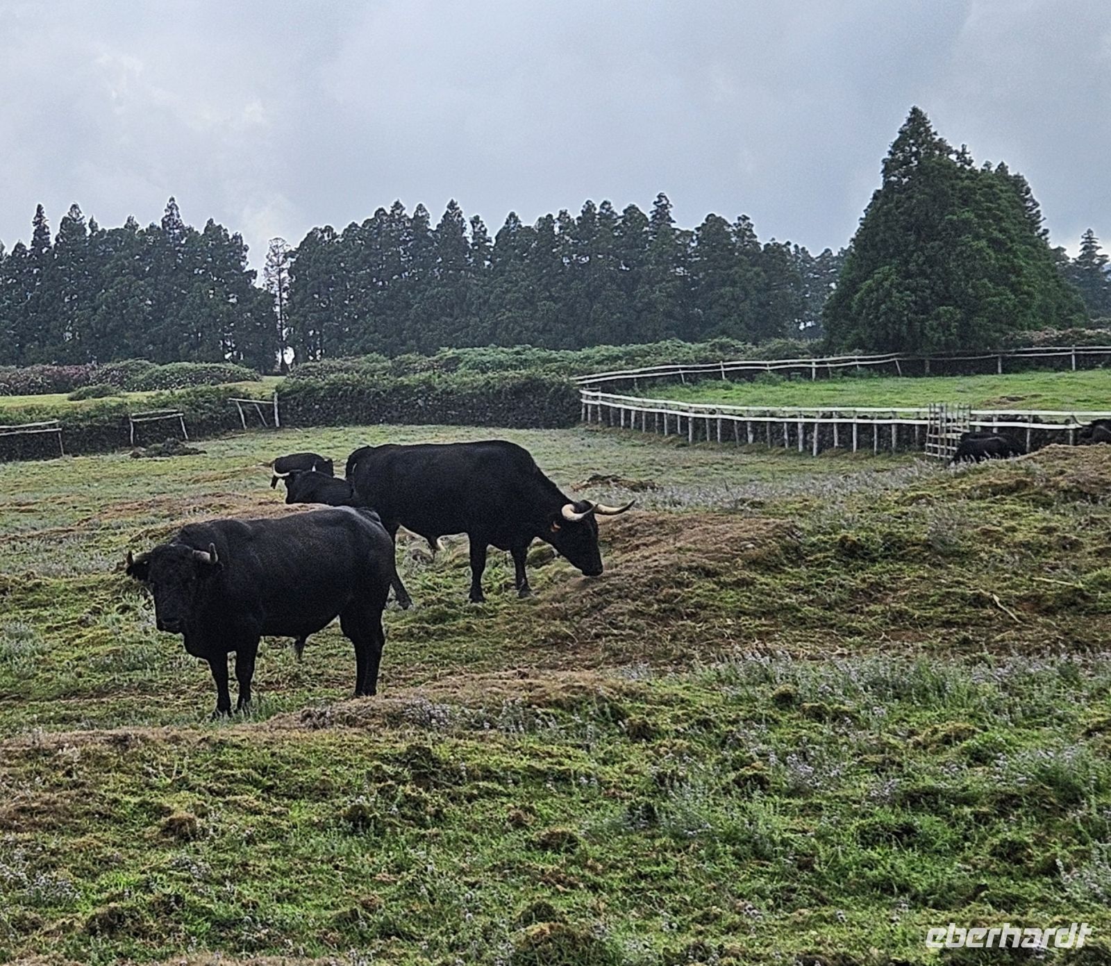 Mit unserem Bus fuhren wir zunächst auf den Monte Brasil, um die tolle Aussicht auf Angra und auf den Santa Barbara Krater - höchste Erhebung der Insel Terceira mit 1021 m Höhe - zu geniessen. Oben wurde plötzlich eine Geldbörse vermisst, die sich aber glücklicherweise im Hotelzimmer auf Nachfrage anfand. Nun konnte unsere Inselrundfahrt ganz entspannt starten. Unser nächster Halt war in Sao Sebastiao, wo wir die Heiliggeist Kapelle und die alte mit Fresken geschmückte Kirche uns ansahen. Weiter ging es über schmale Strassen zwischen Viehweiden hindurch hinauf zum Aussichtspunkt Serra do Cume auf 540 m Höhe. Von dort hatten wir trotz einiger Regentropfen eine gute Sicht in den riesigen Krater mit den 5605 - lt. unserem Fahrer Jose Manuel - kleinen und größeren Weideflächen. Man wartet hier sehnsüchtig auf Regen, denn die Weiden waren teilweise schon ausgetrocknet und das Vieh brauchte nun neben Wasser auch etwas zu Fressen. Im bergab Fahren hatten wir eine gute Sicht auf den Flughafen Lajes. Er ist der größte der Azoren Inseln und die Amerikaner unterhalten dort eine Militärbasis. Auch gibt es von Terceira Direktflüge in die USA und nach Kanada. Unser nächster Stopp war oberhalb von Praia da Vitoria mit guter Sicht auf die Stadt mit dem breiten Sandstrand. Die Stadt Praia da Vitoria erkundeten wir später zu Fuss und sahen das historische Rathaus und die Kirche Matriz mit ihren alten und wertvollen Büchern. Durch die Fussgängerstrasse mit modernen Bodenmosaiken spazierten wir hinauf zur kleinen Markthalle und dann weiter zu unserem Bus. Unser Mittagessen gab es in der Nähe von Porto Judeu, gegenüber der beiden Ziegeninseln und das war sehr lecker und mit Liebe zubereitet. Lange konnten wir an dem schönen Ort aber nicht verweilen, denn es stand die Besichtigung der Höhle Algar do Carvao auf unserem Programm. Der Eingang in die Höhle führt durch den Schlot des erloschenen Vulkanes und drinnen sind riesige Hohlräume zu besichtigen. Unsere Fahrt ging weiter in den Norden der Insel Terceira in den Ort Biscoitos. Dort besuchten wir das kleine Weinmuseum und probierten 2 Süssweine. Danach gab es die verdiente Badepause in den Meerwasserpools von Biscoitos. Die Rückfahrt in den Süden nach Angra führte durch die Inselmitte vorbei an einigen Stierweiden und wir konnten vom Bus aus auch diese imposanten Tiere mit sicherem Abstand sehen. Kurz vor Angra sahen wir in einem Dorf die Vorbereitungen zum Seilstierkampf und Marisa versorgte uns später mit den Fotos dazu.