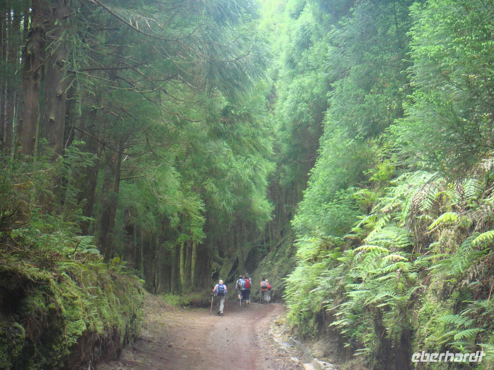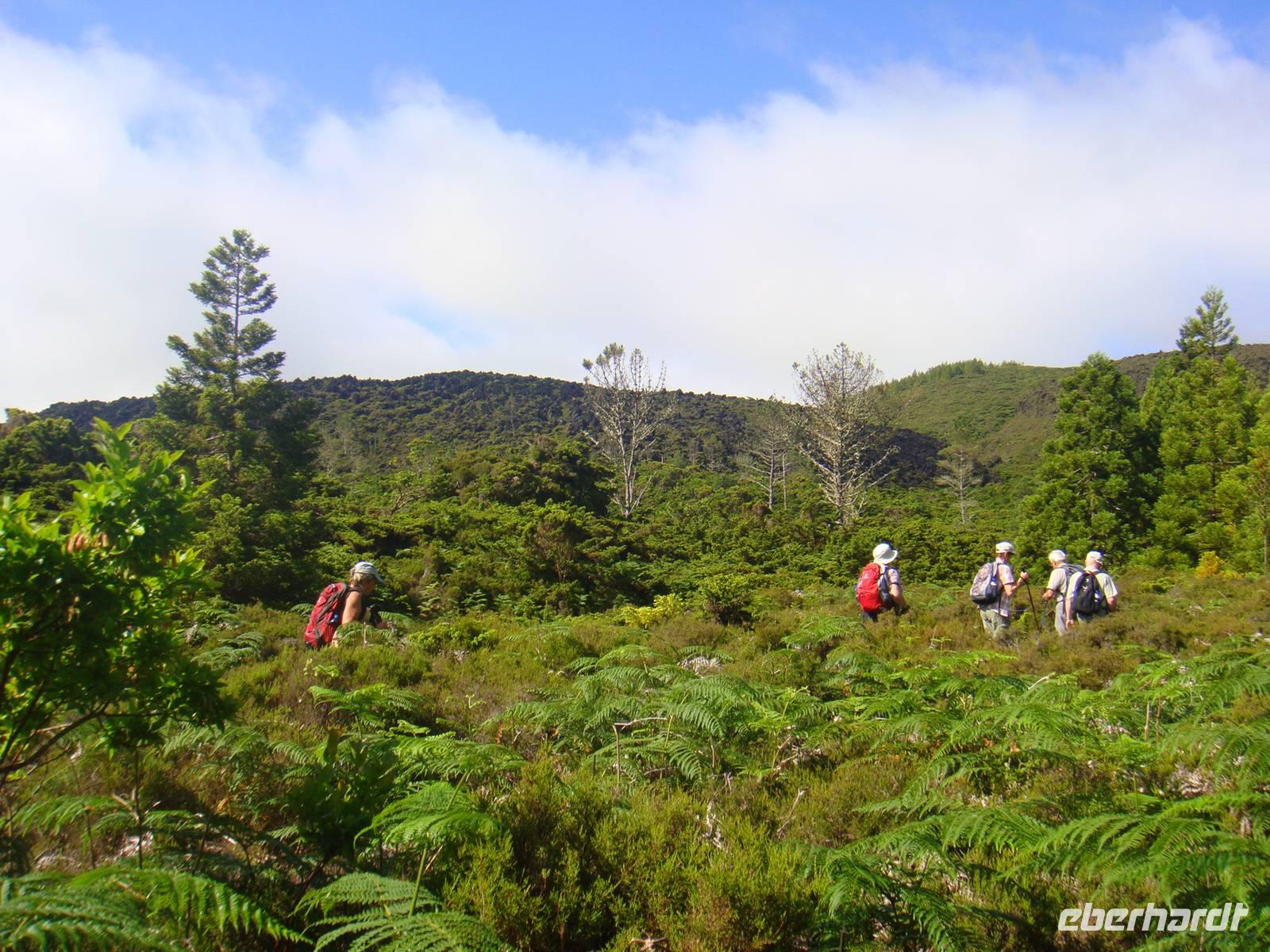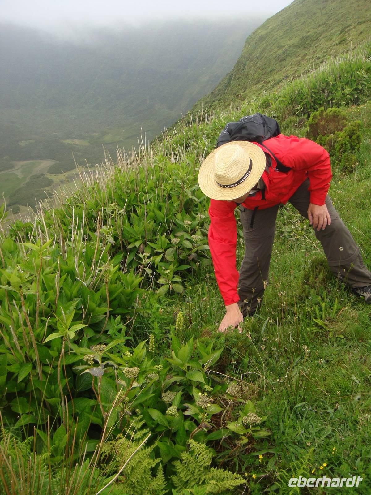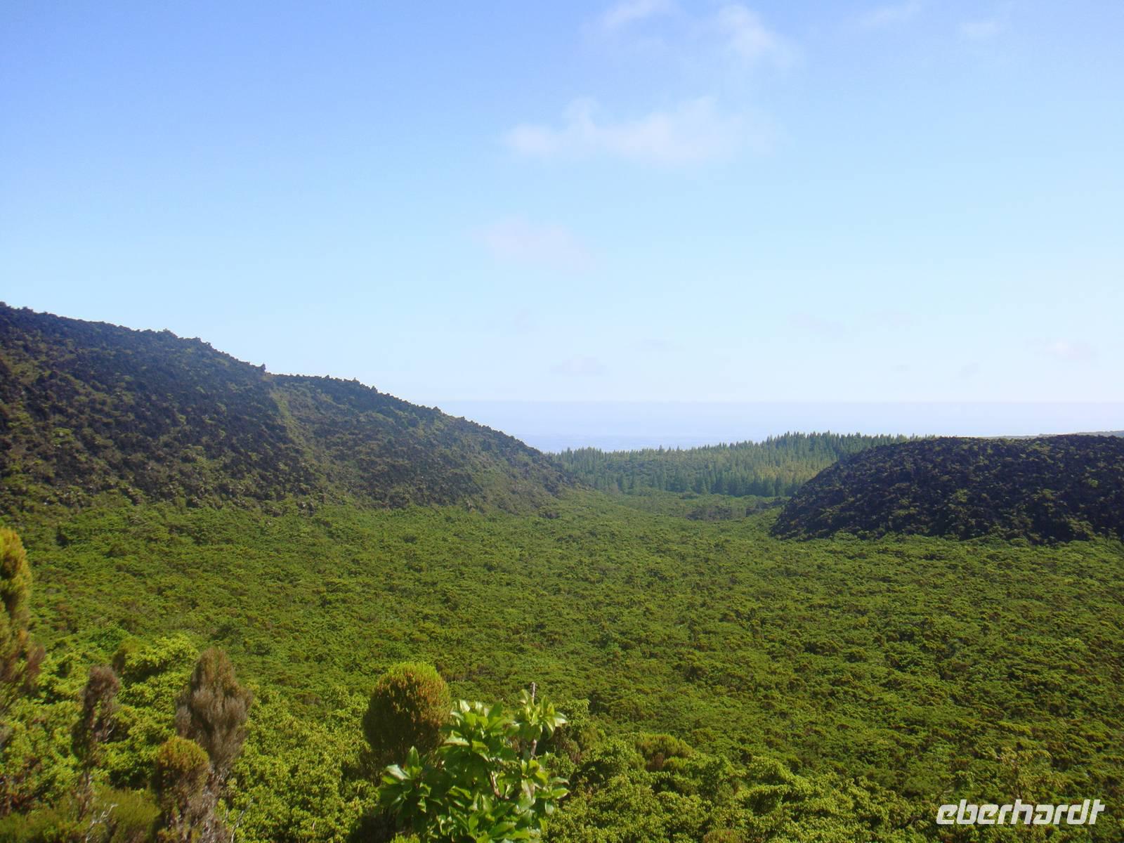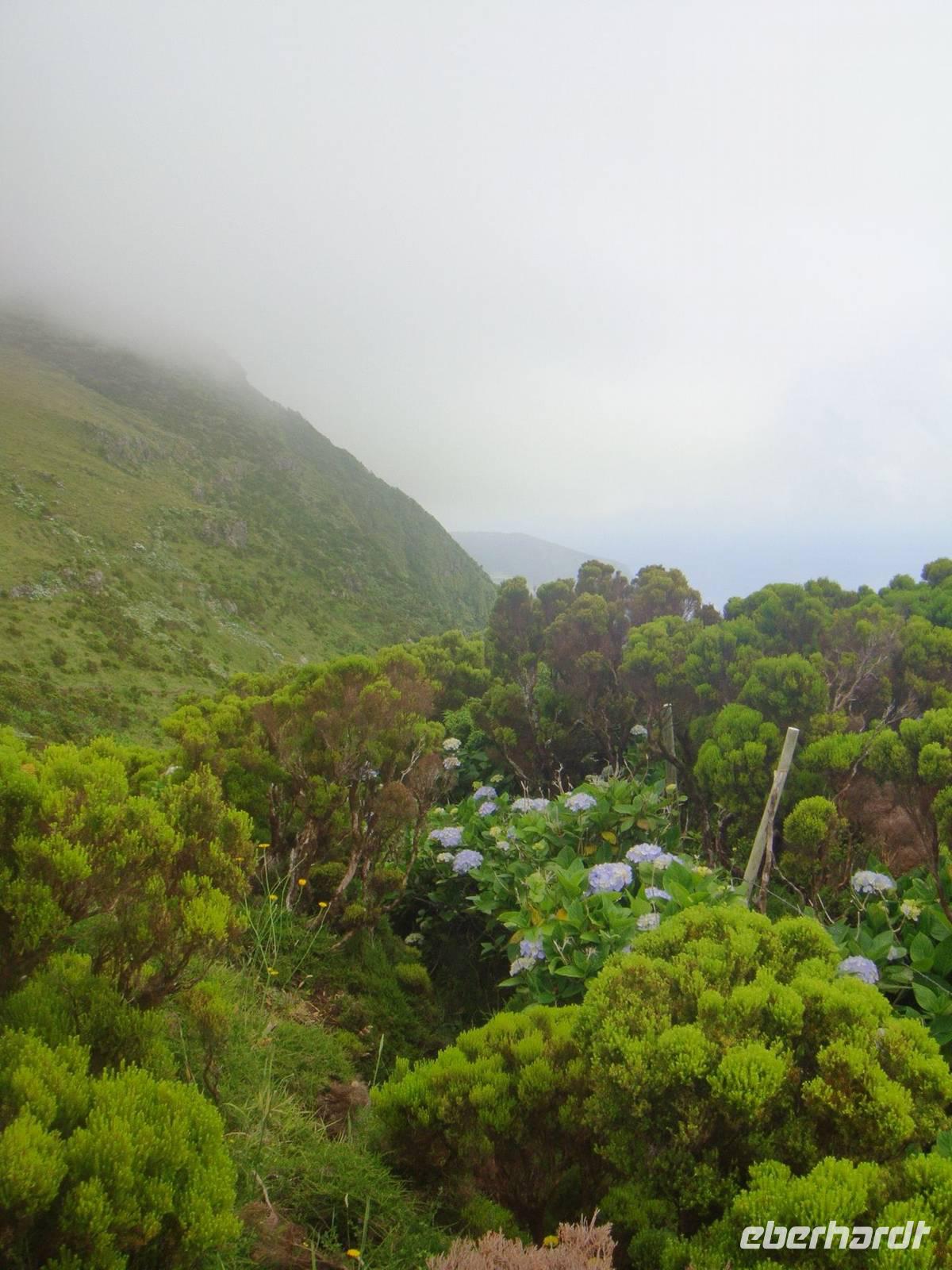 Jose erklärt uns, dass der Krater von Caldeira auf über 900 Metern Höhe liegt und ca. 1500 Meter Durchmesser misst. Fasziniert von der ursprünglichen Vegetation wandern wir durch das Naturschutzgebiet mit vielen Hortensienhecken, Zedern, Wacholder und Farnen.