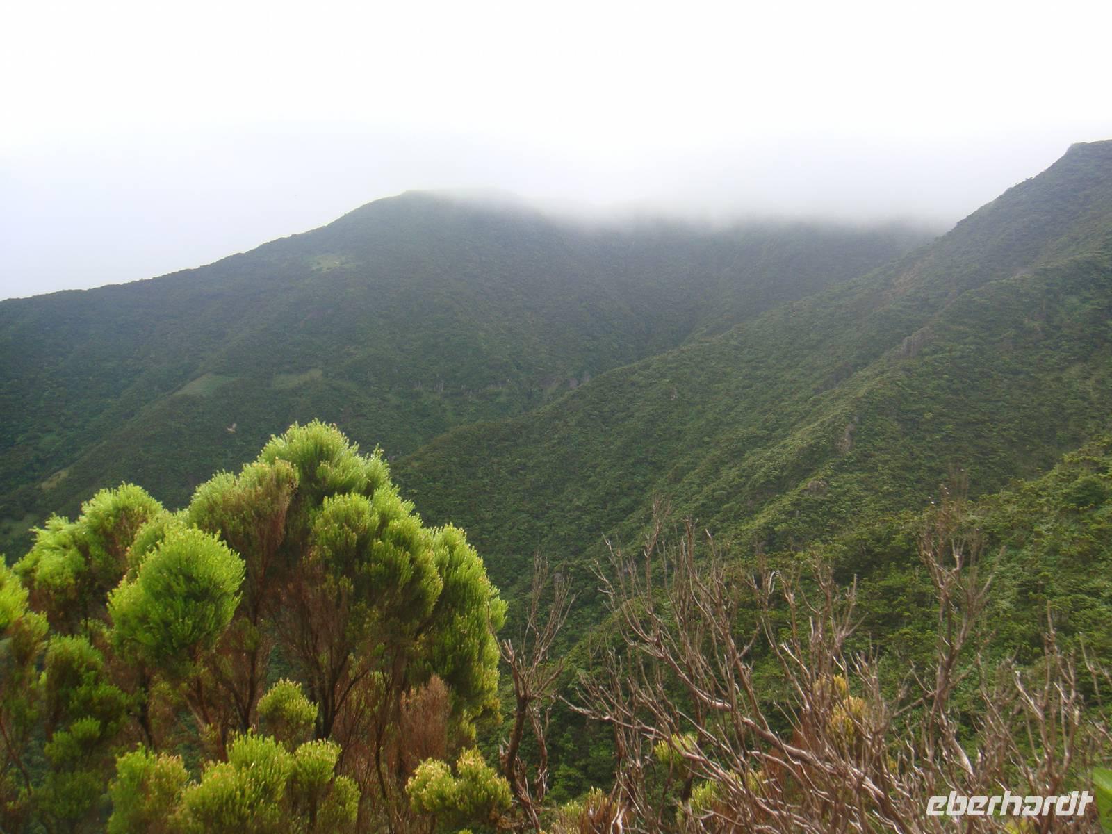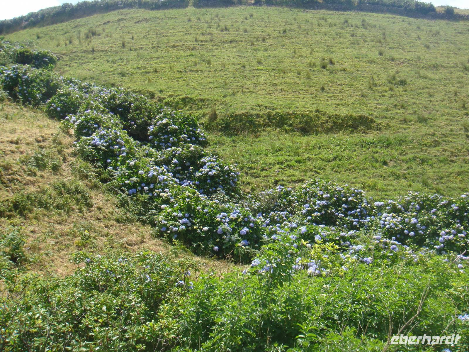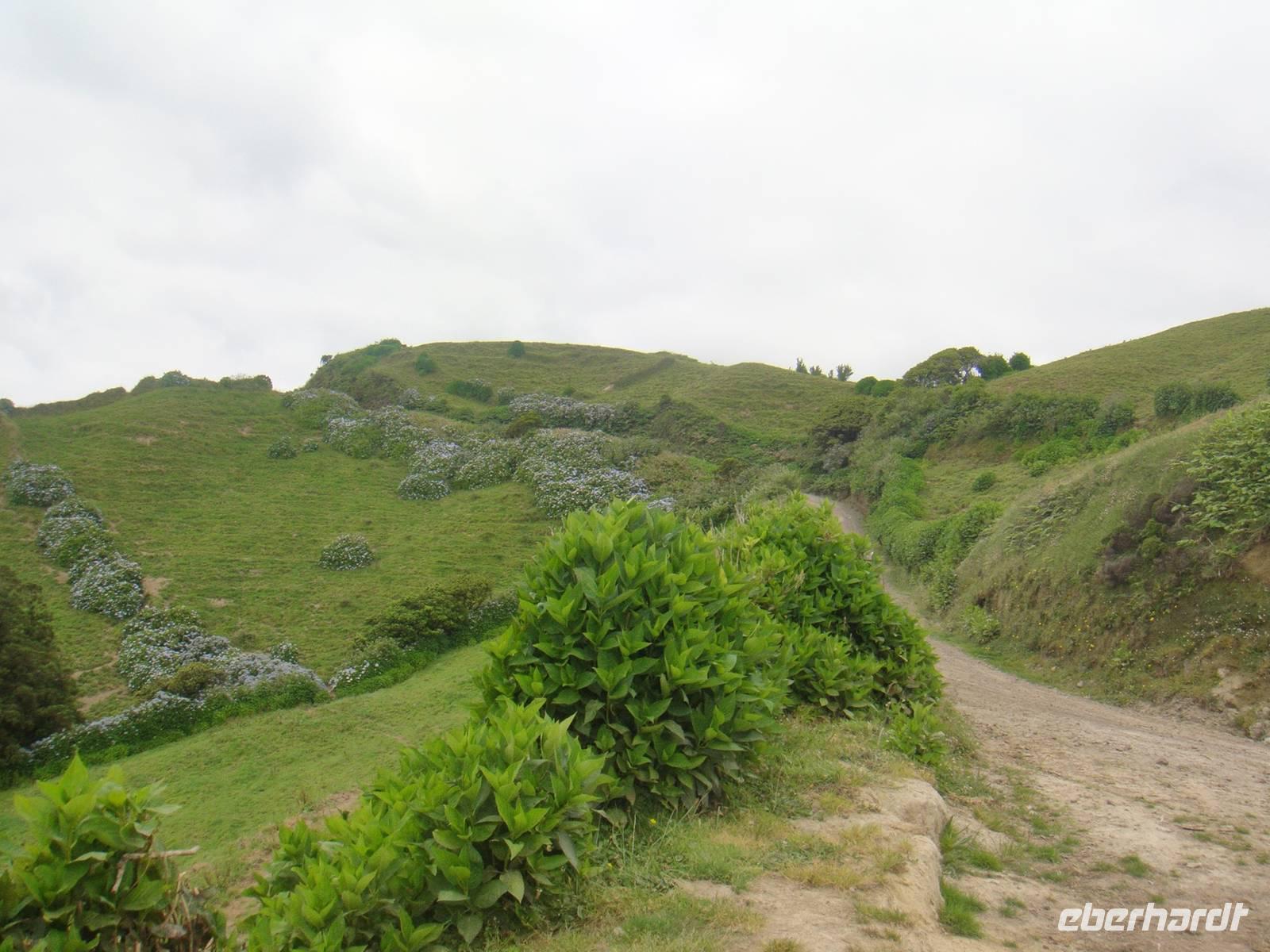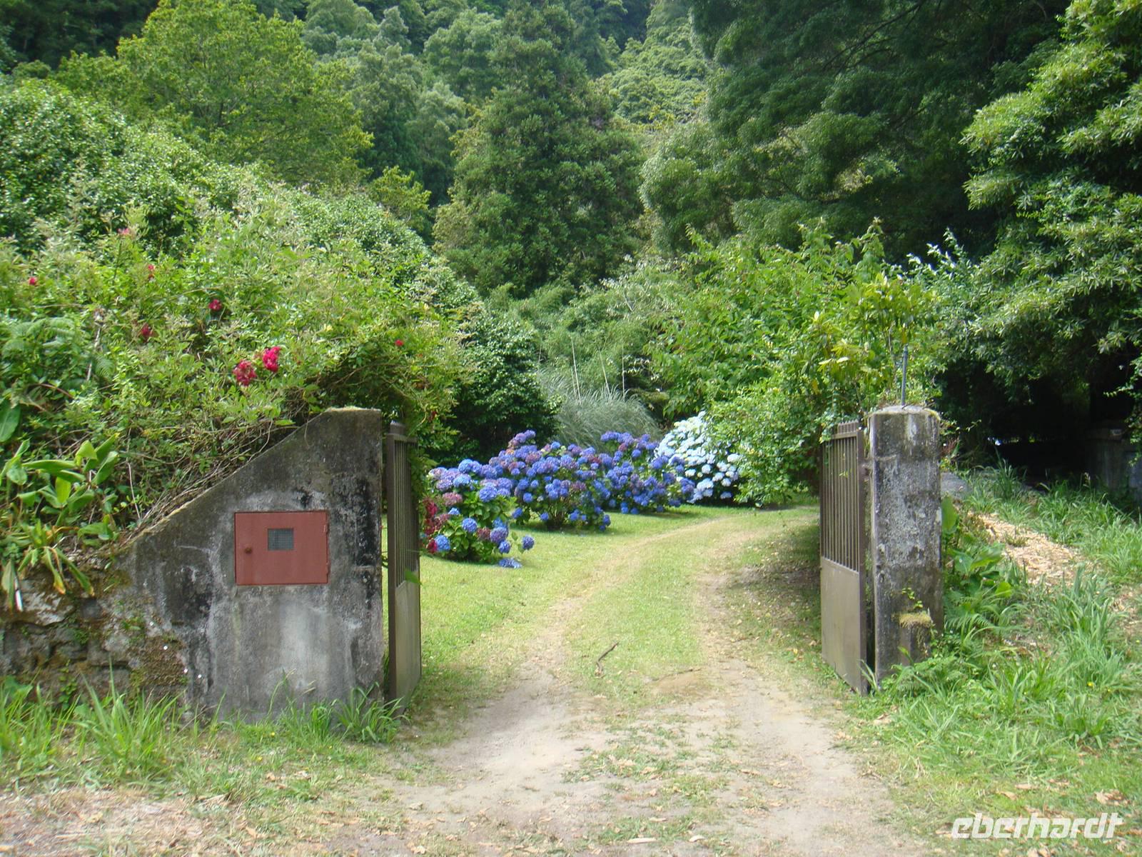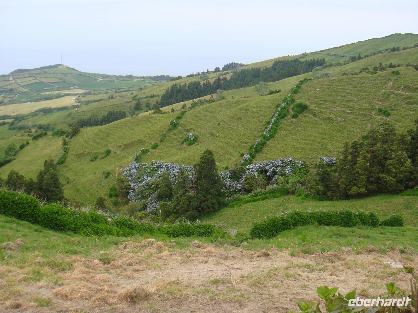 Jose erklärt uns, dass der Krater von Caldeira auf über 900 Metern Höhe liegt und ca. 1500 Meter Durchmesser misst. Fasziniert von der ursprünglichen Vegetation wandern wir durch das Naturschutzgebiet mit vielen Hortensienhecken, Zedern, Wacholder und Farnen.