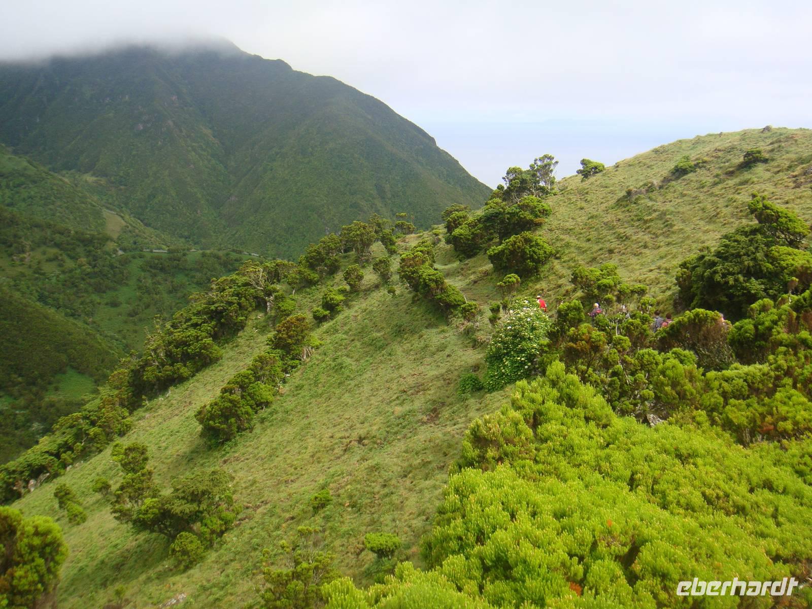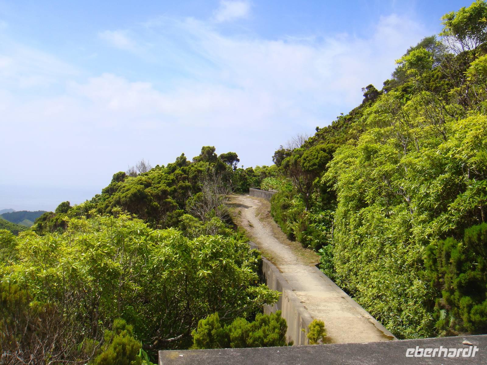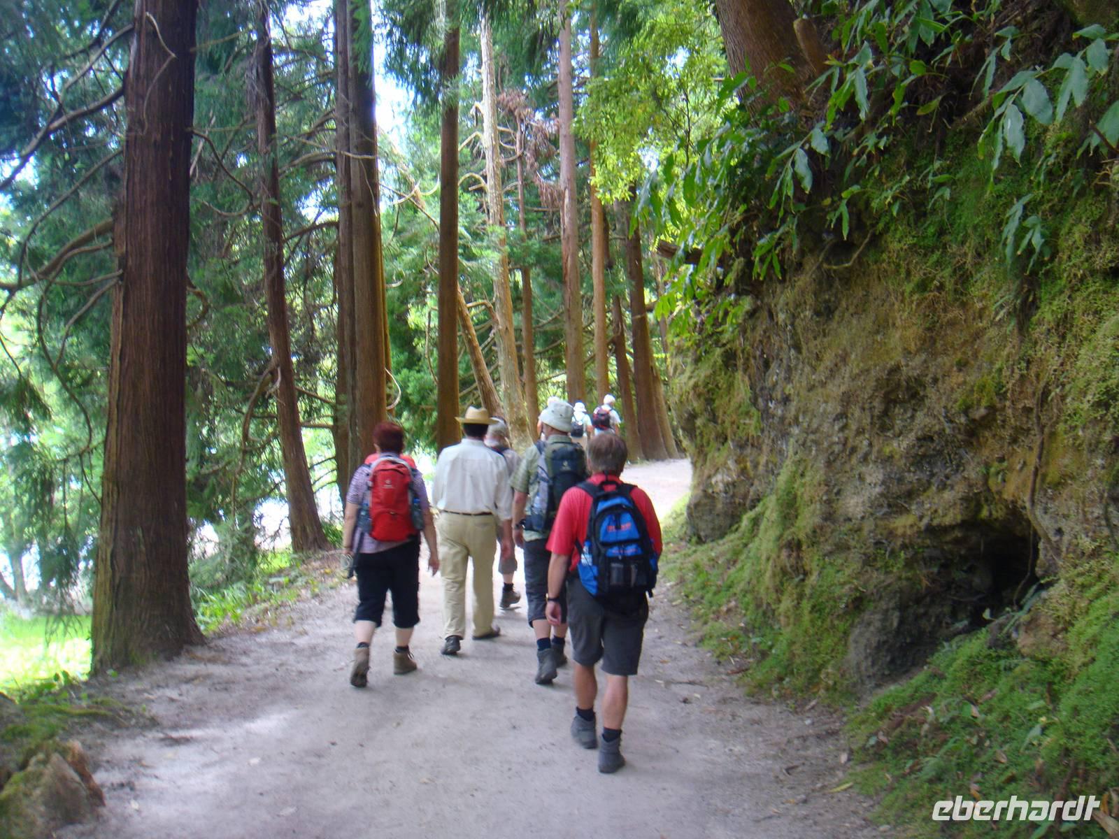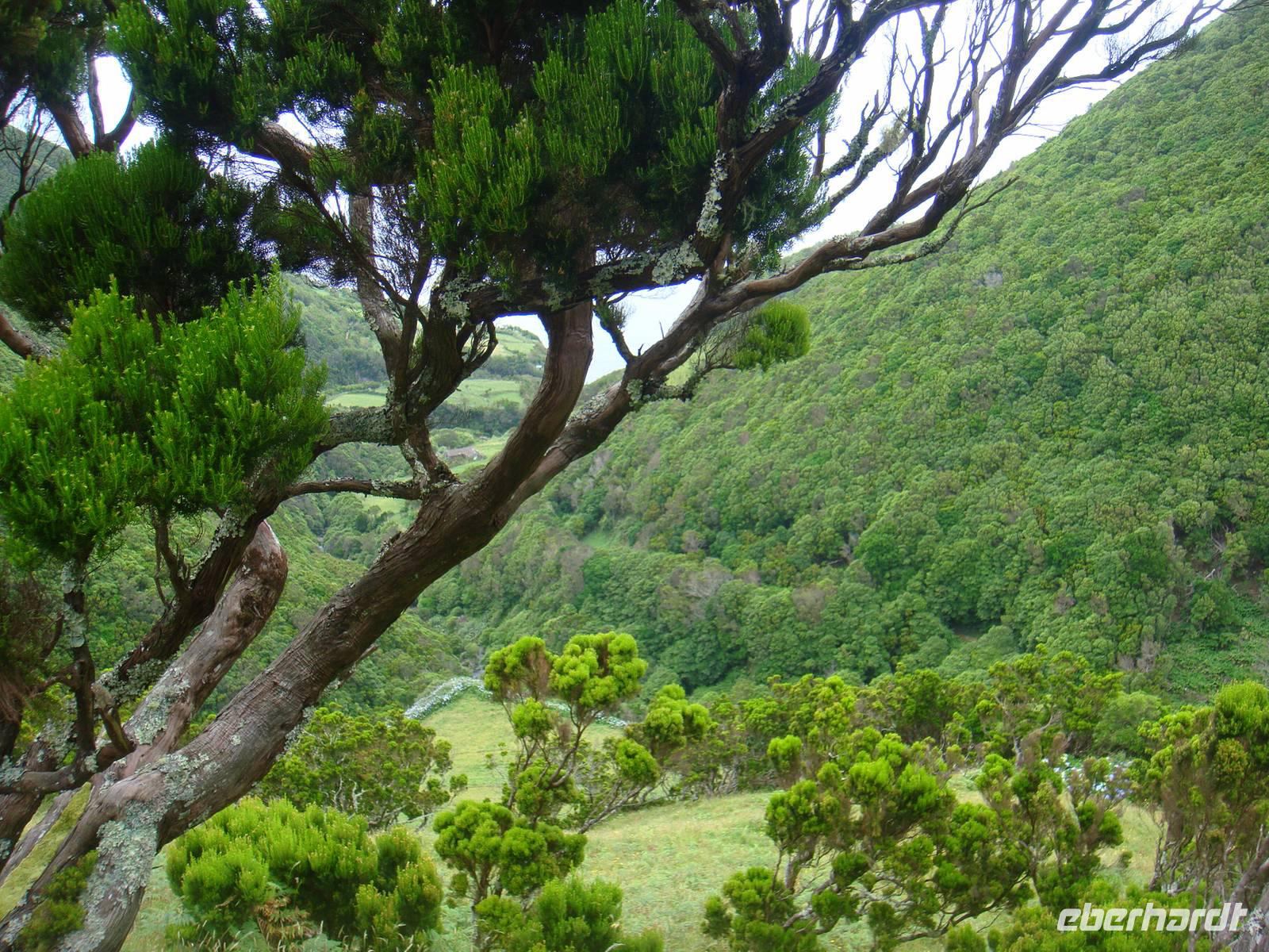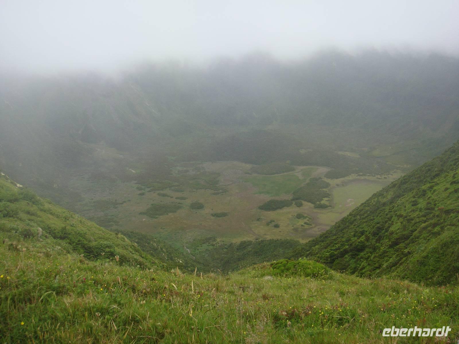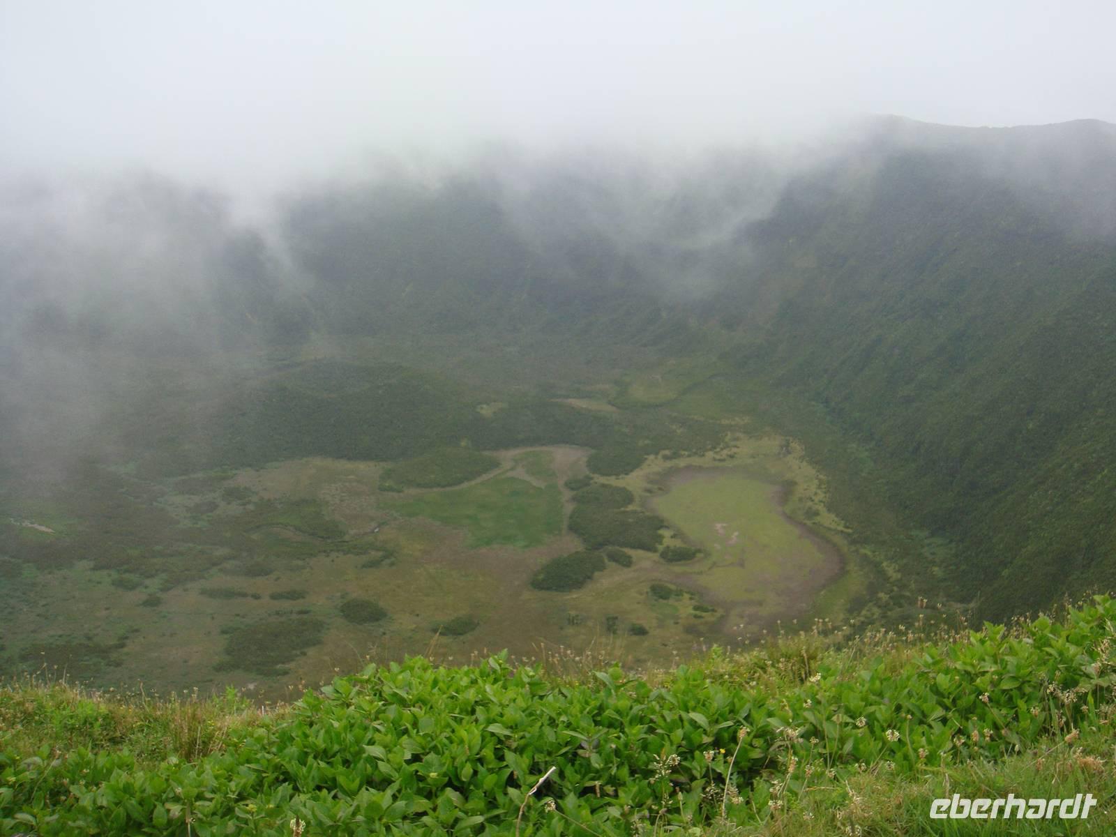 Jose erklärt uns, dass der Krater von Caldeira auf über 900 Metern Höhe liegt und ca. 1500 Meter Durchmesser misst. Fasziniert von der ursprünglichen Vegetation wandern wir durch das Naturschutzgebiet mit vielen Hortensienhecken, Zedern, Wacholder und Farnen.