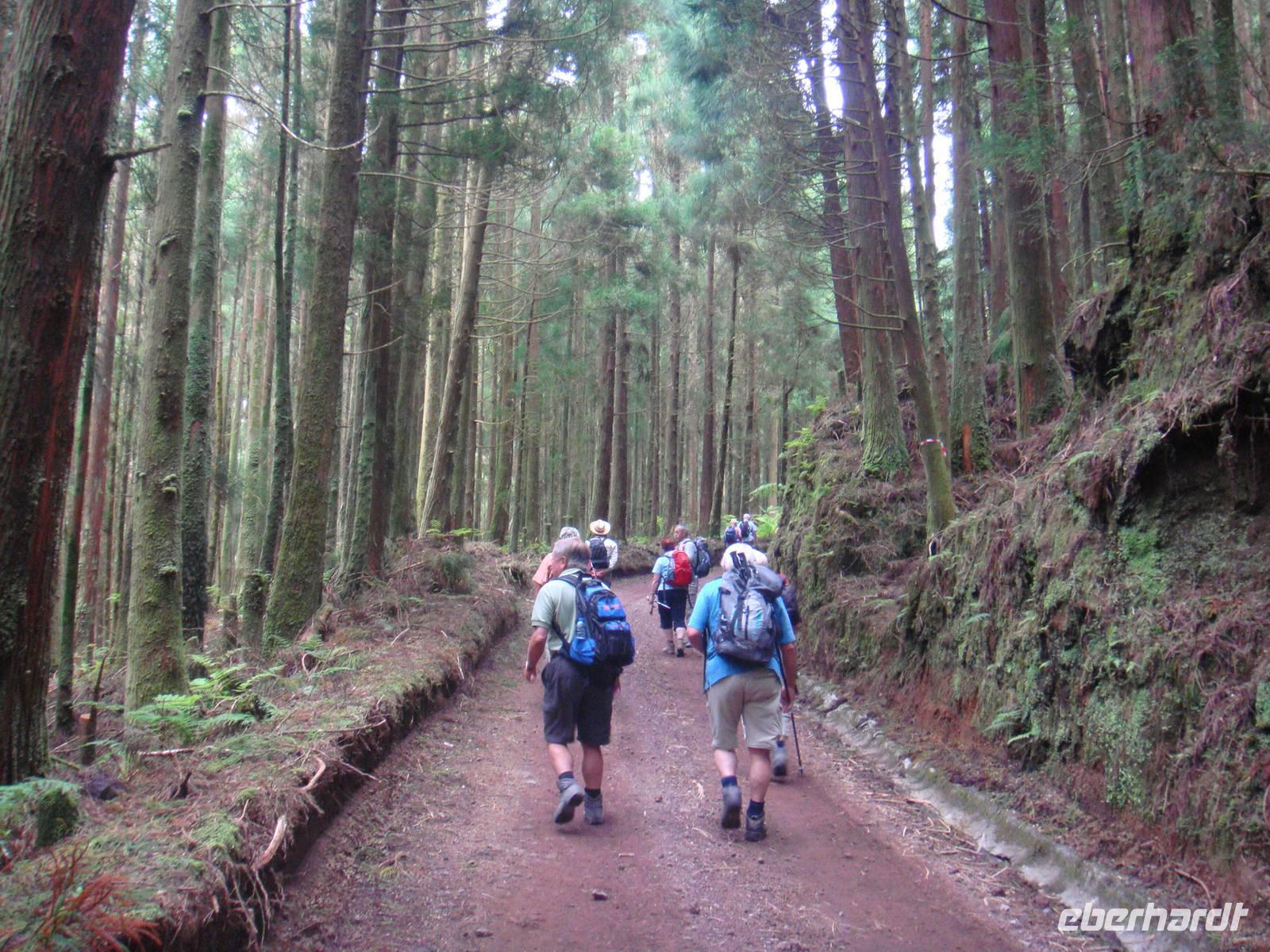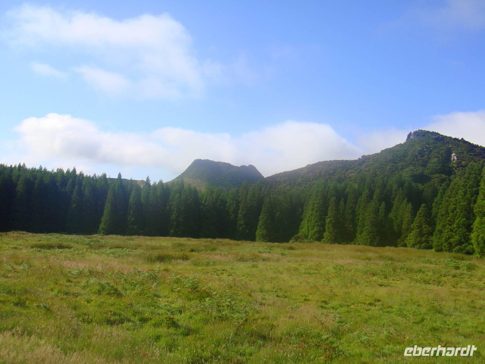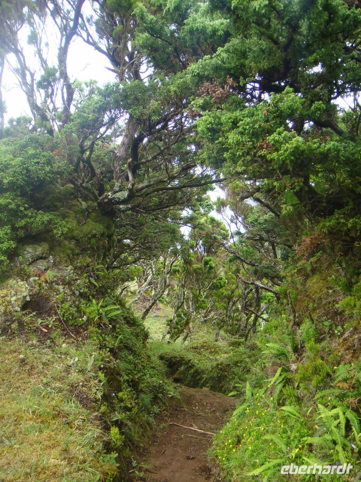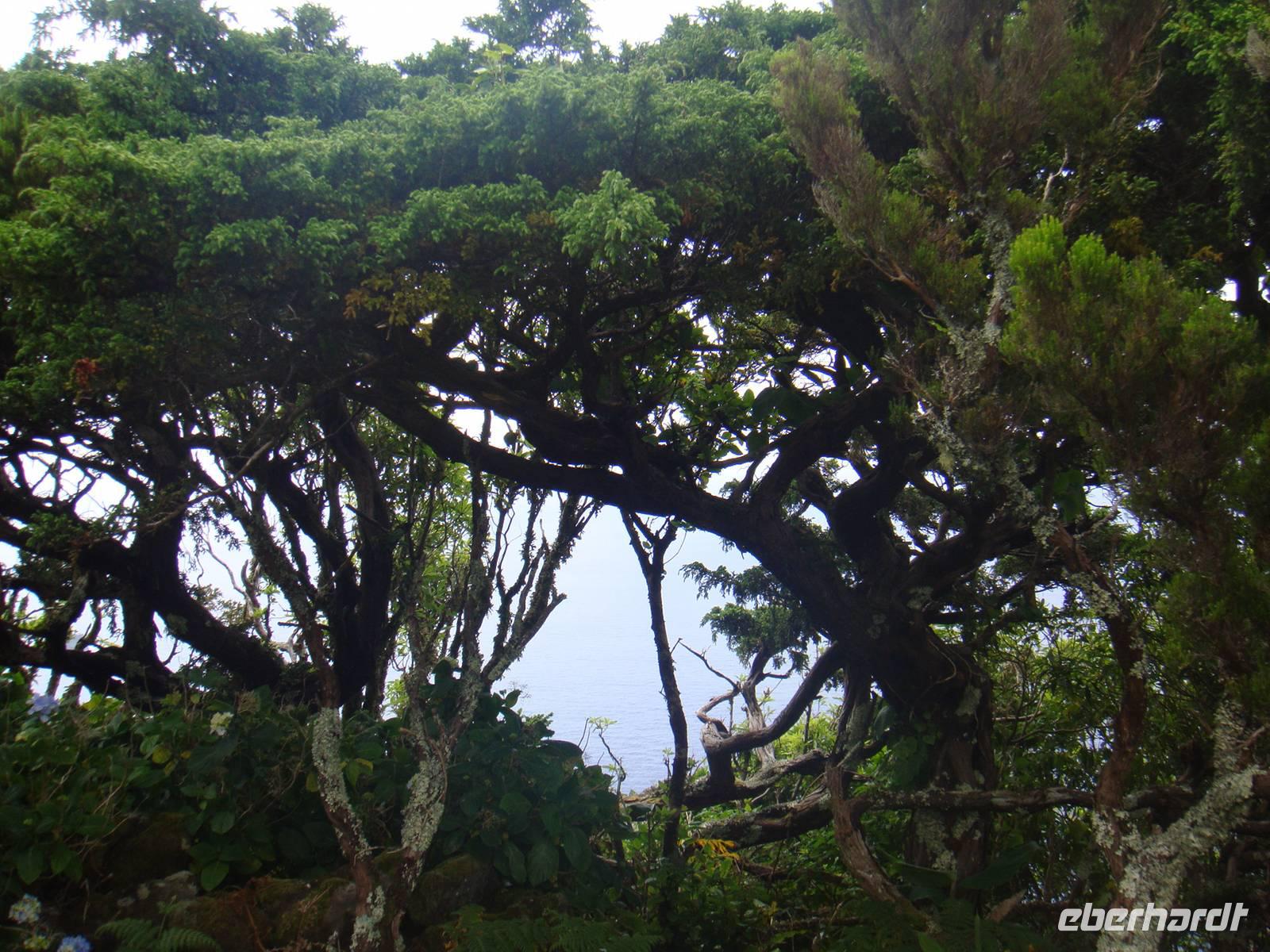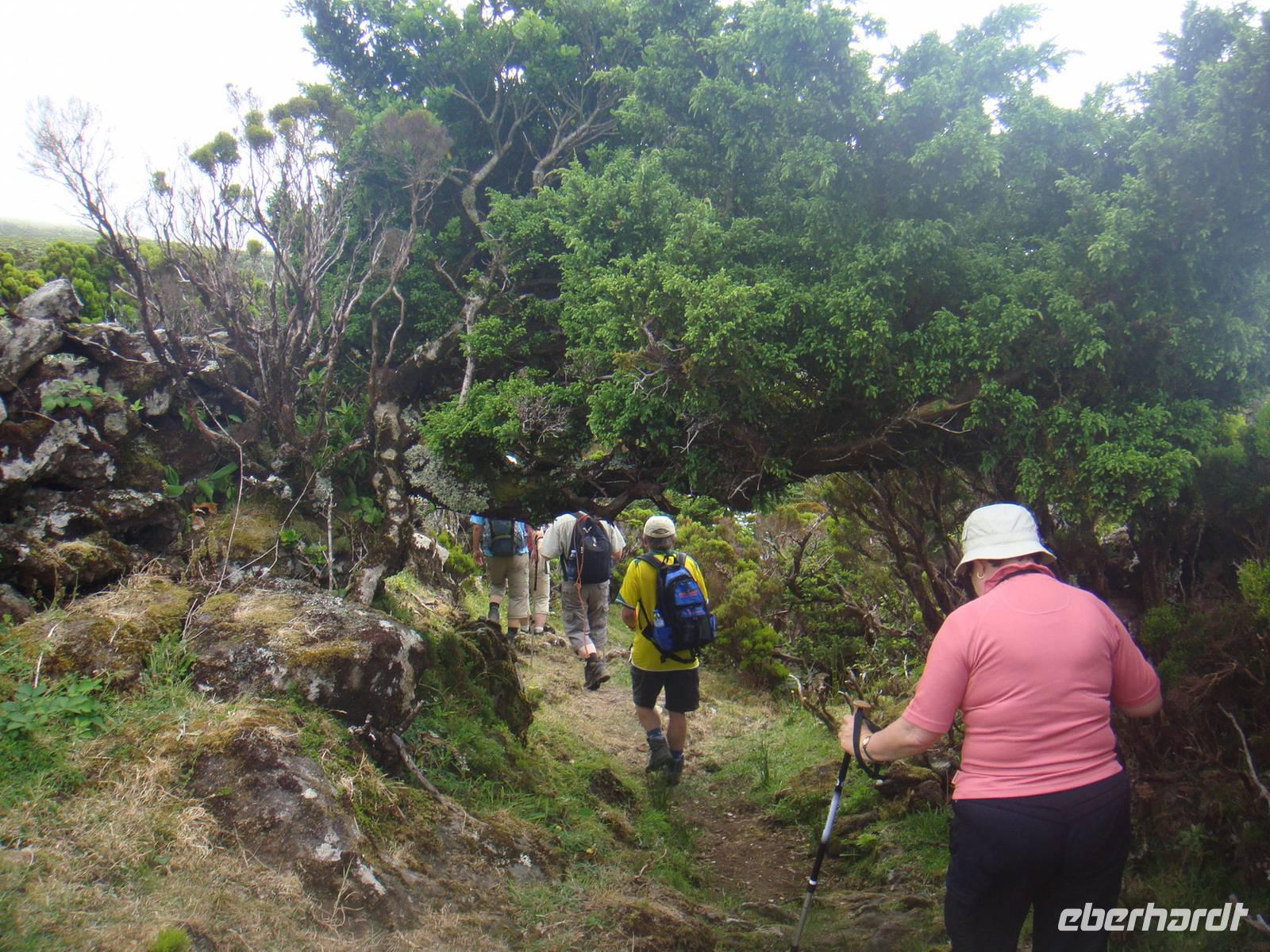 Jose erklärt uns, dass der Krater von Caldeira auf über 900 Metern Höhe liegt und ca. 1500 Meter Durchmesser misst. Fasziniert von der ursprünglichen Vegetation wandern wir durch das Naturschutzgebiet mit vielen Hortensienhecken, Zedern, Wacholder und Farnen.