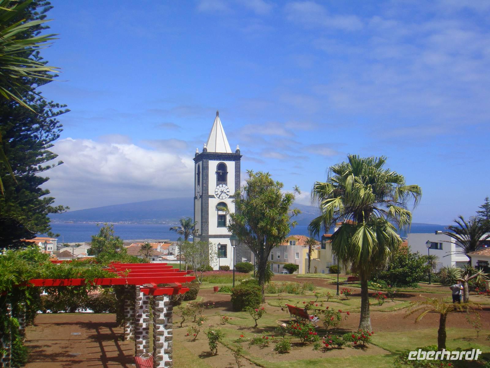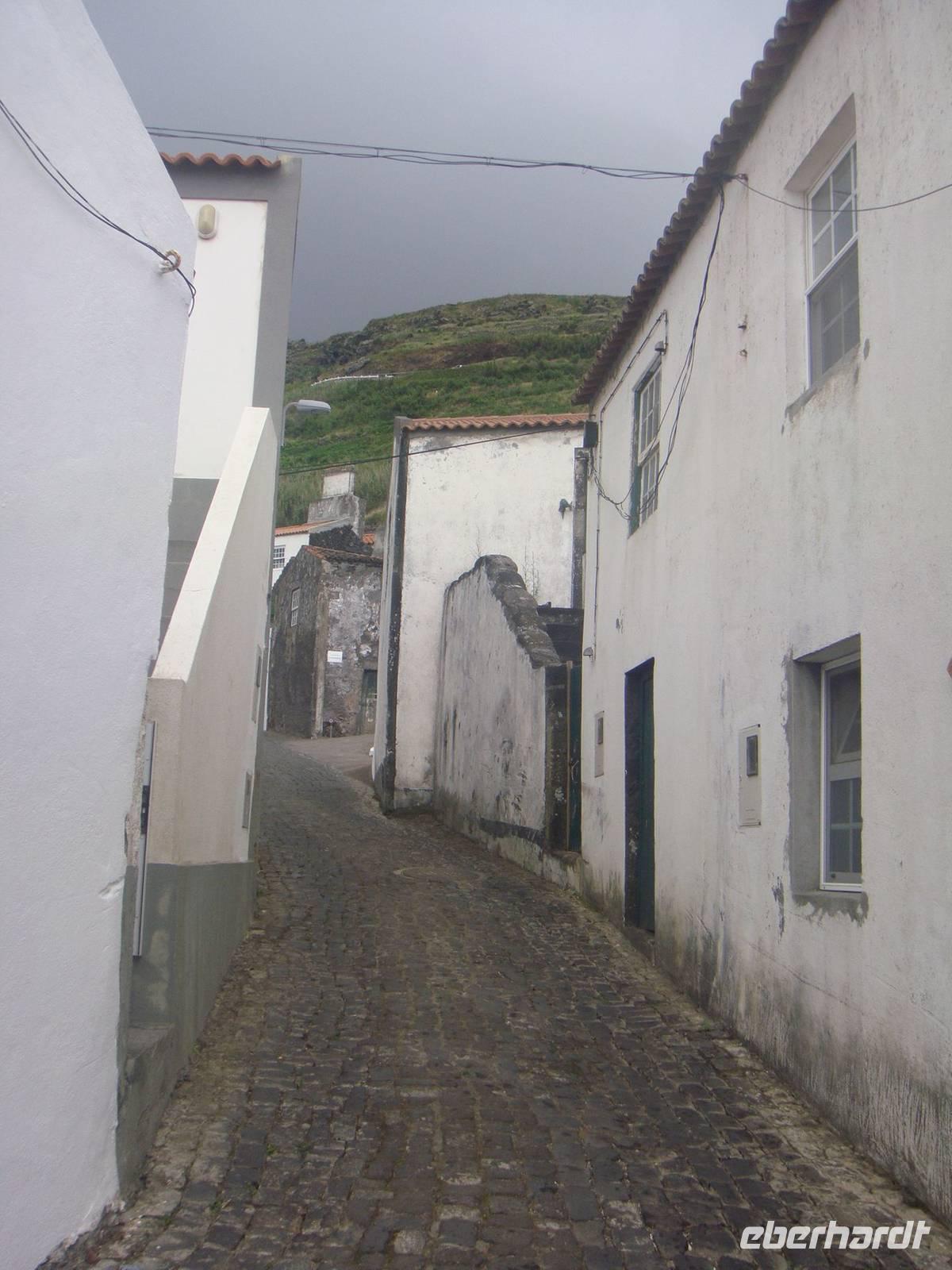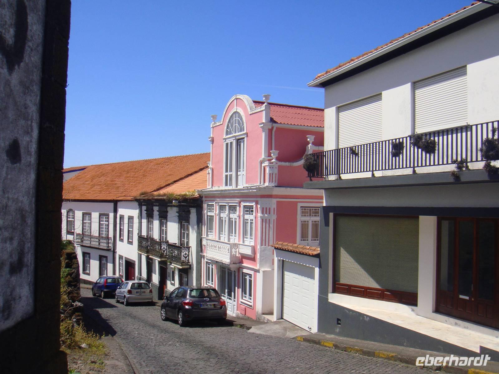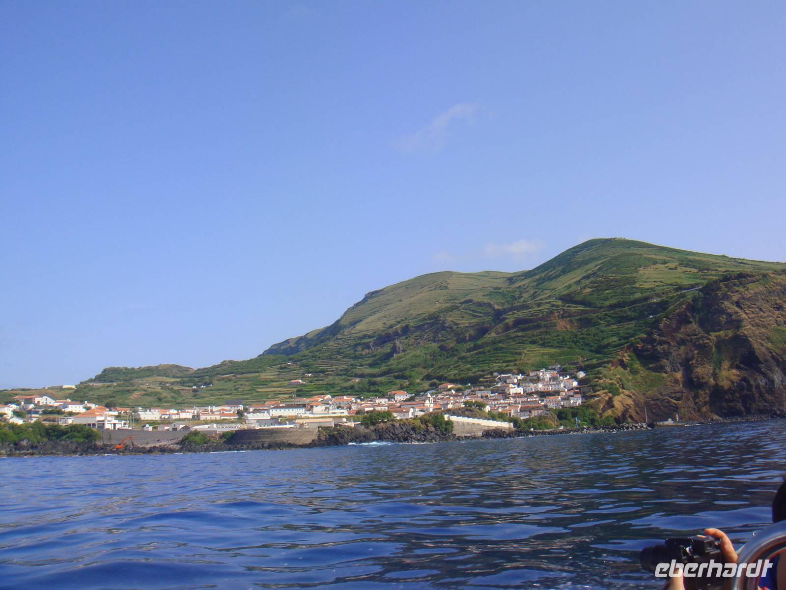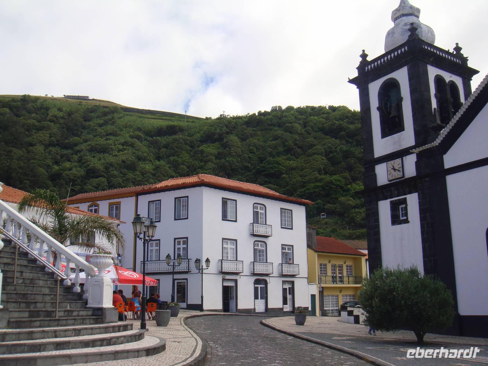 In Velas leben ca. 2000 Menschen. Unser Reiseleiter Jose führt uns durch die Gassen der Altstadt vorbei an vielen herrschaftlichen Häusern aus dem 18. und 19. Jahrhundert und dem barocken Rathaus geht es direkt durch den kleinen Stadtgarten „Jardim da Republica" mit seinem roten Musikpavillon. Die Bewohner nutzen diesen Garten als beliebten Treffpunkt für Jung und Alt bis tief in die Nacht. Am Ende der kleinen Geschäftsstraße treffen wir auf die Kirche „Igrea Matriz de Sao Jorge". Über den Platz mit dem Namen „Lago Jaoa Inacio de Sousa" auf dem früher Obst und Gemüse verkauft wurde ging es zum Franziskanerkloster welches heute ein Krankenhaus beherbergt. Am Hafen von Velas bestaunen wir die alte Befestigungsmauer, welche von der Stadt bis zum Hafen verläuft. Auf den Treppen hinter dem Stadttor machen einen Schnappschuss der Inselkachel der Insel Sao Jorge an der jeder vorbeikommt, der die Insel auf dem Wasserweg erreicht.