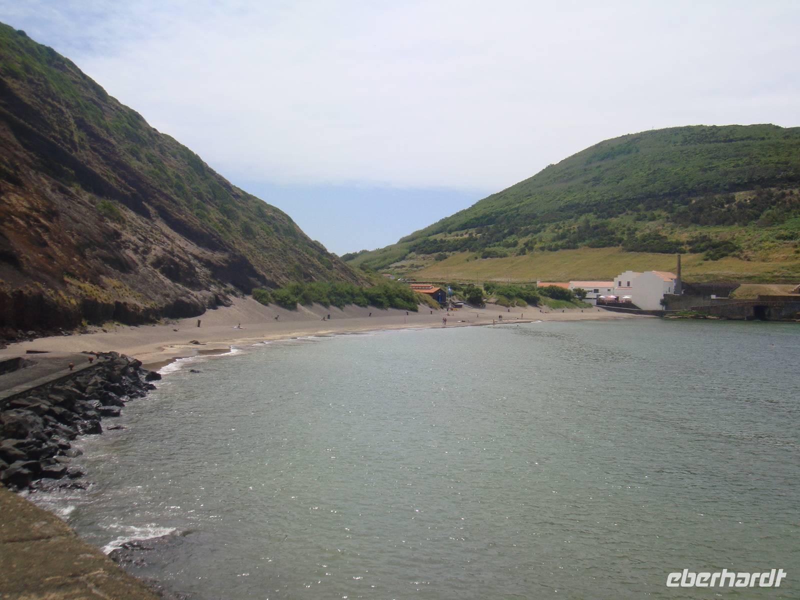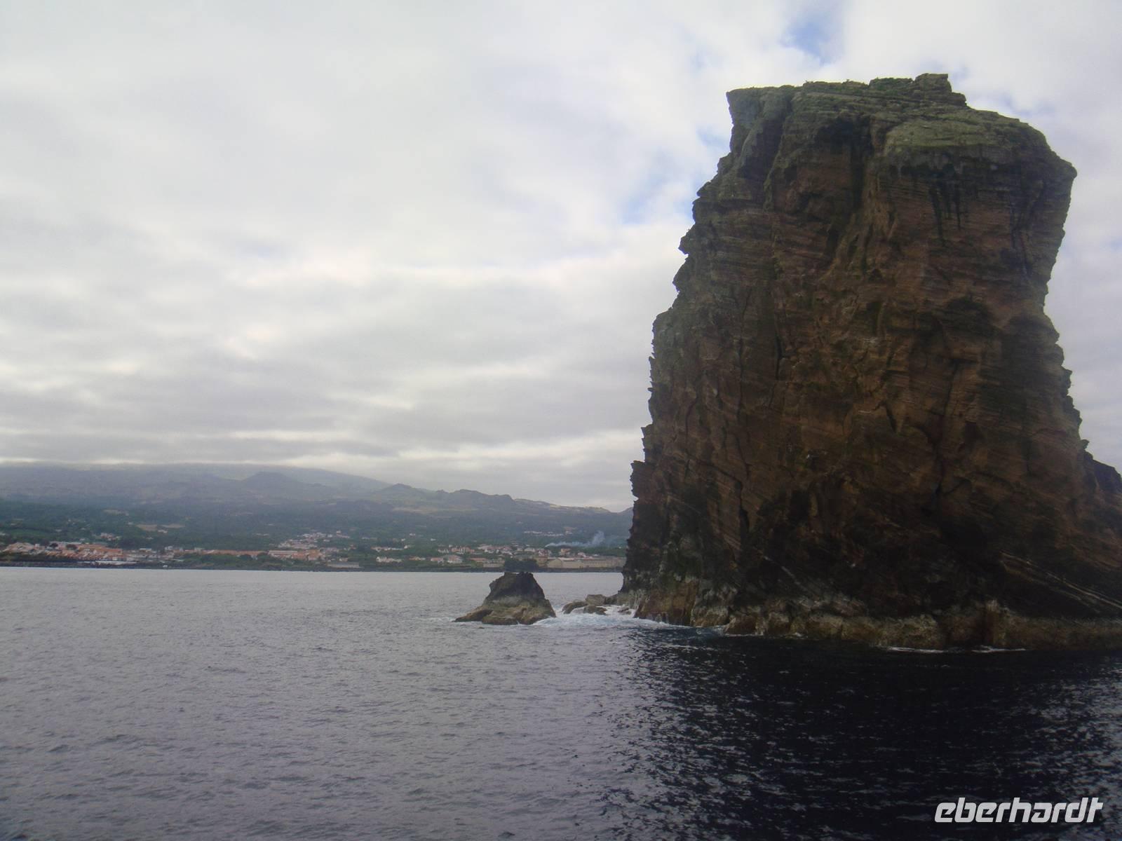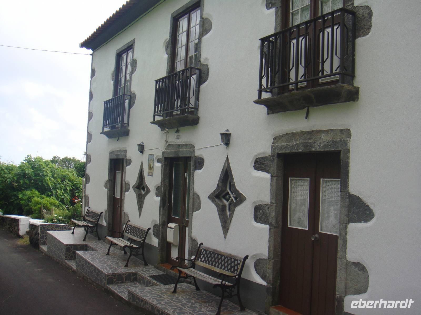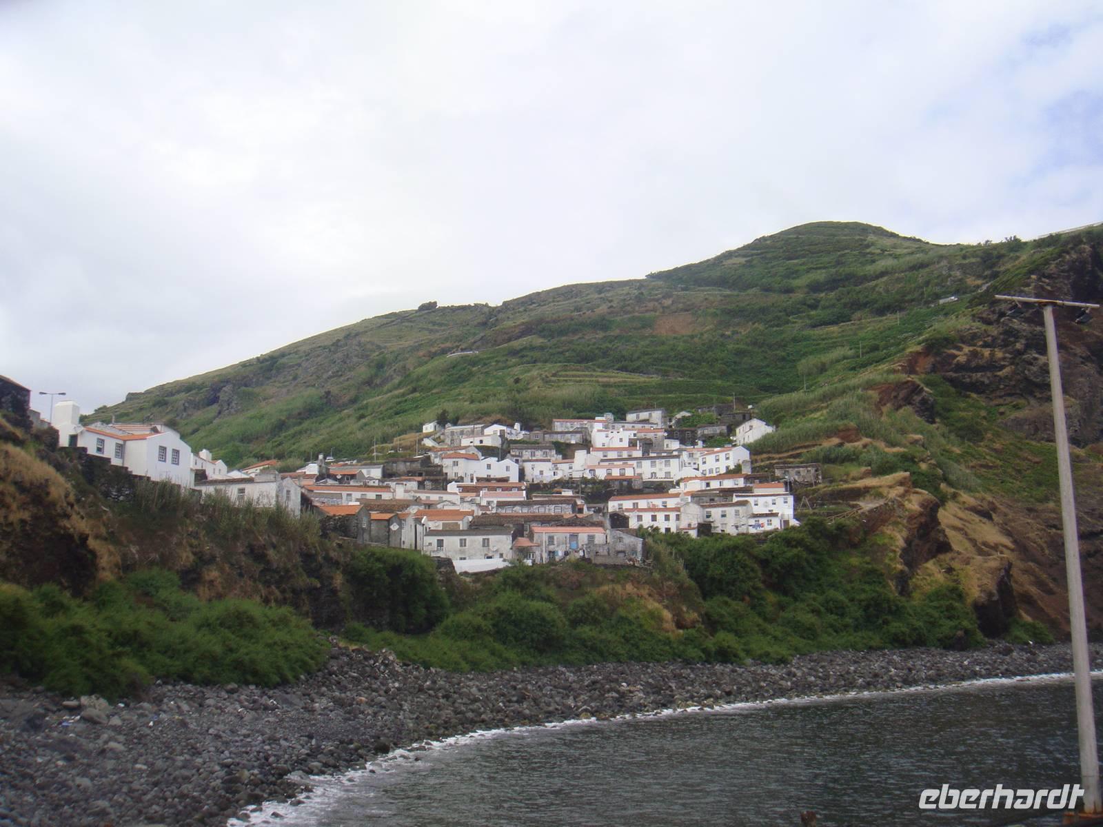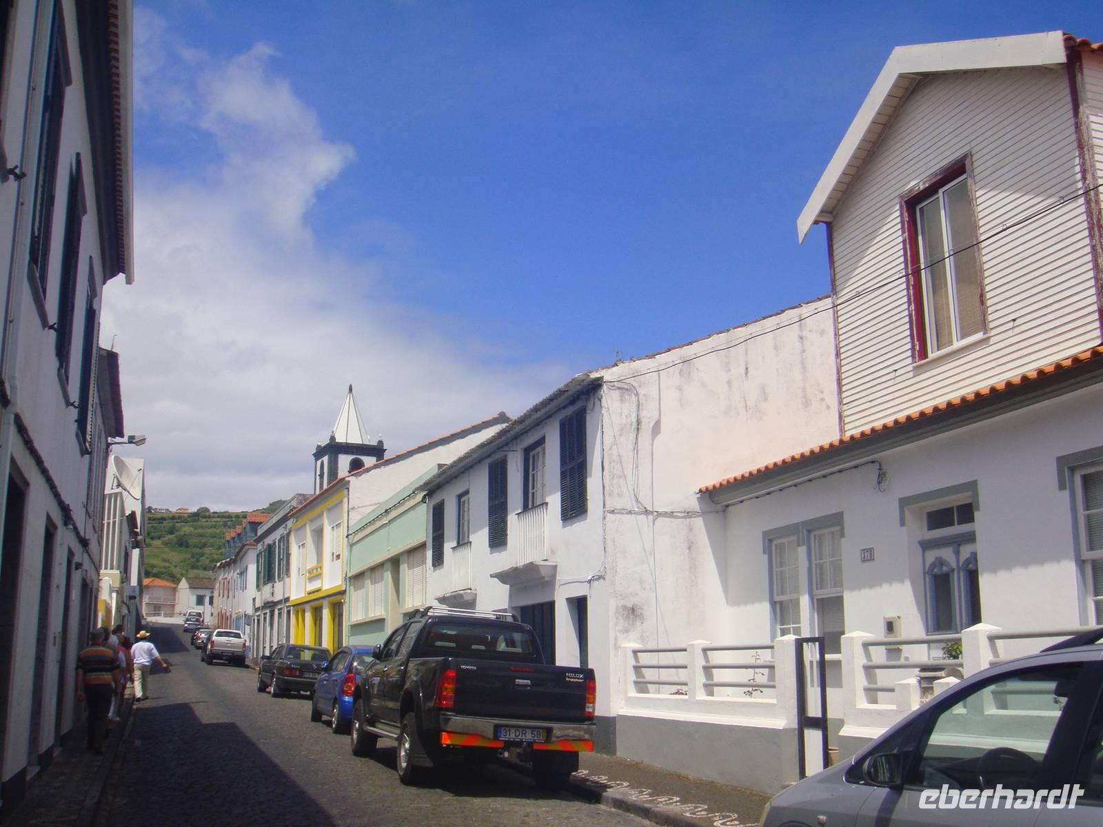 In Velas leben ca. 2000 Menschen. Unser Reiseleiter Jose führt uns durch die Gassen der Altstadt vorbei an vielen herrschaftlichen Häusern aus dem 18. und 19. Jahrhundert und dem barocken Rathaus geht es direkt durch den kleinen Stadtgarten „Jardim da Republica" mit seinem roten Musikpavillon. Die Bewohner nutzen diesen Garten als beliebten Treffpunkt für Jung und Alt bis tief in die Nacht. Am Ende der kleinen Geschäftsstraße treffen wir auf die Kirche „Igrea Matriz de Sao Jorge". Über den Platz mit dem Namen „Lago Jaoa Inacio de Sousa" auf dem früher Obst und Gemüse verkauft wurde ging es zum Franziskanerkloster welches heute ein Krankenhaus beherbergt. Am Hafen von Velas bestaunen wir die alte Befestigungsmauer, welche von der Stadt bis zum Hafen verläuft. Auf den Treppen hinter dem Stadttor machen einen Schnappschuss der Inselkachel der Insel Sao Jorge an der jeder vorbeikommt, der die Insel auf dem Wasserweg erreicht.