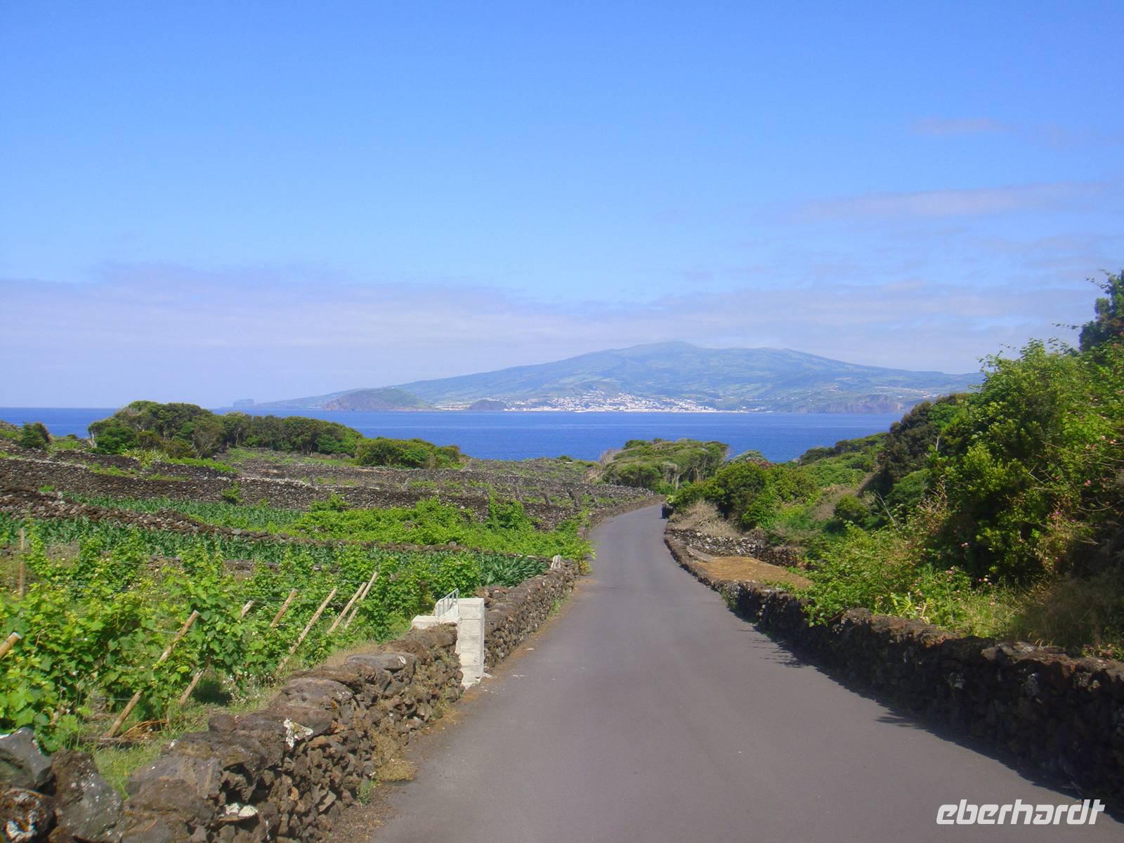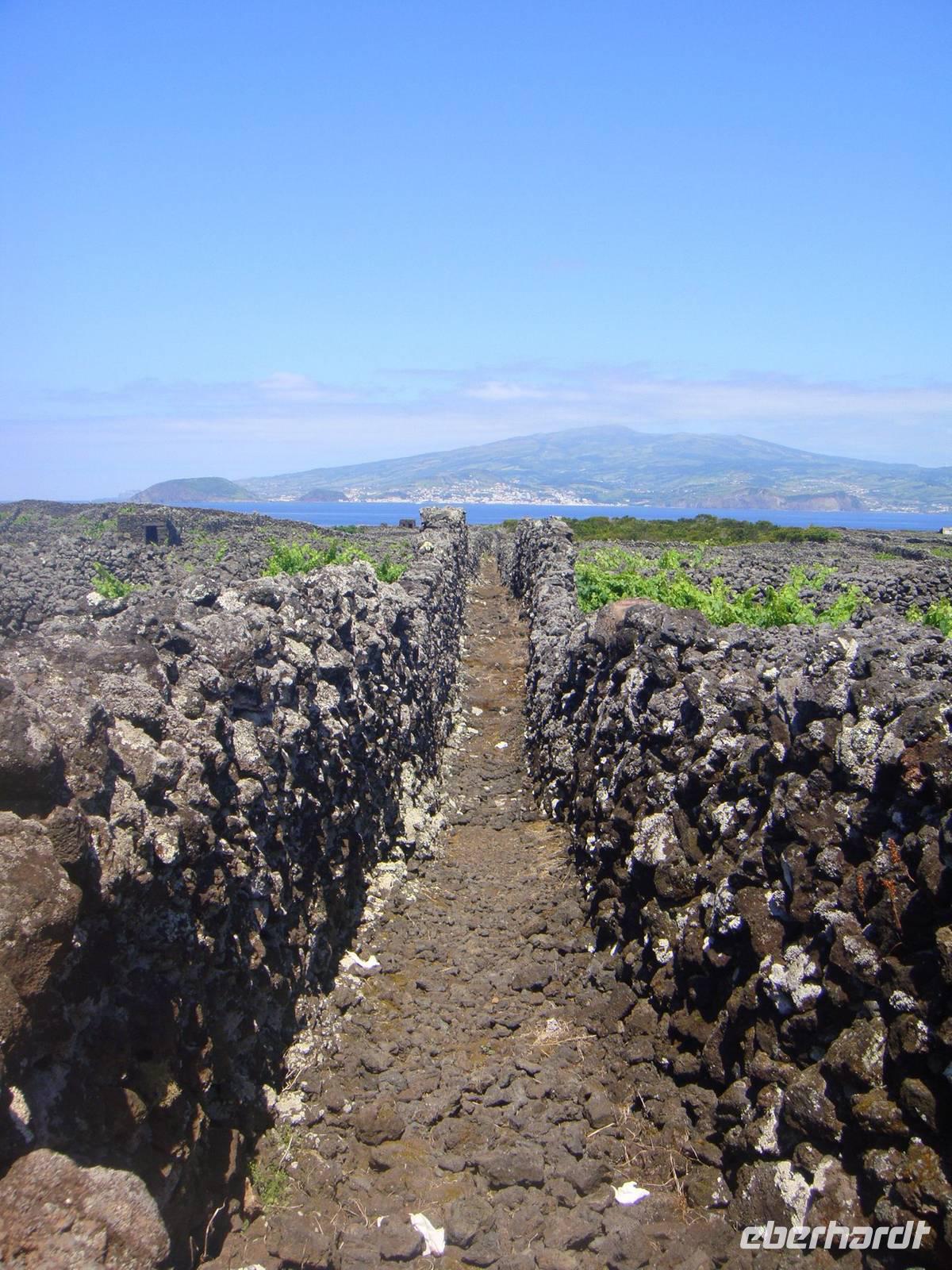 Wir laufen gemütlich an der Küste von Pico entlang und schauen auf die gegenüberliegende Insel Faial. Am Wegesrand bestaunen wir die Dörfer welche versteckt zwischen Weinbergen und grüner Vegetation liegen. Die Häuser sind aus dunklen Lavaquadern erbaut und überall grünt und blüht es in den Gärten und Blumentöpfen. Unser Weg führt uns durch die Weinberge von Pico. Eine einzigartige Kulturlandschaft die ebenfalls von der UNESCO zum Weltkulturerbe erklärte wurde. Wir erkunden das Labyrinth aus schwarzen Mauern, aus denen die grünen Weinreben hervor ragen.