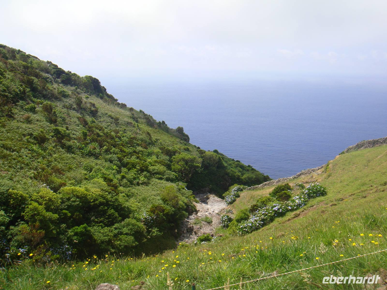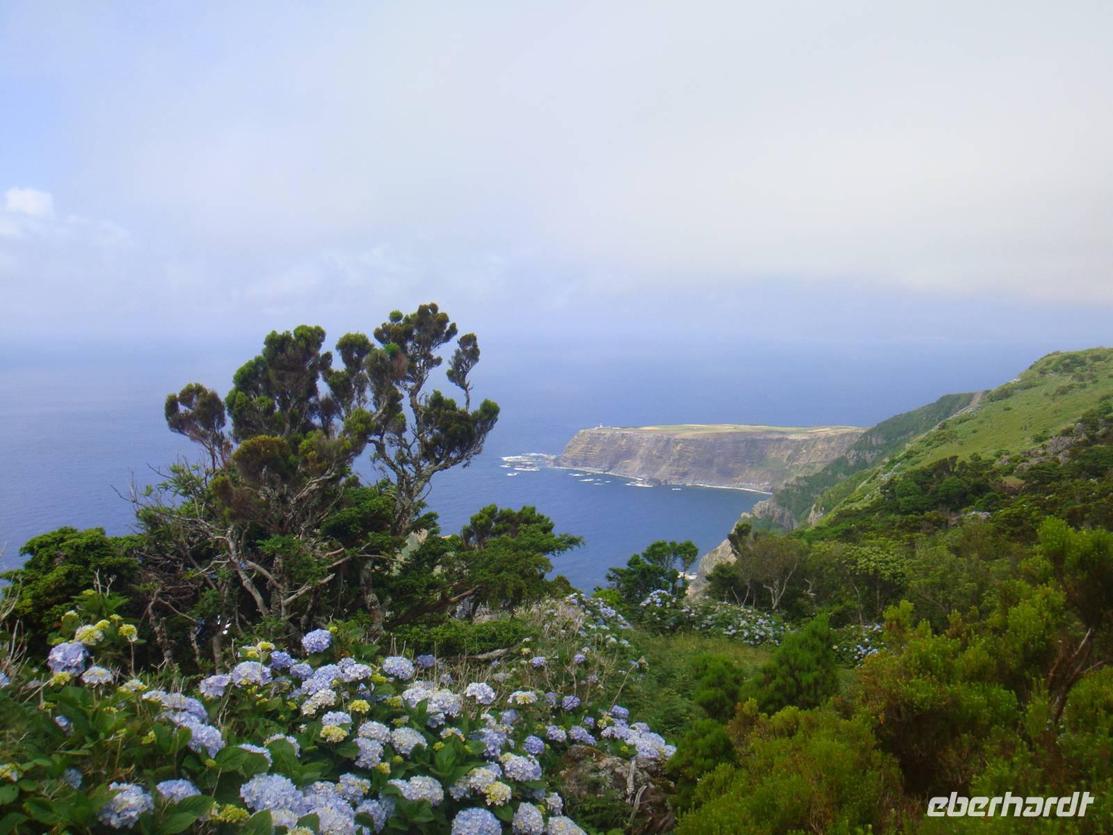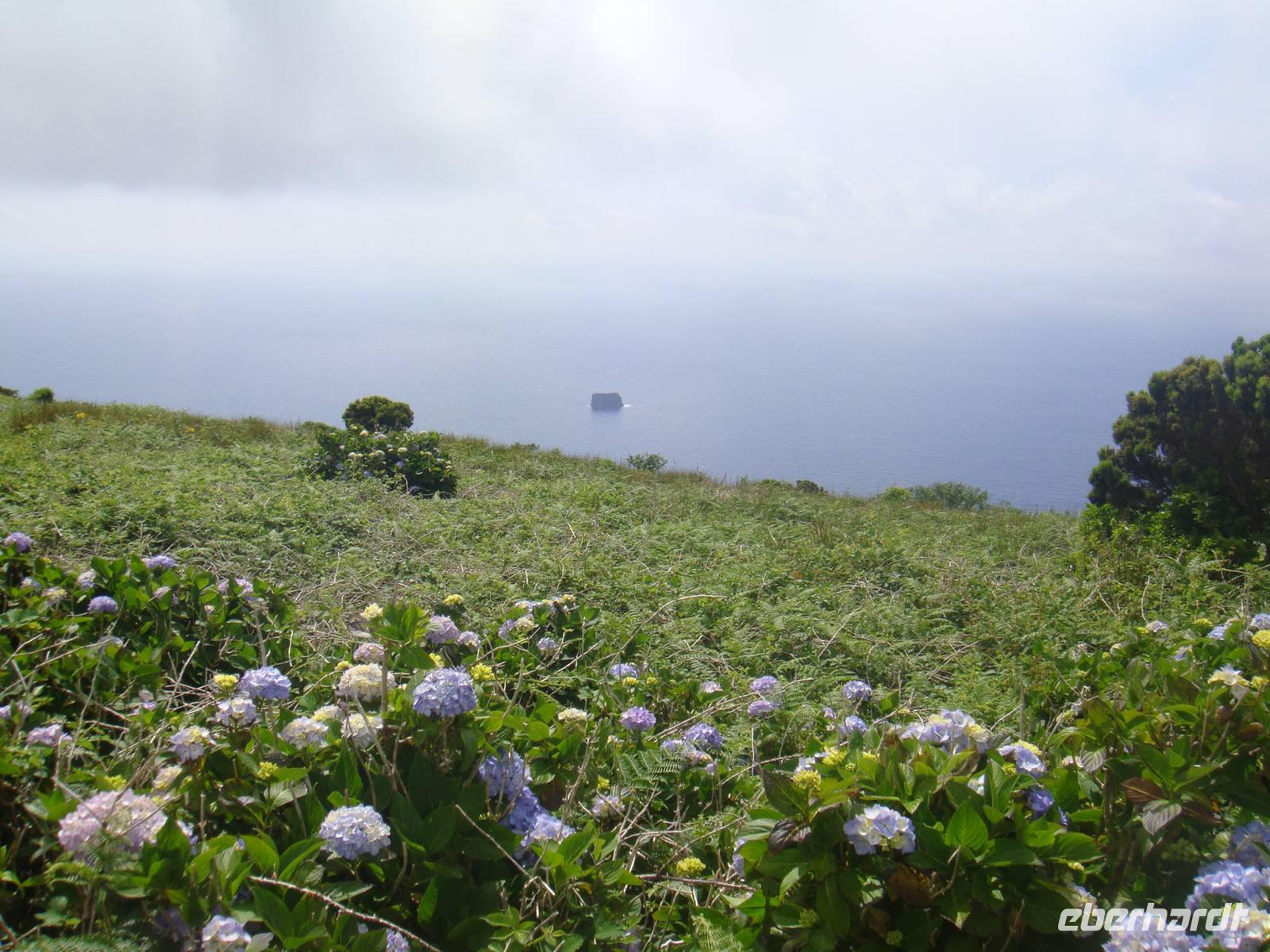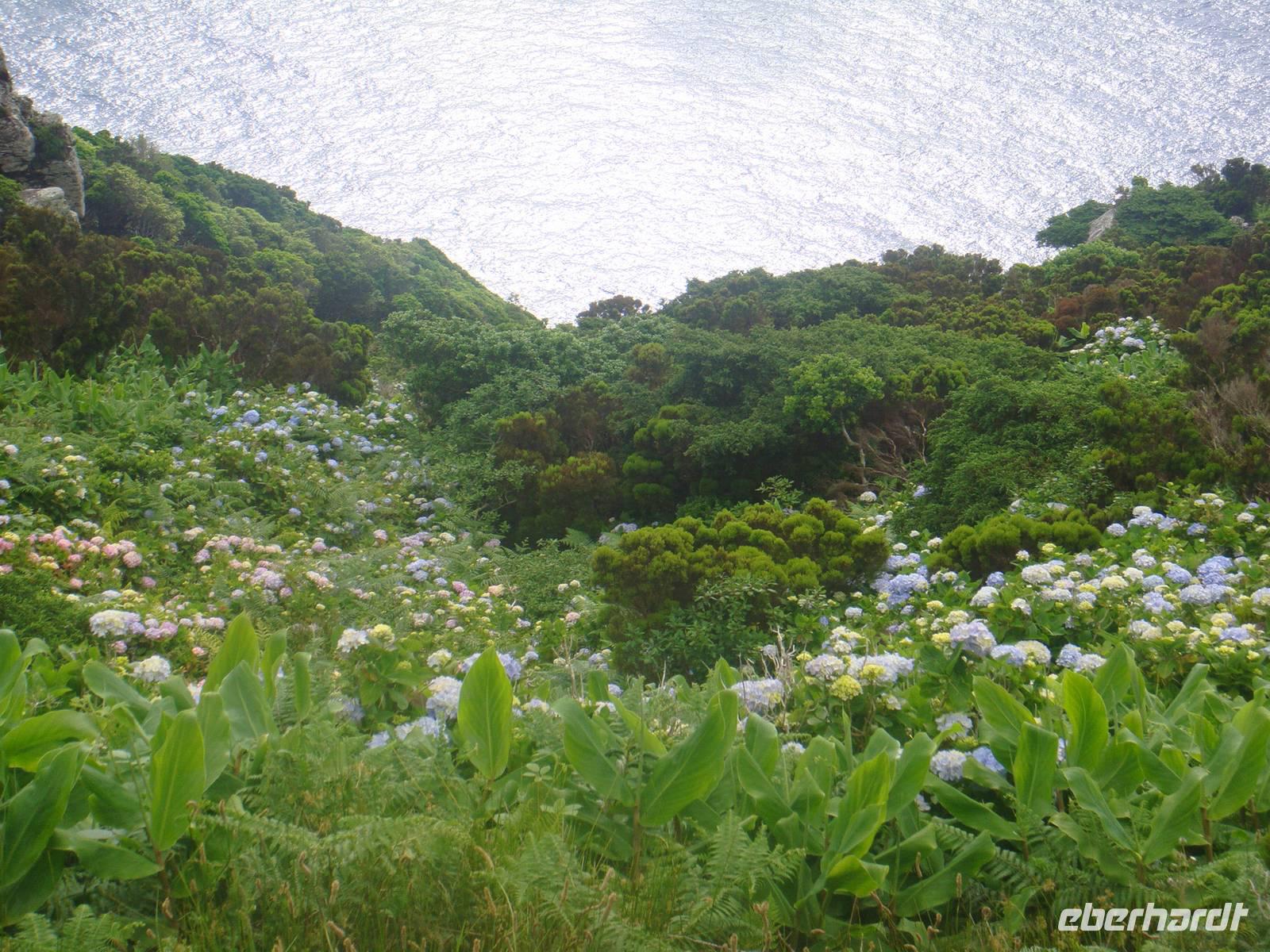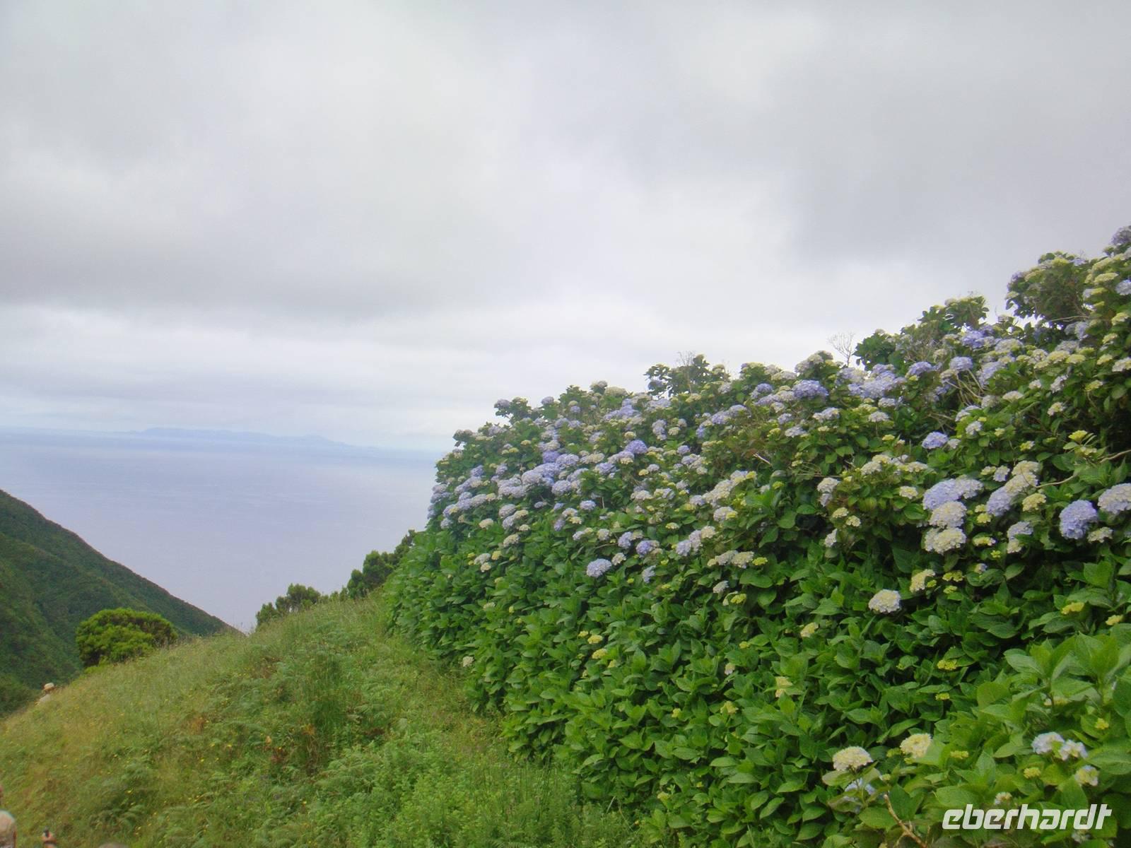 Auf unserer Wanderung steigen wir entlang des alten Inselweges eine bewaldete Steilwand hinnauf , passieren mehrere Wasserfälle, bestaunen die wunderschönen Hortensienhecken und genießen den Blick auf den letzten europäischen Felsen vor Amerika und auf den Leuchtturm von Albarnaz.