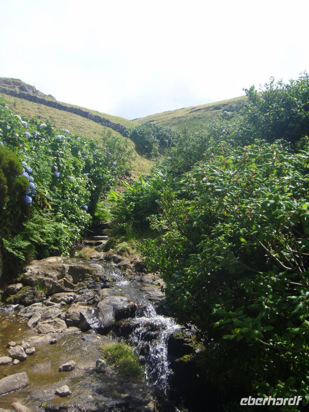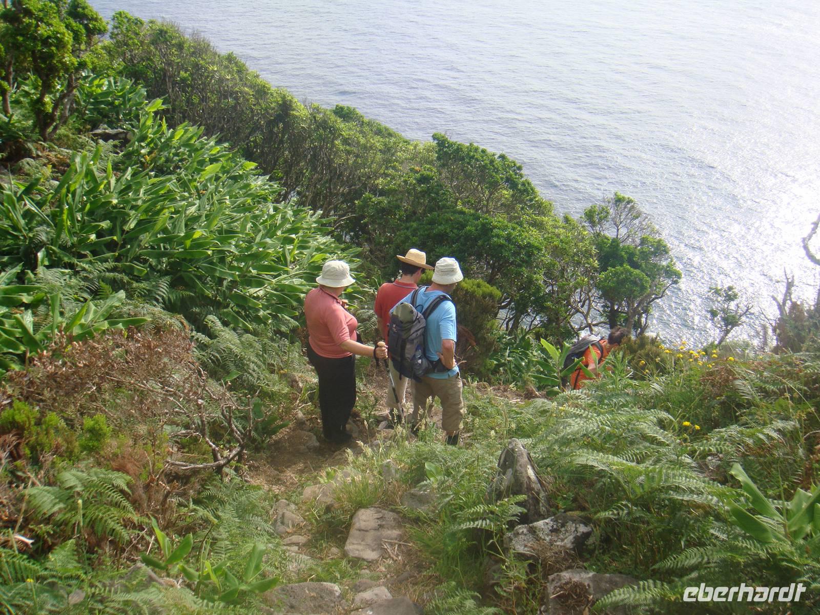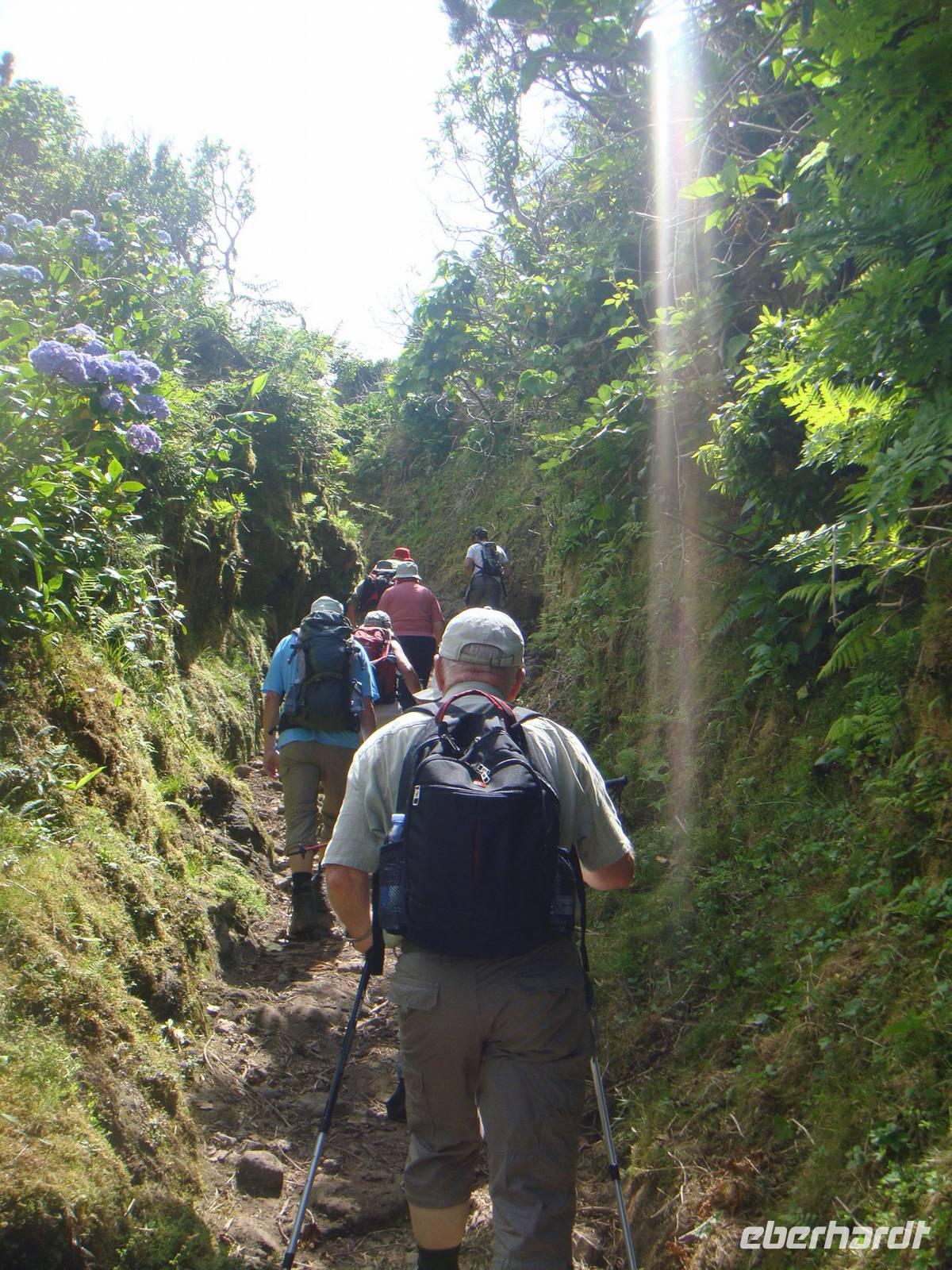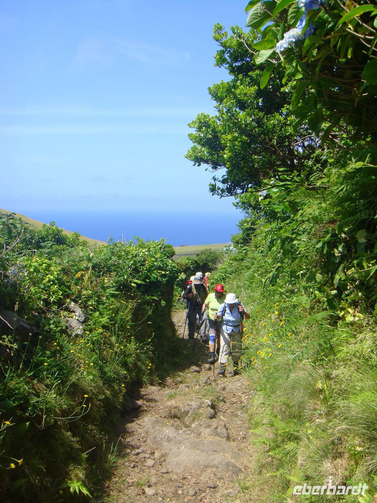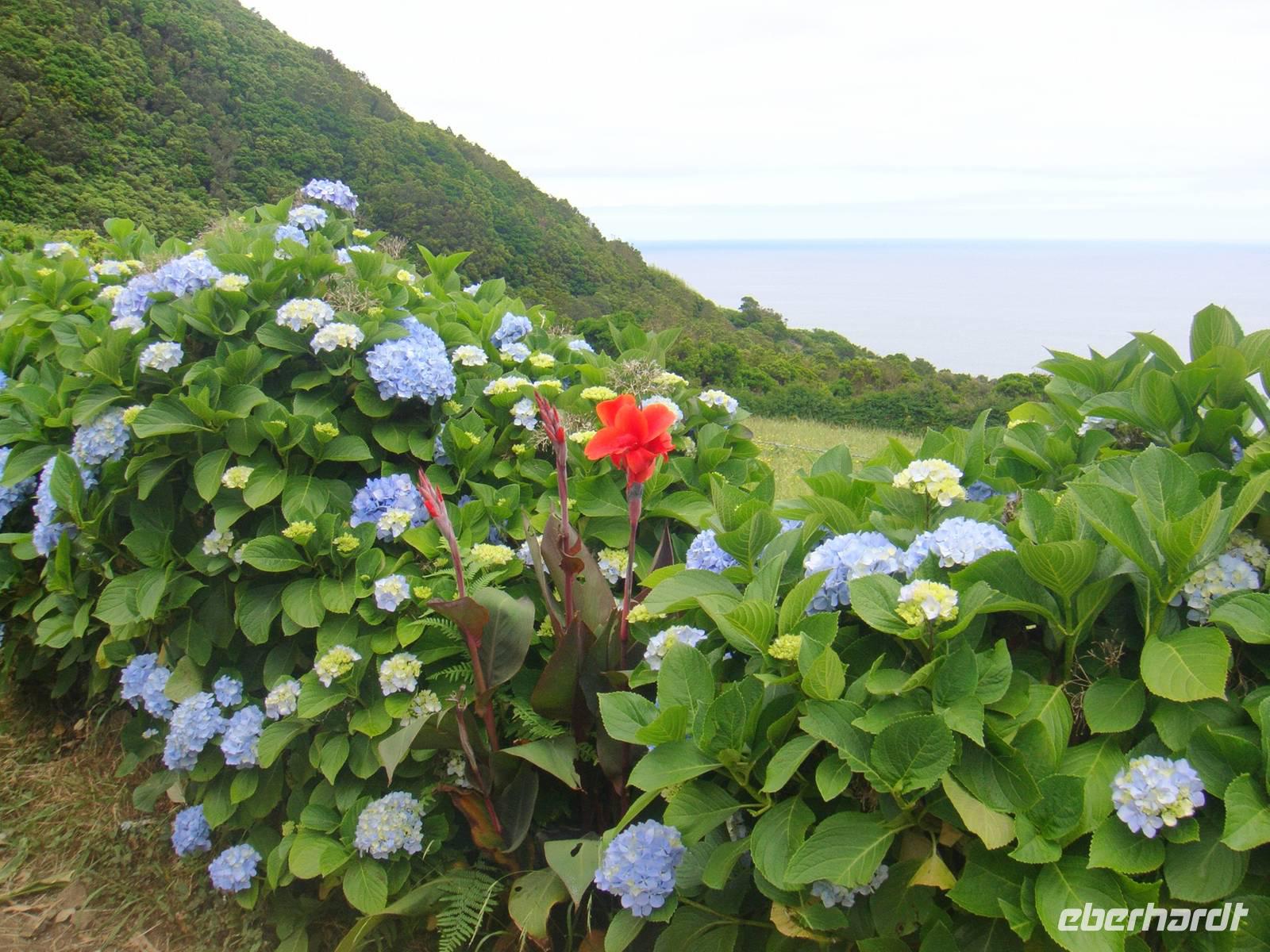 Auf unserer Wanderung steigen wir entlang des alten Inselweges eine bewaldete Steilwand hinnauf , passieren mehrere Wasserfälle, bestaunen die wunderschönen Hortensienhecken und genießen den Blick auf den letzten europäischen Felsen vor Amerika und auf den Leuchtturm von Albarnaz.