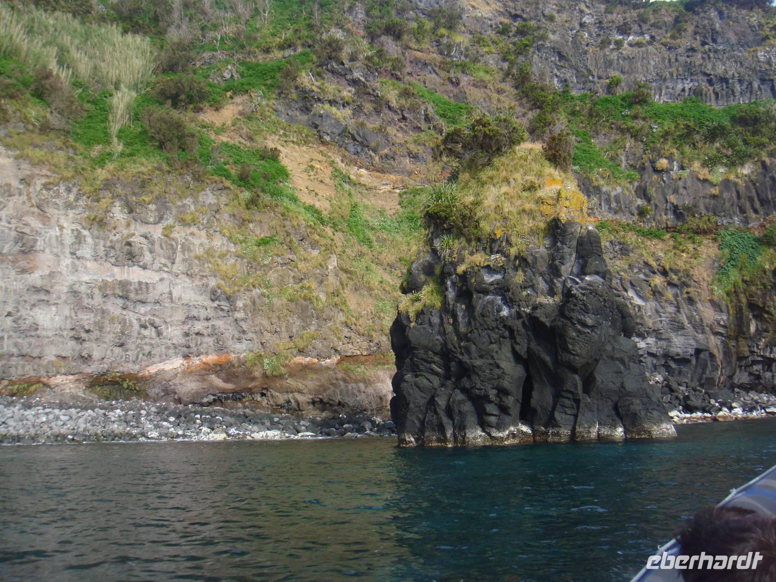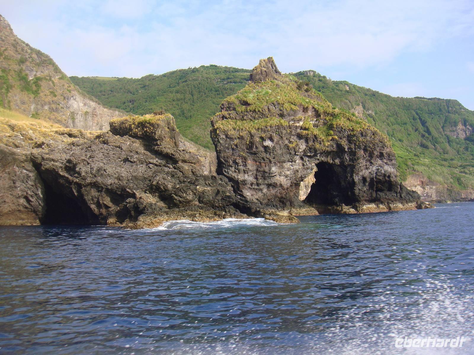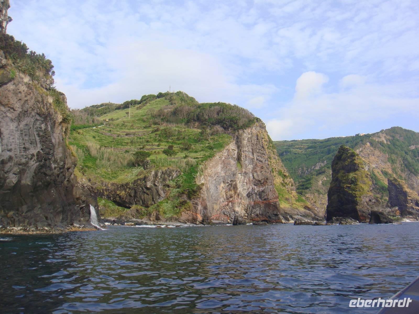 Nach dem Anlegen der Schwimmwesten waren für diese abenteuerliche Bootsfahrt zur Insel Corvo beriet. Während der 1,5 stündigen Fahrt erleben wir die Naturschönheiten entlang der Küste von Flores, mit Wasserfällen, kleinen Höhlen und Basaltfelsen. Entspannt erreichen wir bei strahlendem Sonnenschein die kleinste Azoren-Insel. Hier findet man lediglich ein kleines Dorf mit weniger als 399 Einwohnern. Es gibt nicht viele Gäste die sich in diese reizvolle Abgeschiedenheit verirren. Darüber waren wir nicht unglücklich. Denn so wandern wir ganz allein von Cova Vermehlha bis Vilas Nova do Corvo und genießen unser Picknick an der frischen Luft der Azoren und in idyllischer Ruhe.