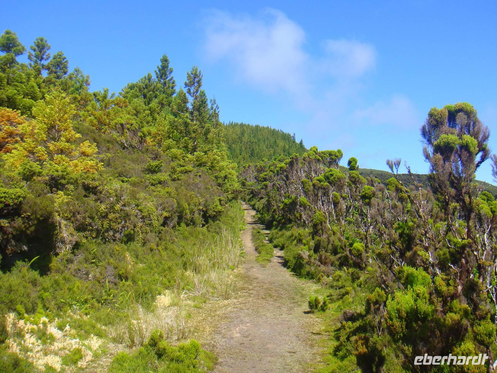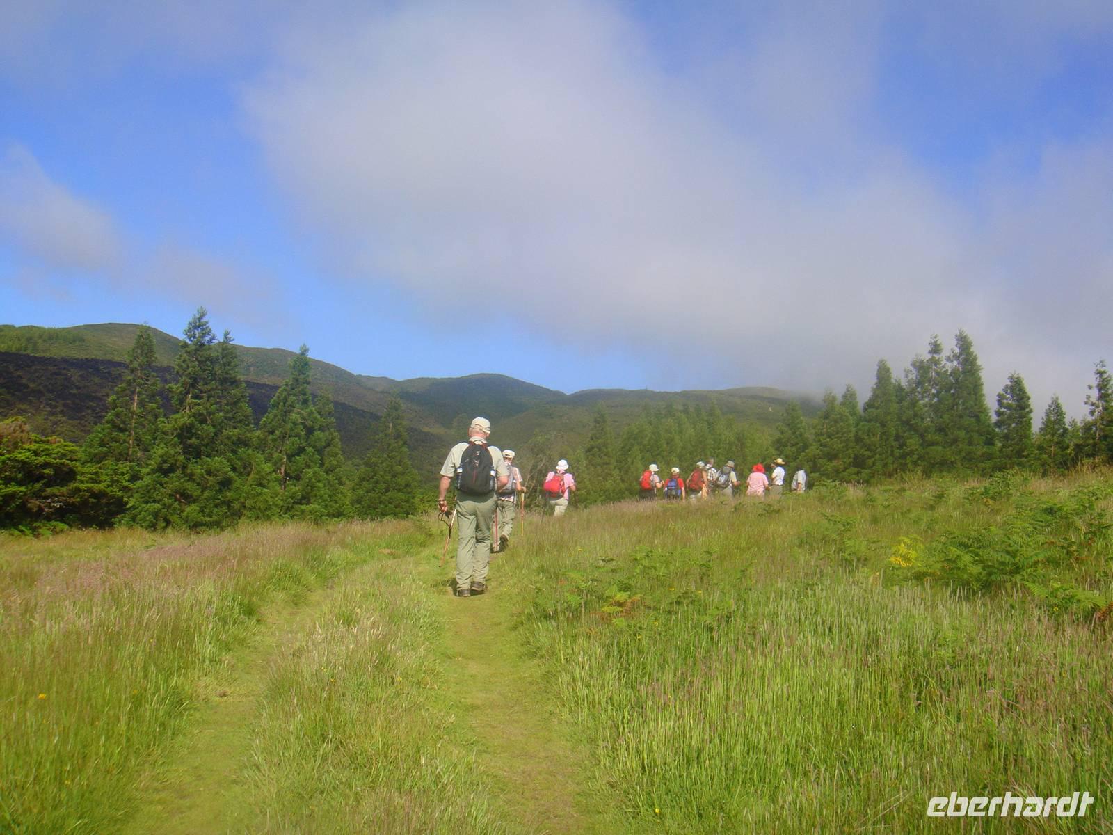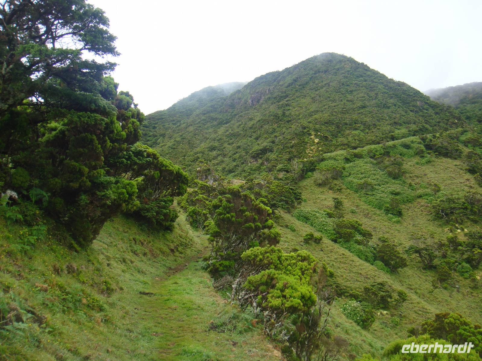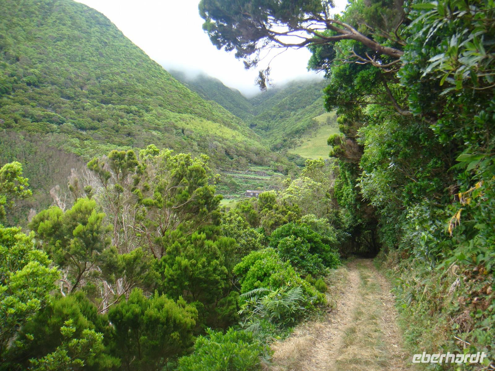 Im kleinen Ort Praia beginnt unsere Tour. Am Anfang wandern wir auf einem befestigten Weg entlang einer Weidezone. Kurze Zeit später erreichen wir einen kleinen Anstieg und waren dann von Eukalyptus Bäumen, Akazien und Zier-Ingwer- und Espanda-Pflanzen umgeben.