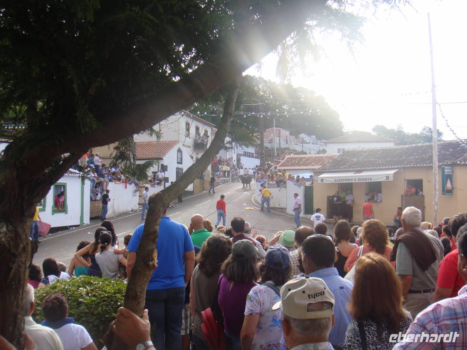 Auf zum Stierkampf! Unser Transfer fährt uns direkt in die Arena. Die Arena sind die Straßen des Dorfes und der „Tourada a Corda" (= der Stierkampf am Seil) ist eine langjährige Tradition in Portugal. Wir lassen uns gemütlich und gemeinsam mit den Bewohnern des Ortes im Garten eines Wohnhauses nieder, versorgen uns mit Getränken und schauen gespannt dem Spektakel zu.
