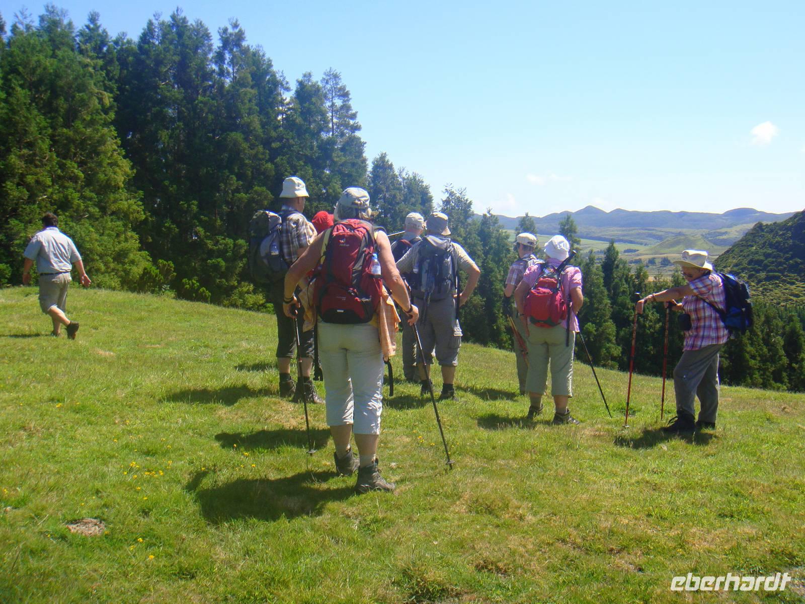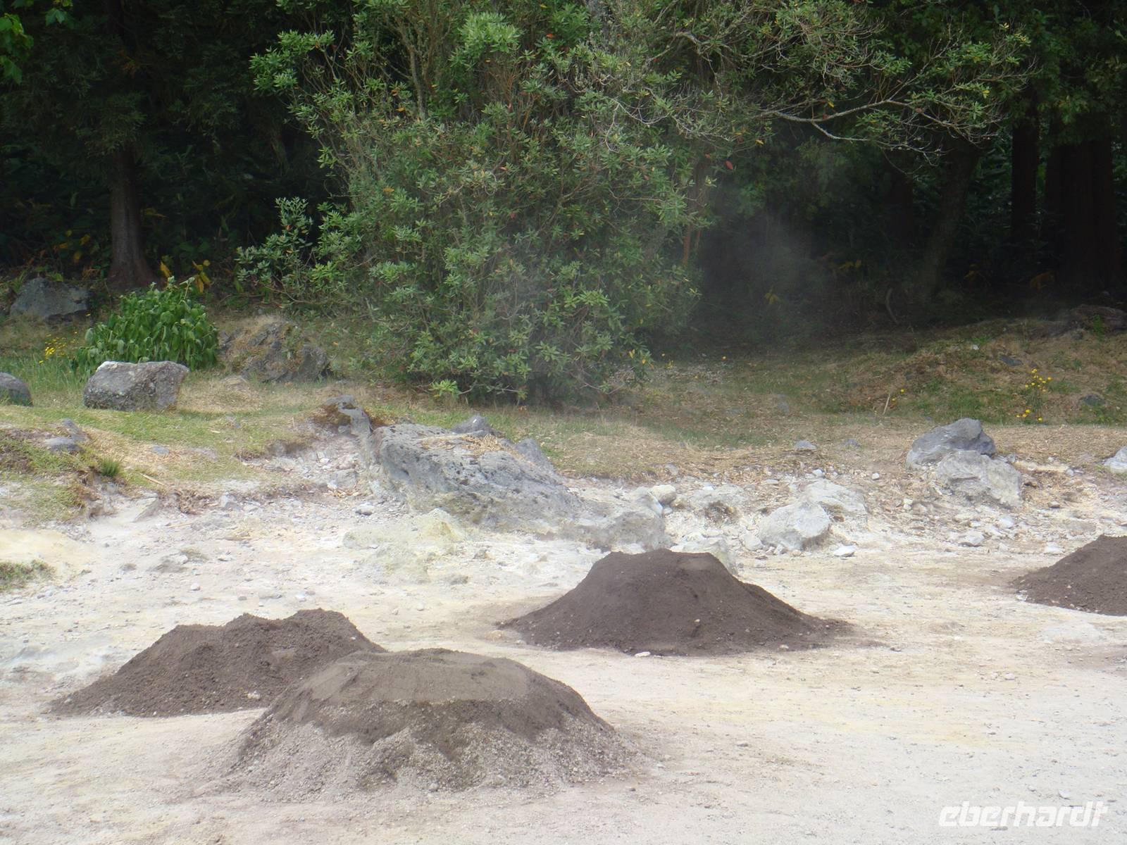 Wir beginnen im Städtchen Furnas. Die Umgebung des Ortes ist durch die geothermischen Vorgänge unter der Oberfläche der Azoren bekannt. Wir wandern am Waldrand entlang vorbei an Wiesen bis wir das Nordwestufer des Sees erreichen. Dort finden wir den Platz an dem die Einheimischen Ihr Nationalessen den „Cozido" in den heißen Quellen kochen. Überall dampft und zischt es aus dem Boden. Wir beobachten wie auch unser Eintopf aus Fleisch, Kartoffeln, Gemüse und noch vielem mehr aus dem heißen Erdloch genommen wird. Bevor wir dies jedoch verzehren können gehen wir durch den Wald entlang am Ufer des Lagoa das Furnas. Wir genießen den Blick auf den See und die prächtigen Villen und deren herrlichen Gärten. Im nächsten Ort werden wir abgeholt und fahren zum Mittagessen.Die Wanderung hat uns hungrig gemacht und wir essen vom Eintopf aus den heißen Erdlöchern.
