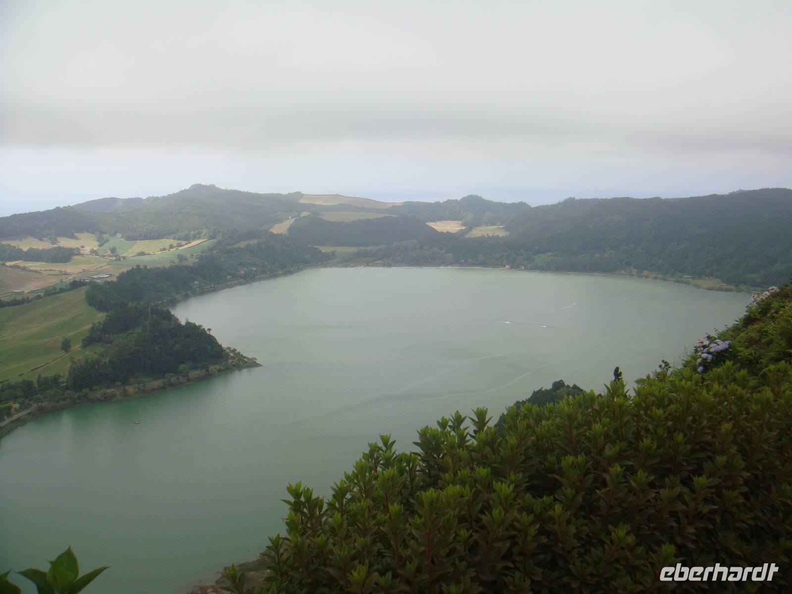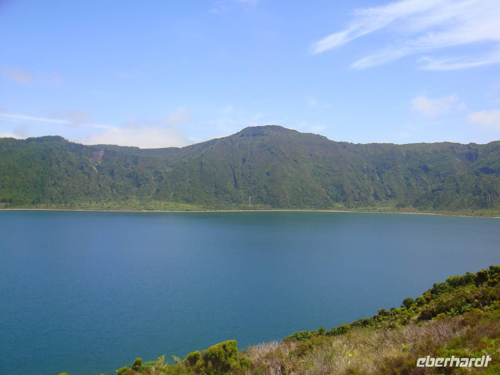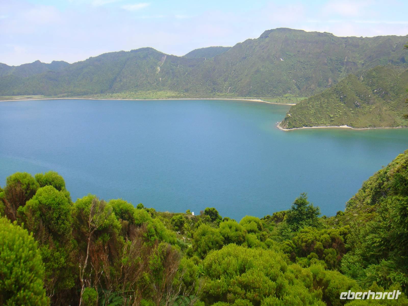 Zur Mittagsstunde erreichen wir den Feuersee „ Lagoa do Fogo". Er liegt auf 600 Metern Höhe und liegt in einem noch komplett naturbelassenen Krater und ist 1563 bei einem Ausbruch des Pico da Sapateira entstanden.