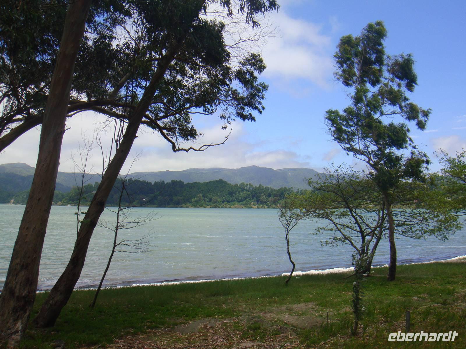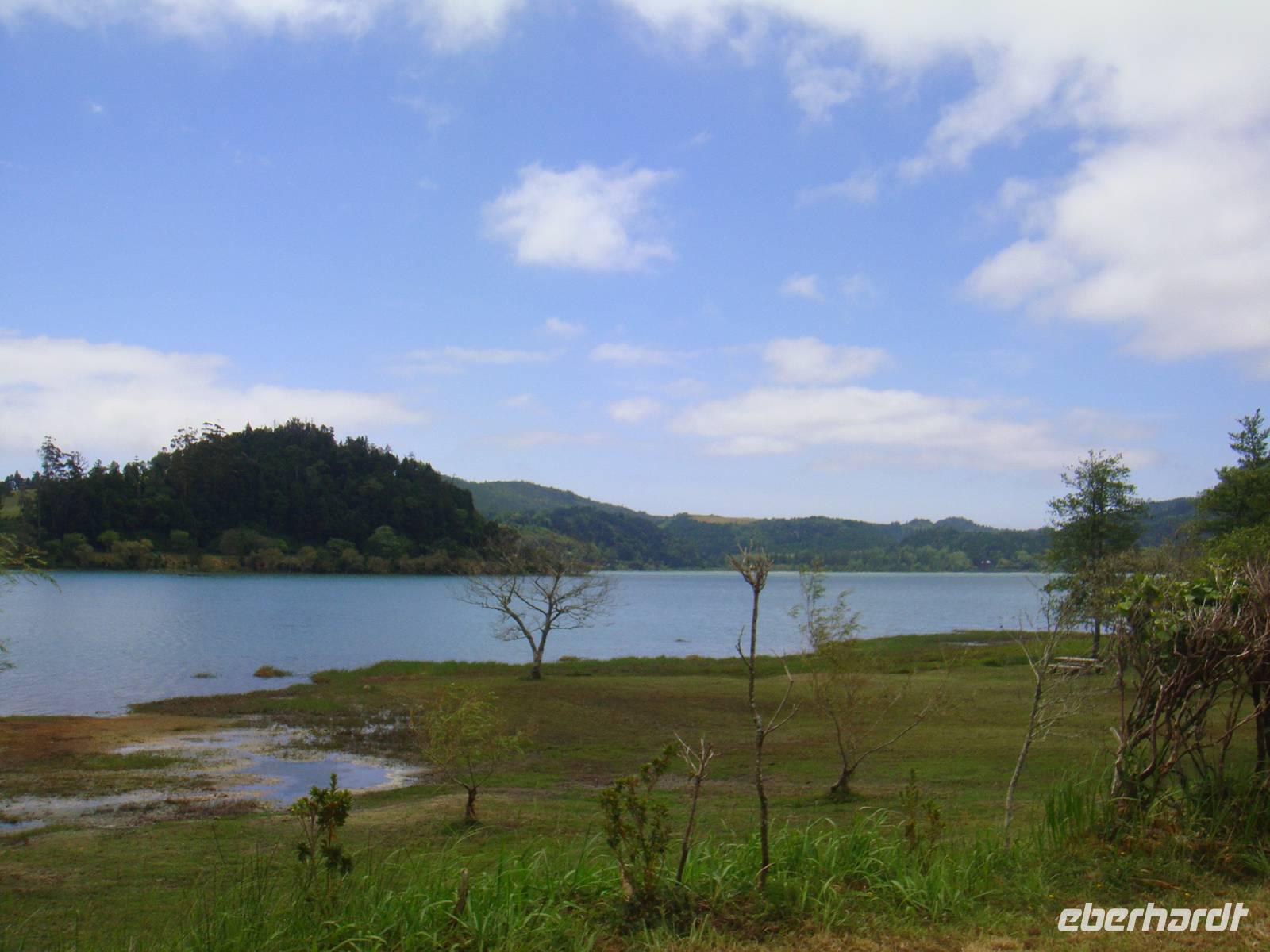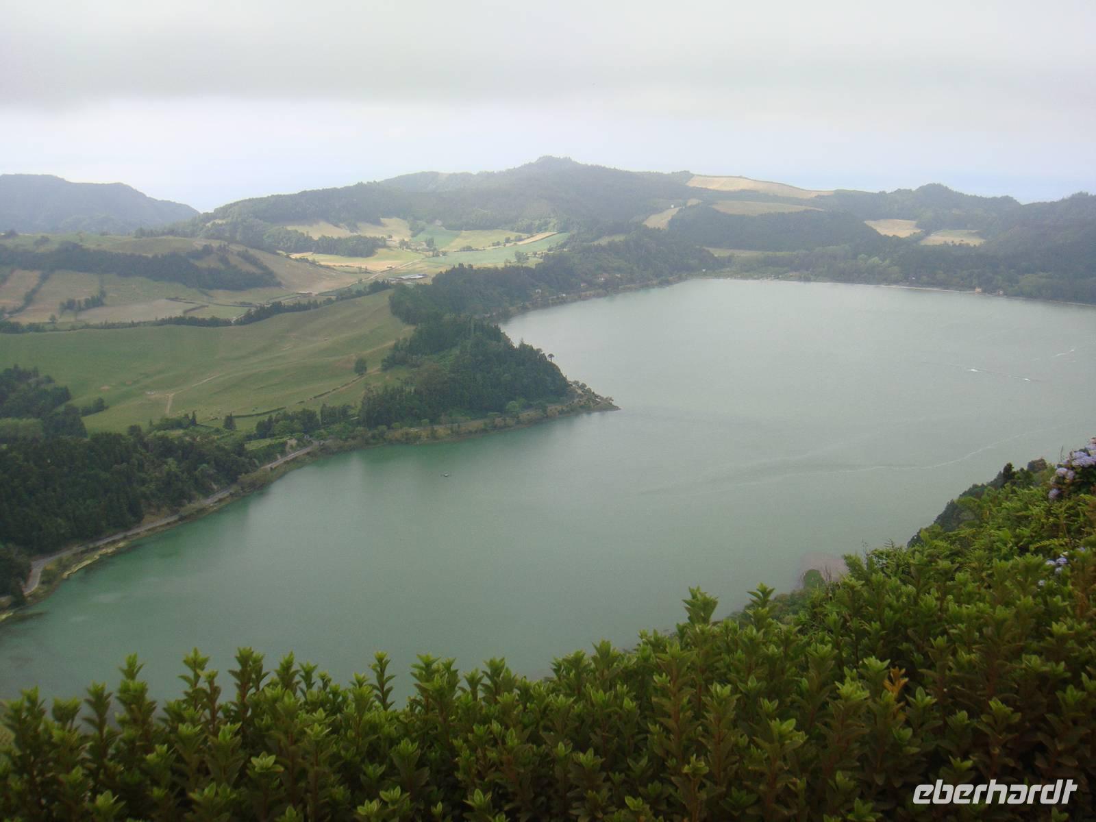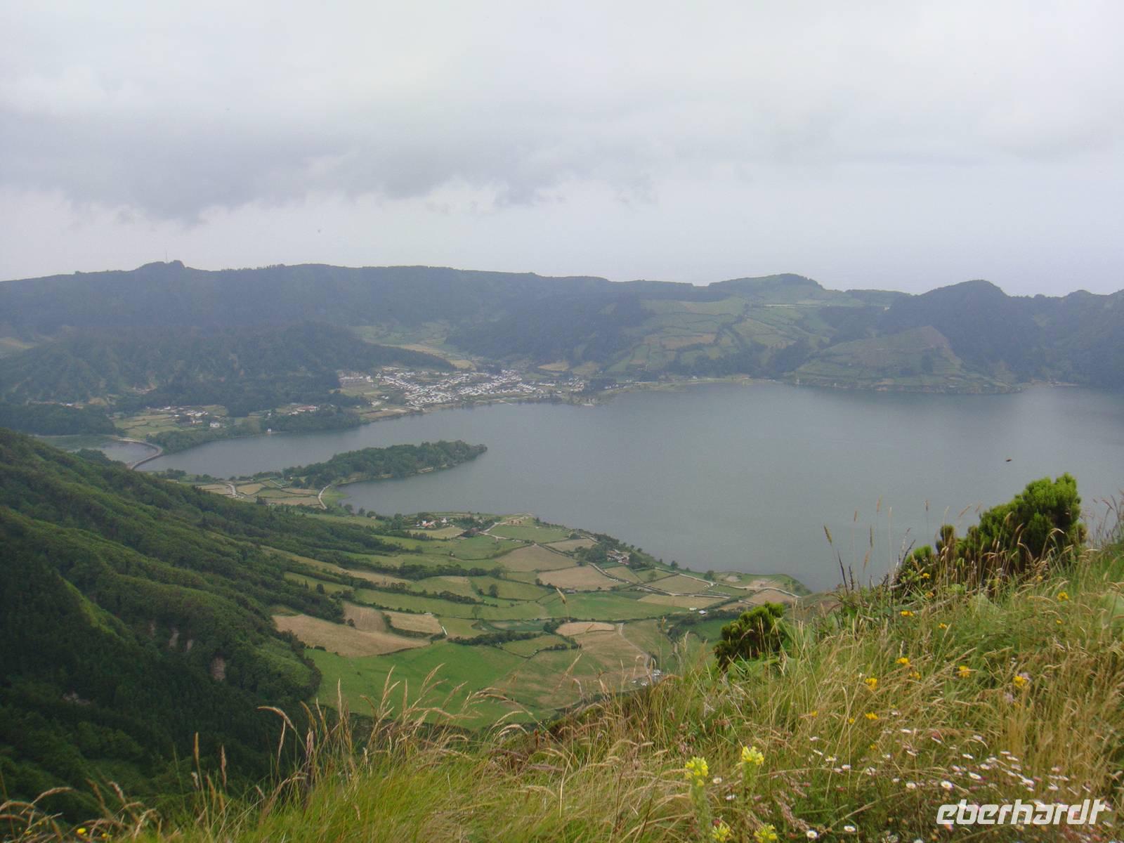 Zur Mittagsstunde erreichen wir den Feuersee „ Lagoa do Fogo". Er liegt auf 600 Metern Höhe und liegt in einem noch komplett naturbelassenen Krater und ist 1563 bei einem Ausbruch des Pico da Sapateira entstanden.
