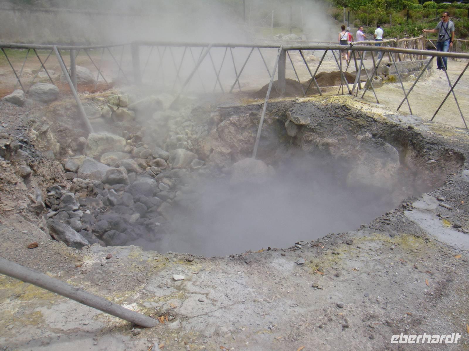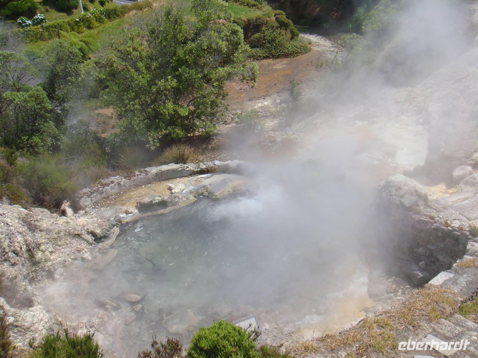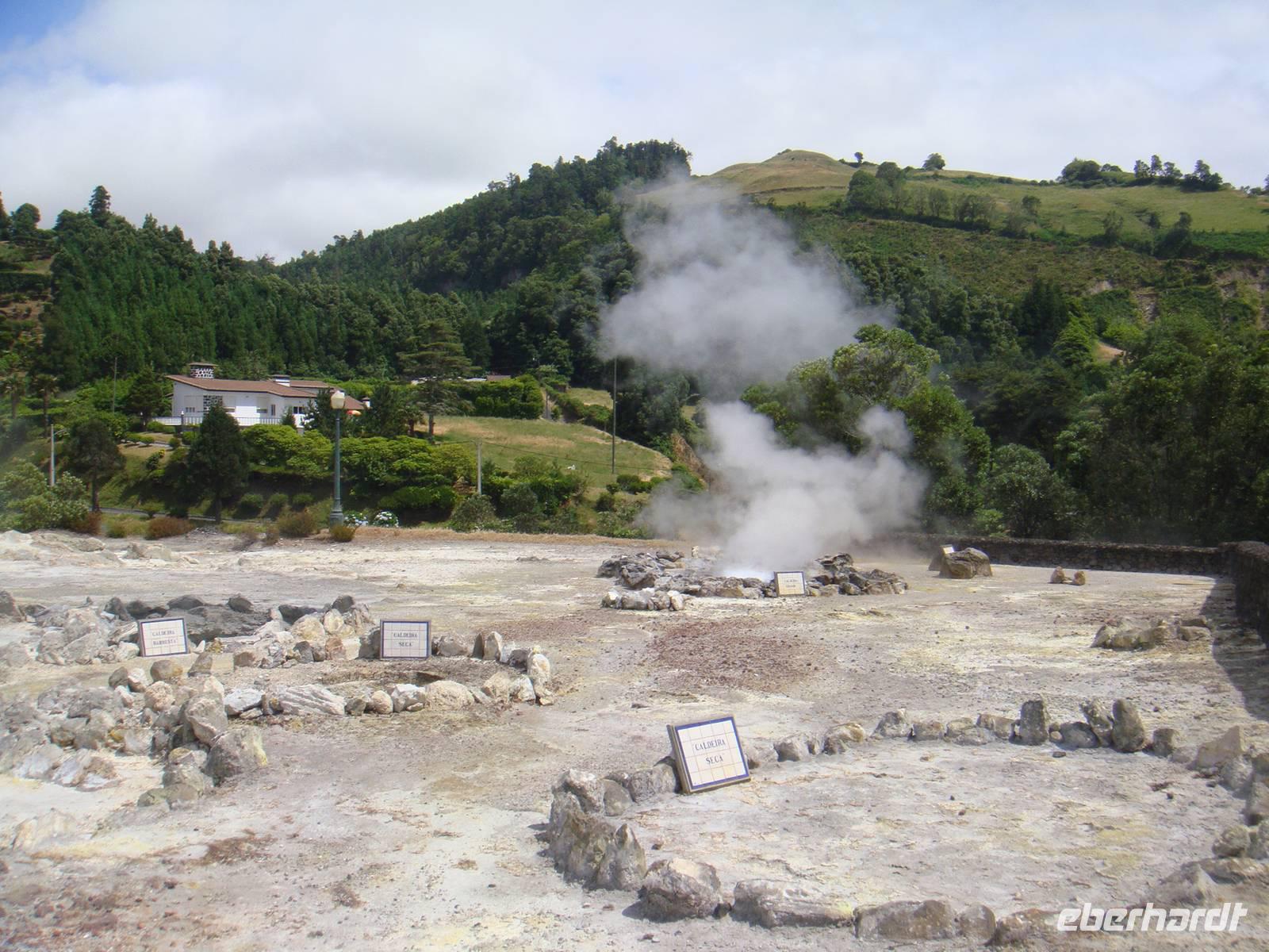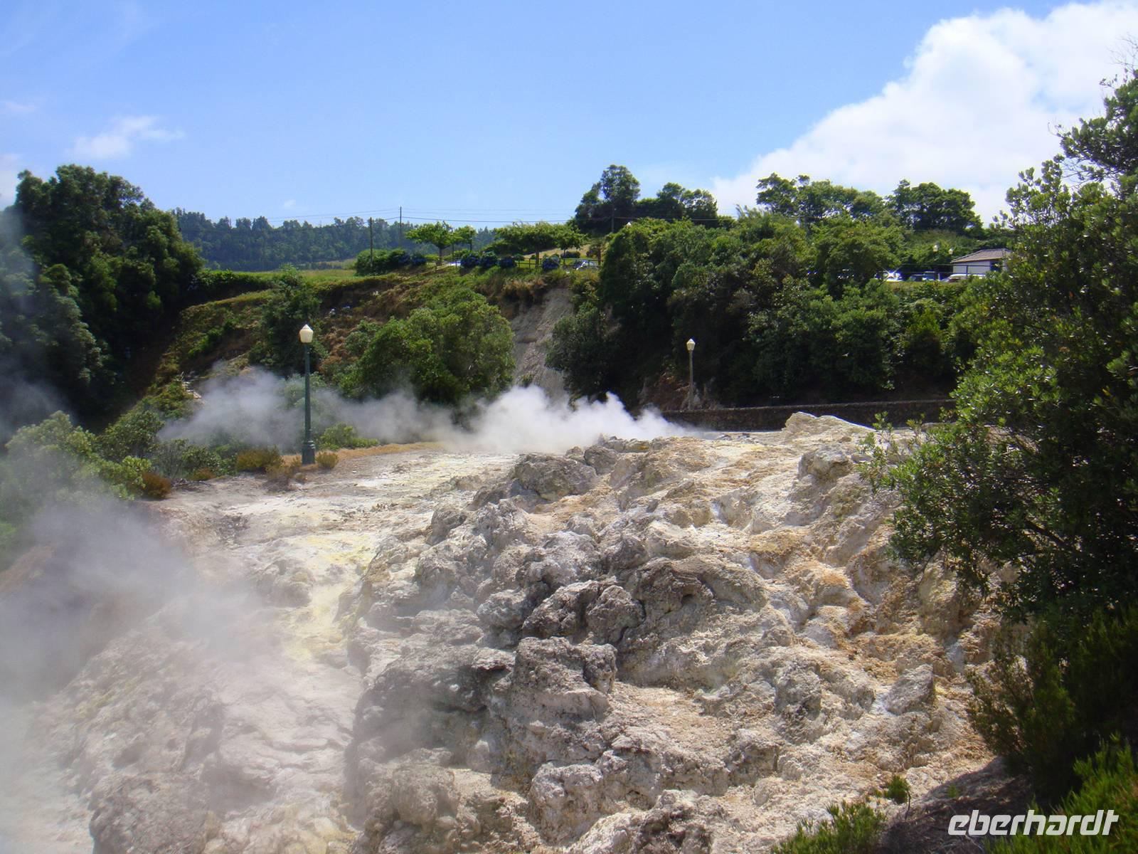 Nach dem Mittagessen besuchen wir die Caldeiras im Ort Furnas, die wegen Ihrer aufsteigenden Dampfschwaden nicht zu übersehen sind. Die größte sprudelt ca. 60 l Wasser pro Minute mit einer Temperatur von 98 Grad Celsius.