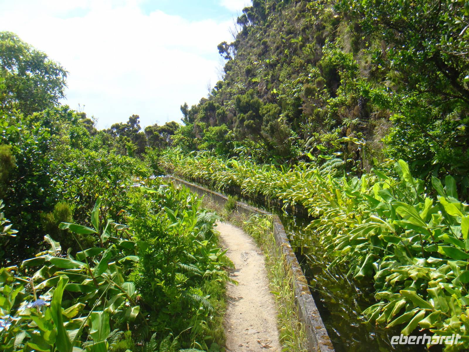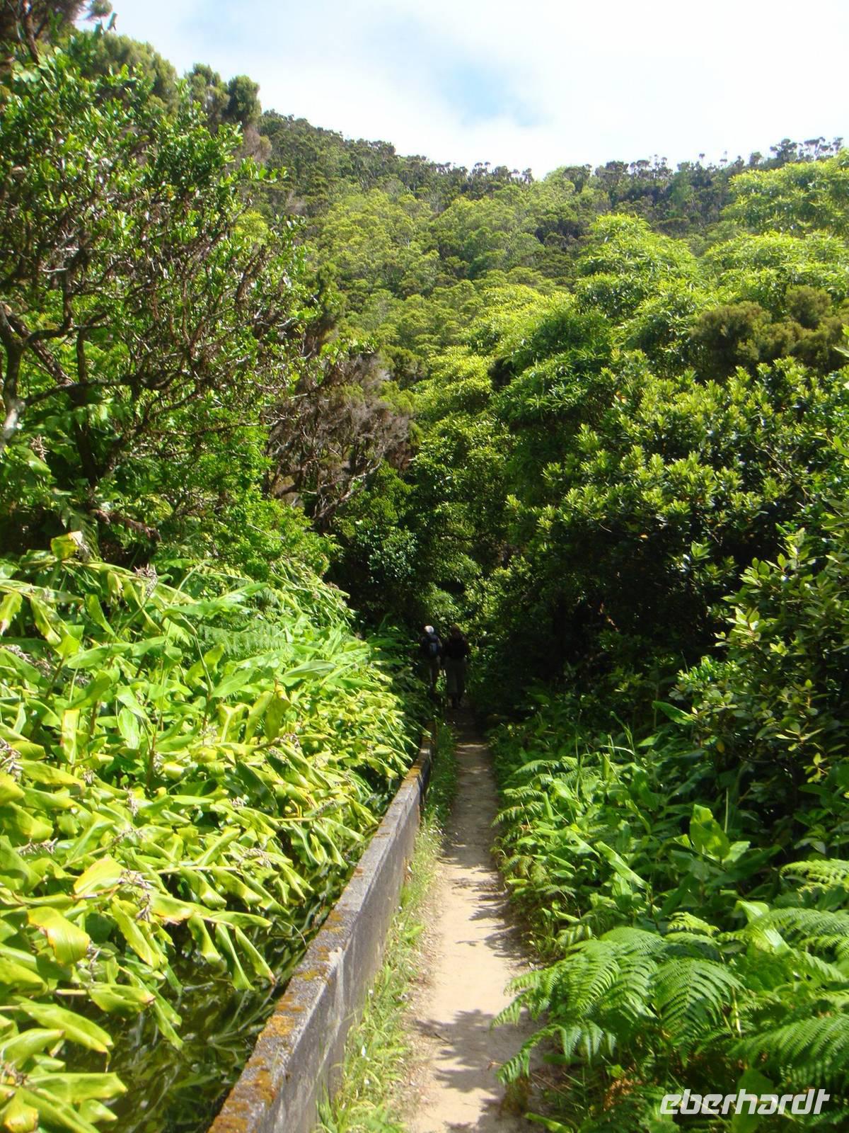 Bei etwas bedeckten Himmel starten wir im Westen der Insel entlang einem alten Aquaduct. Nach einem kleinen ersten Anstieg, werden wir mit einem leider etwas diesigen Blick auf den weiten Atlantik belohnt.