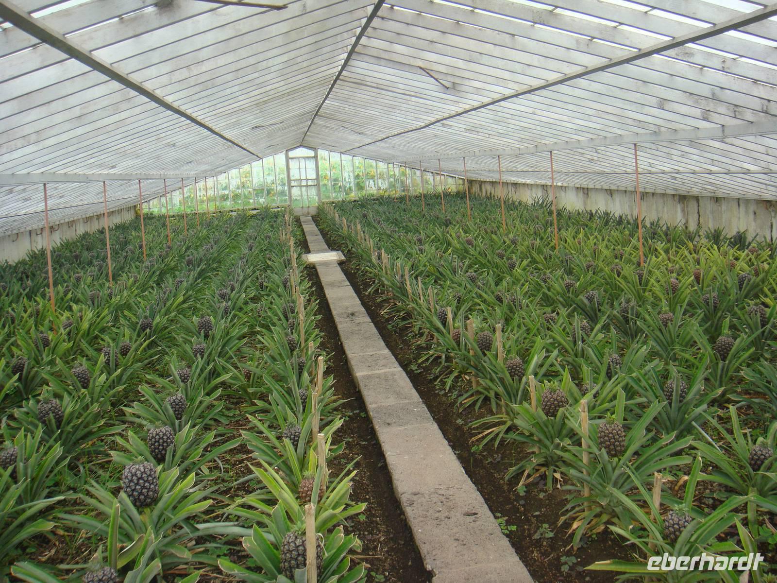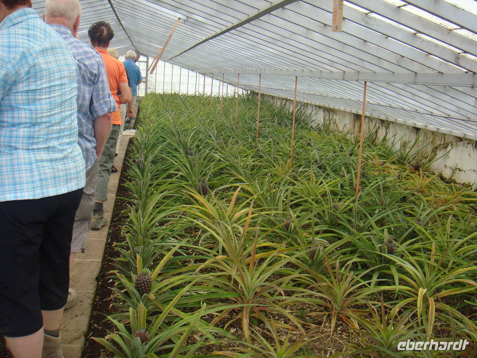 So langsam ging eine erlebnisreiche Wanderung zu Ende und unser Bus holt uns nach einer weiteren Stunde Marsch wieder ab. Unser letzter Halt für diesen Tag ist auf einer Ananasplantage. Auf der wir sehr beeindruckt darüber sind, wie mühevoll es ist diese süße Frucht anzubauen. Wir bewegten uns auf dieser Plantage frei und Jose erläutert uns die drei Phasen des Anbaus. Die Wärmeglocke, die Gewächshäuser und das Räuchern.