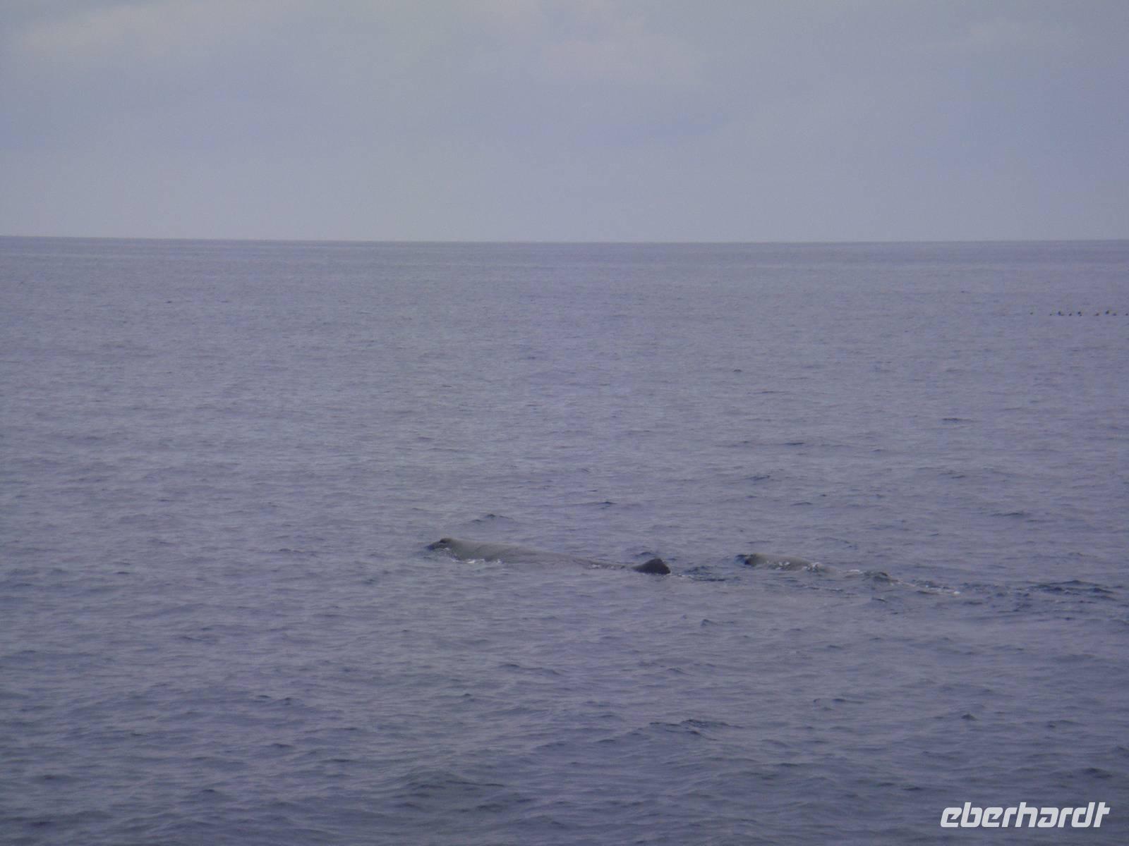 Schon nach kurzer Fahrt sind wir von Delfinen umschwärmt und wir können diese gut sehen, denn sie sind neugierig und kommen dicht an das Boot heran oder tauchen hinweg. Wir fahren noch weiter hinaus und haben das große Glück eine Pottwal-Mutter mit ihrem Pottwal-Baby zu beobachten. Ab jetzt gibt es ein Blitzlichtgewitter auf das Meer. Wir sind gespannt ob wir nicht nur das Meer fotografiert haben.