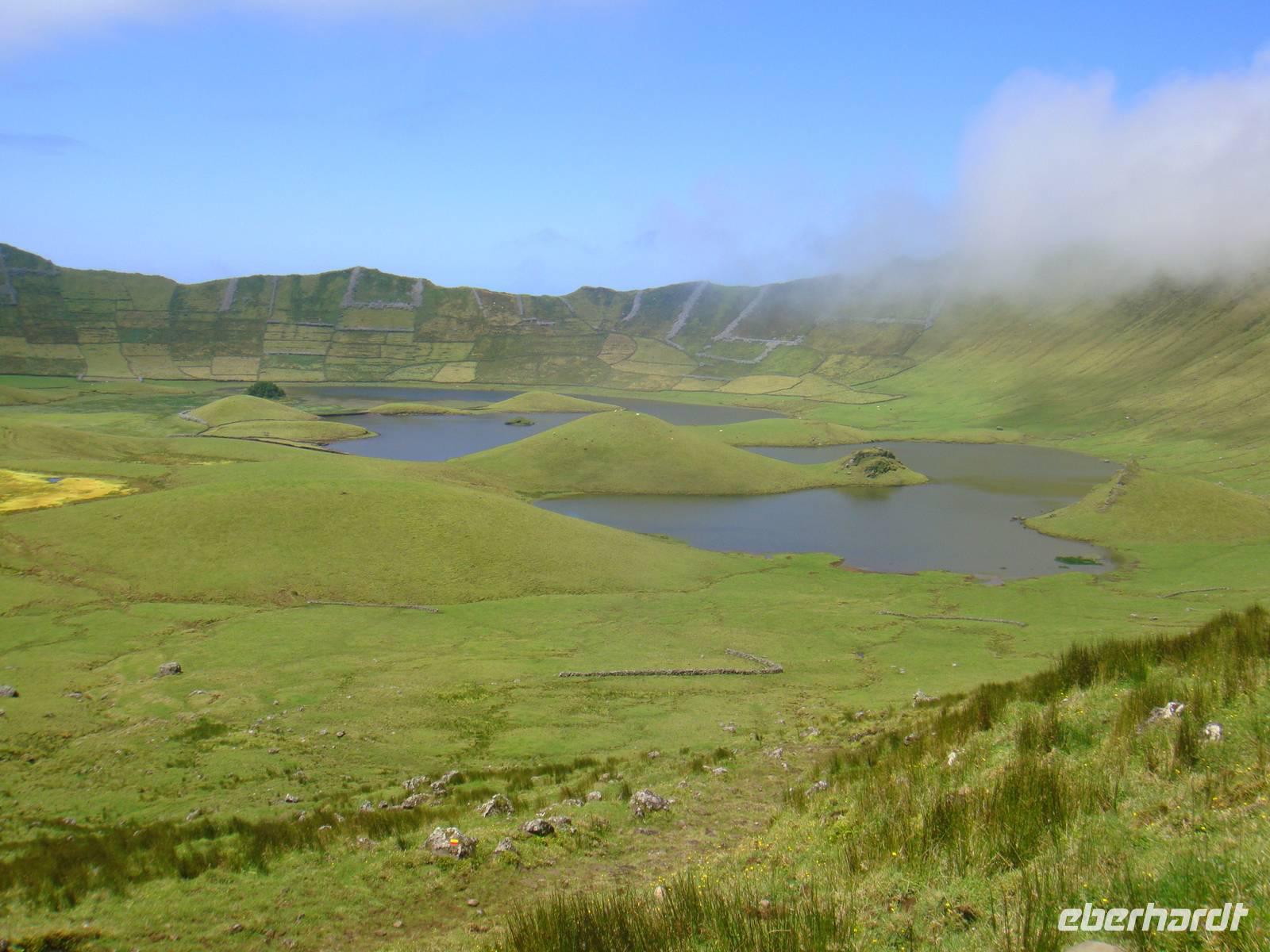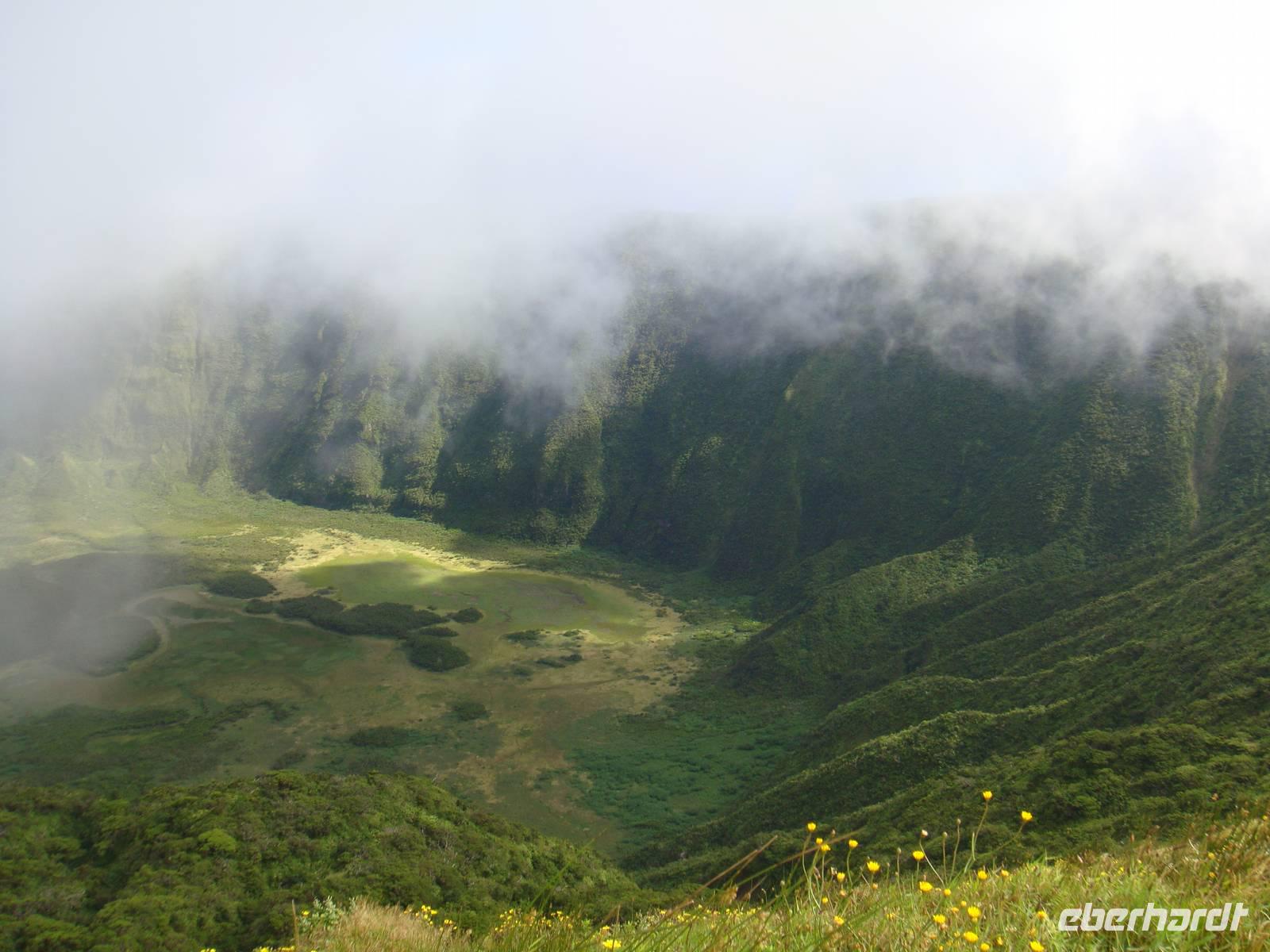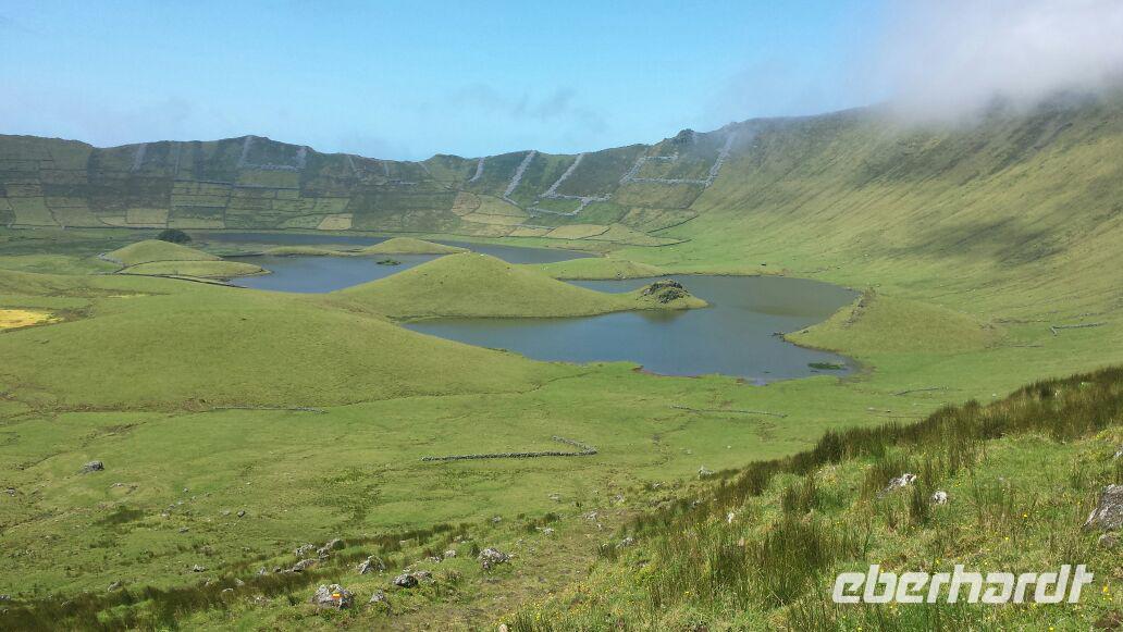 Entlang der Küste werden uns Grotten, Höhlen und Wasserfälle gezeigt. Wir genießen die Überfahrt bei bestem Wetter und erreichen nach ca. 1,5 Stunden die Insel „Corvo". Eine kleine Kaffeepause und schon geht es weiter zum Ausgangspunkt der Wanderung. Der Krater von „Caldeirao" empfängt uns im Nebel und kühlen Temperaturen. Wir streifen unsere Jacken über und stürzen uns ins Abenteuer. Nur wenige Minuten später lässt sich die Sonne blicken und alles erstrahlt wie es schöner nicht sein kann. Nach dem steilen Abstieg suchen wir uns ein schönes Plätzen und lassen uns das Picknick in der Natur schmecken. Zurück im Dorf der Inselhauptstadt genießen wir die Ruhe in der die hier nur 430 Bewohner leben.