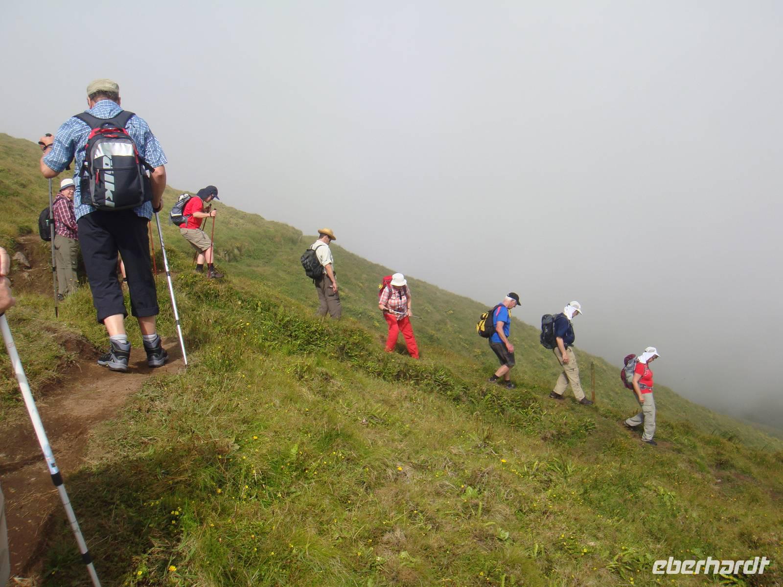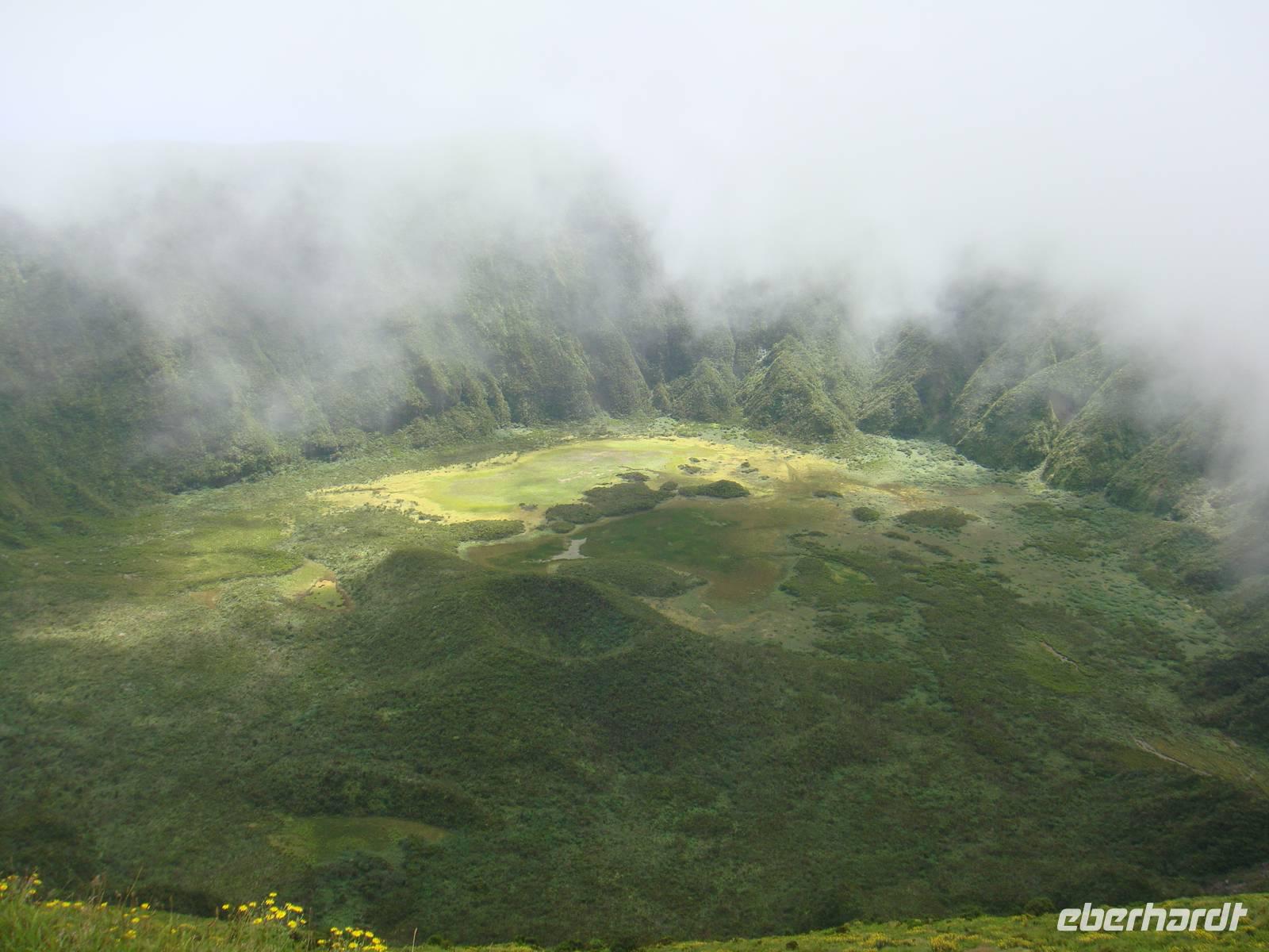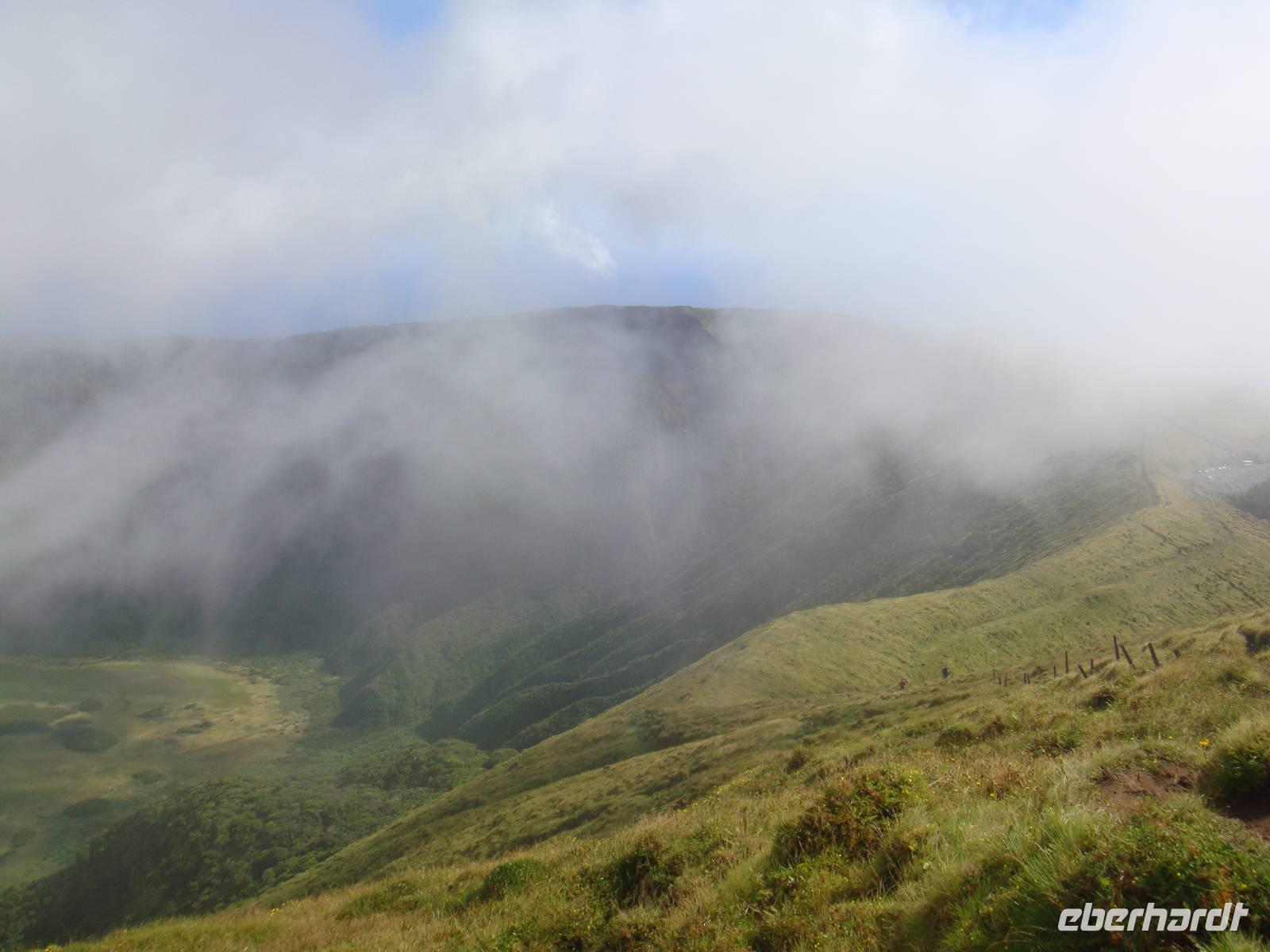 Nach einem köstlichen Frühstück sind wir für unsere erste Wanderung gut gestärkt. Mit Stock, Hut und dem Picknick im Gepäck starten wir um 09:00 Uhr zum Krater von „Caldeira". Auf einer Höhe von ca. 900 Metern erreichen wir im Nebel diesen Naturschutzpark. Jose gibt uns an der Karte noch eine kleine Erklärung und wir entscheiden uns dafür zuerst bergauf zu gehen. Entlang des Kraterrandes begegnet uns unterschiedlichtes Wetter und wunderschöne Ausblicke auf die Nachbarinseln.