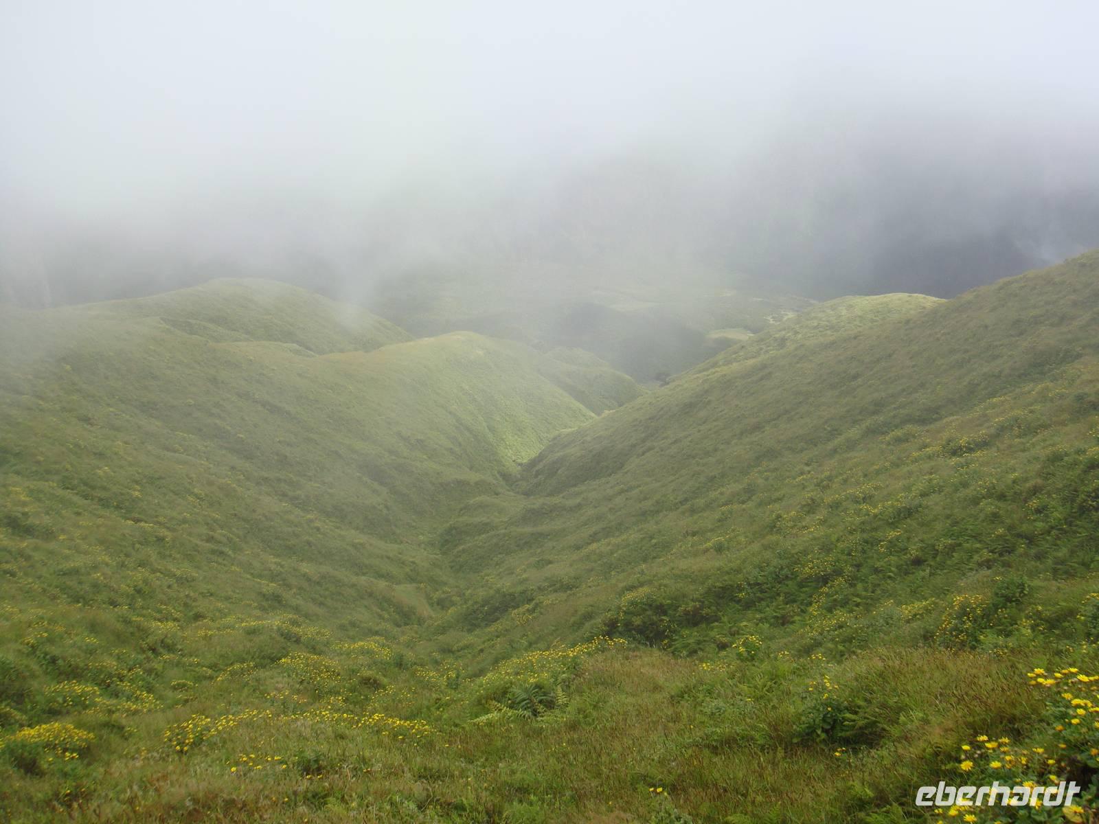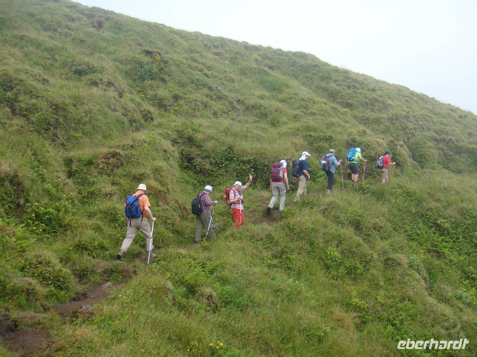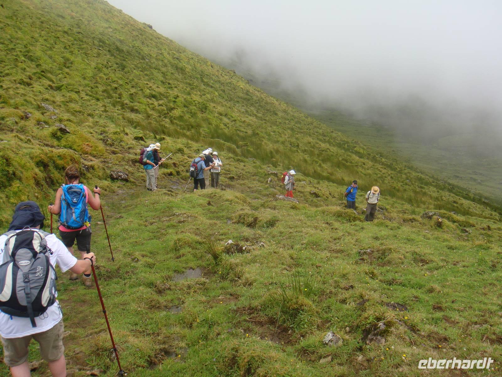 Nach einem köstlichen Frühstück sind wir für unsere erste Wanderung gut gestärkt. Mit Stock, Hut und dem Picknick im Gepäck starten wir um 09:00 Uhr zum Krater von „Caldeira". Auf einer Höhe von ca. 900 Metern erreichen wir im Nebel diesen Naturschutzpark. Jose gibt uns an der Karte noch eine kleine Erklärung und wir entscheiden uns dafür zuerst bergauf zu gehen. Entlang des Kraterrandes begegnet uns unterschiedlichtes Wetter und wunderschöne Ausblicke auf die Nachbarinseln.