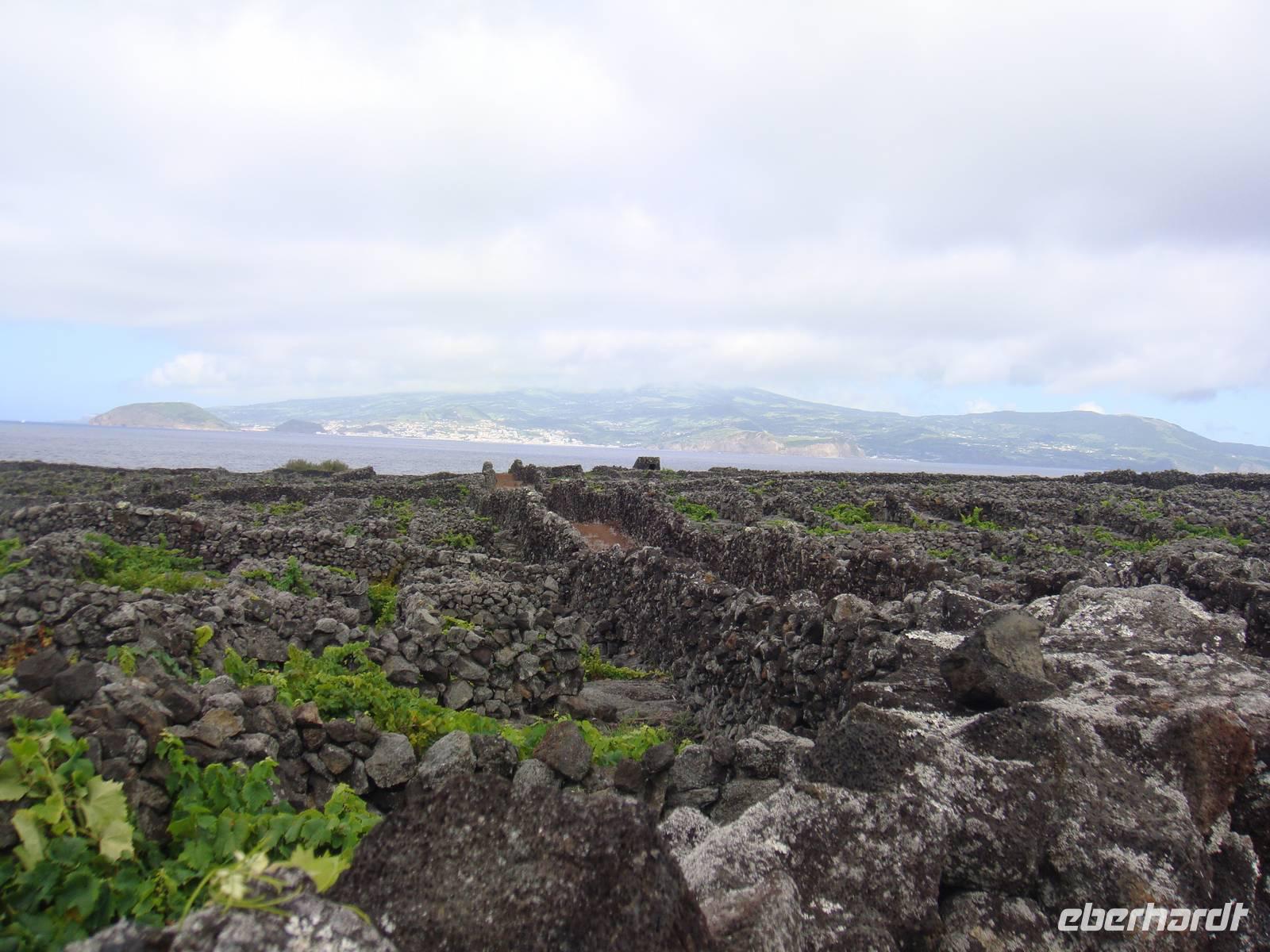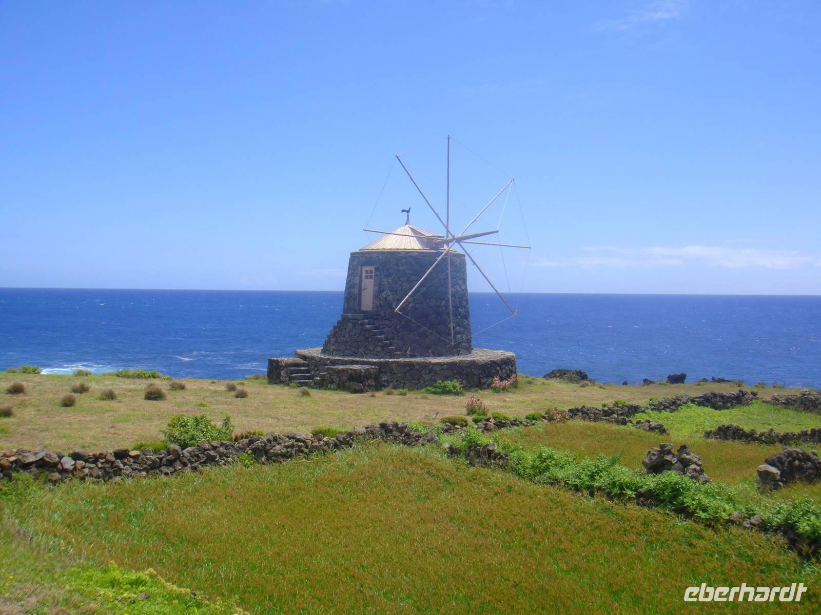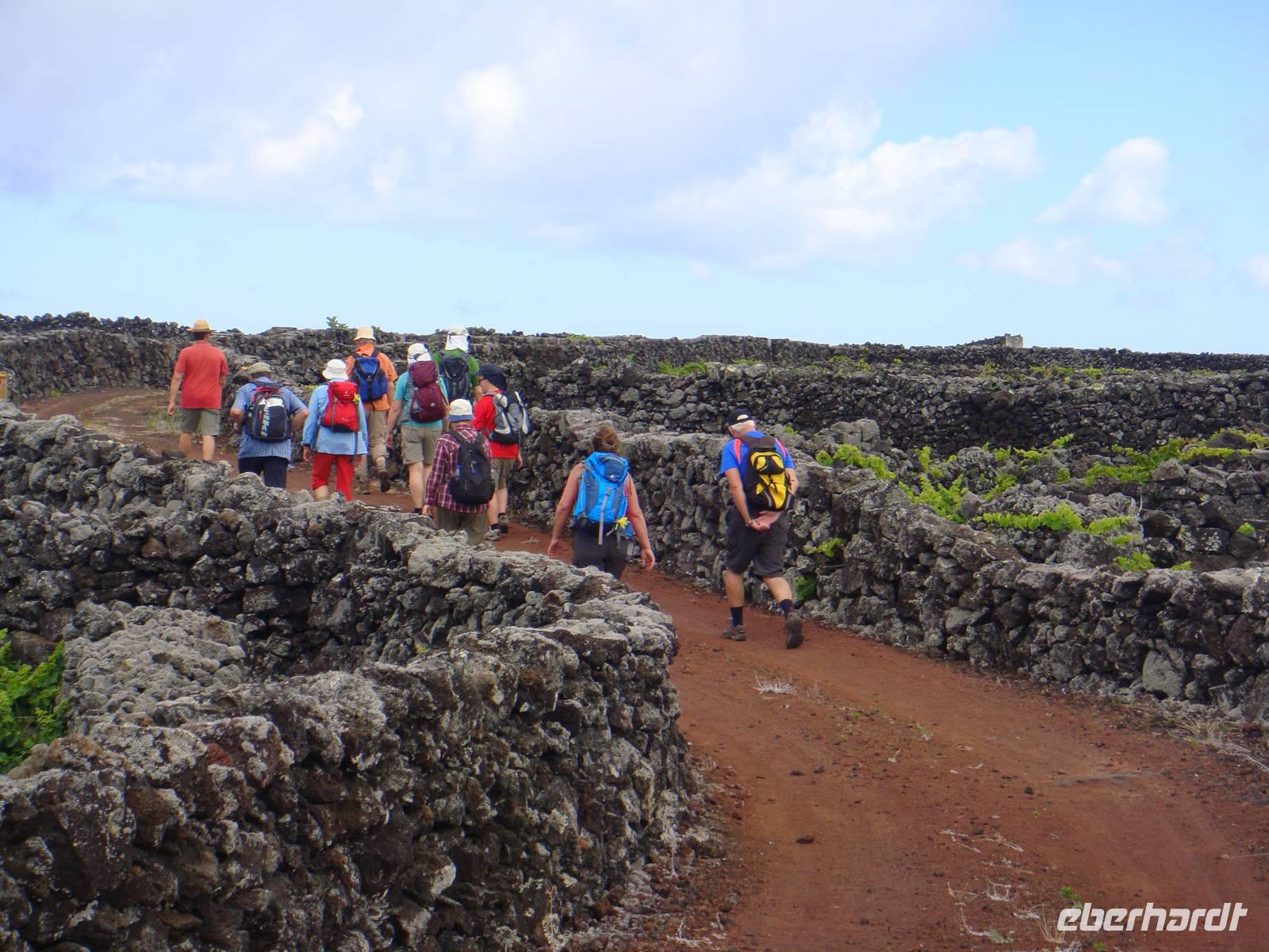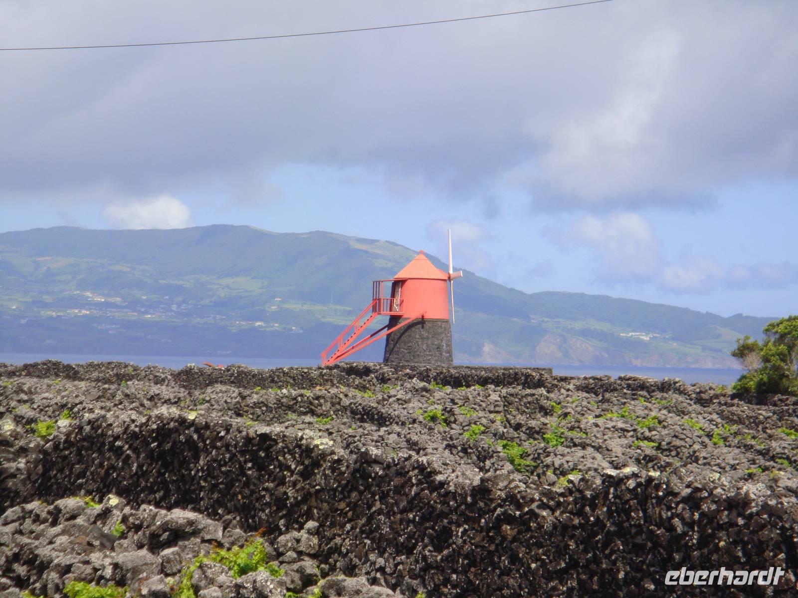 Wir wandern entlang der Küste durch das Weinanbaugebiet „Verdelho". Unser Weg folgt einem alten Versorgungsweg entlang der Legesteinmauern. Unterwegs gibt uns Jose einige interessante Erklärungen zu Pflanzen,Bäumen und früheren Wasserversorgungen. Vorbei an den roten Windmühlen haben wir auch immer wieder den höchsten Berg Portugals den „Pico" im Blick.