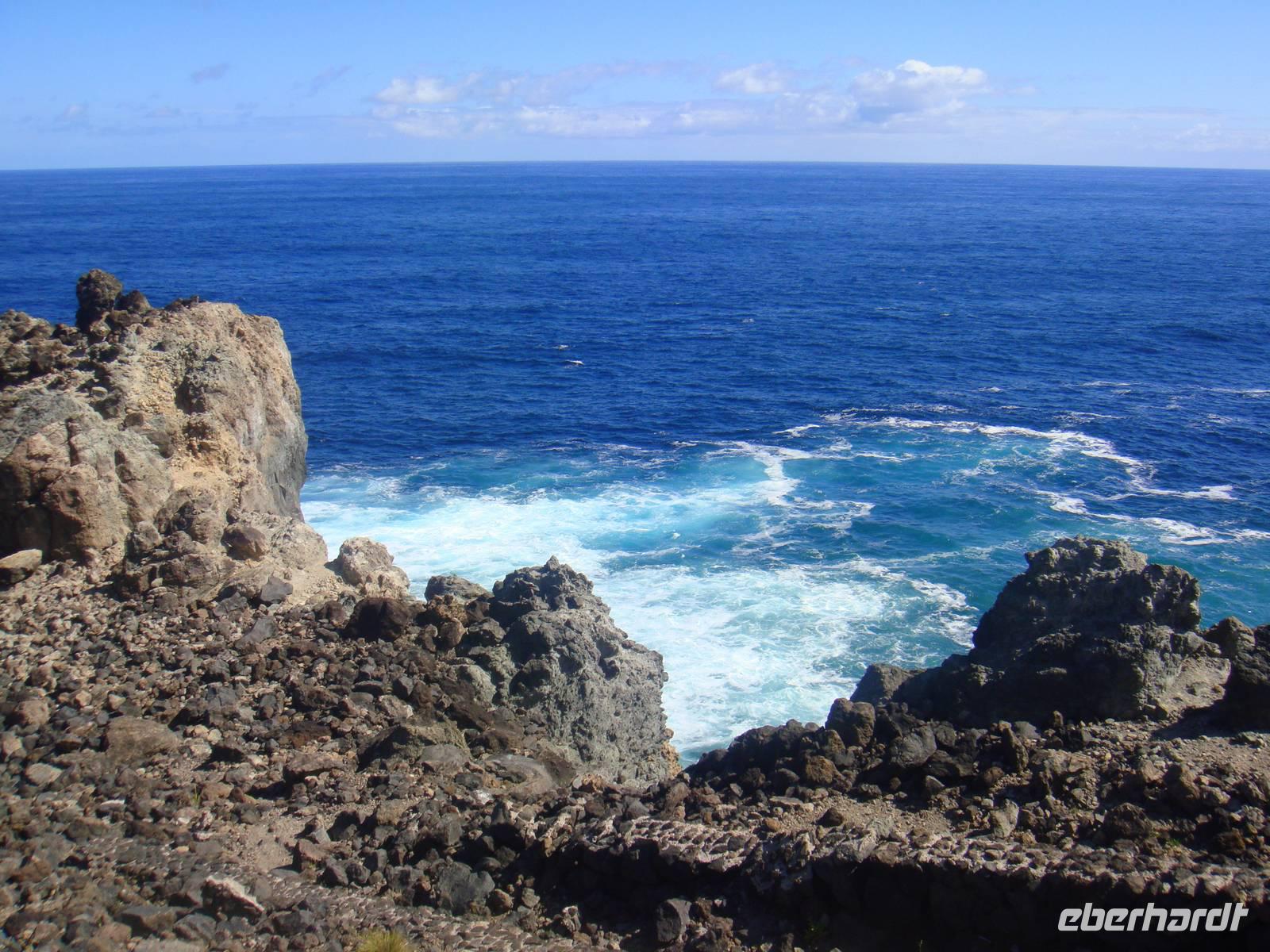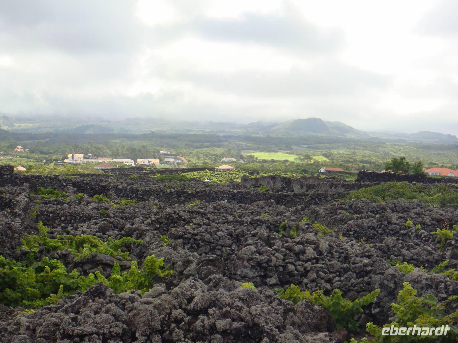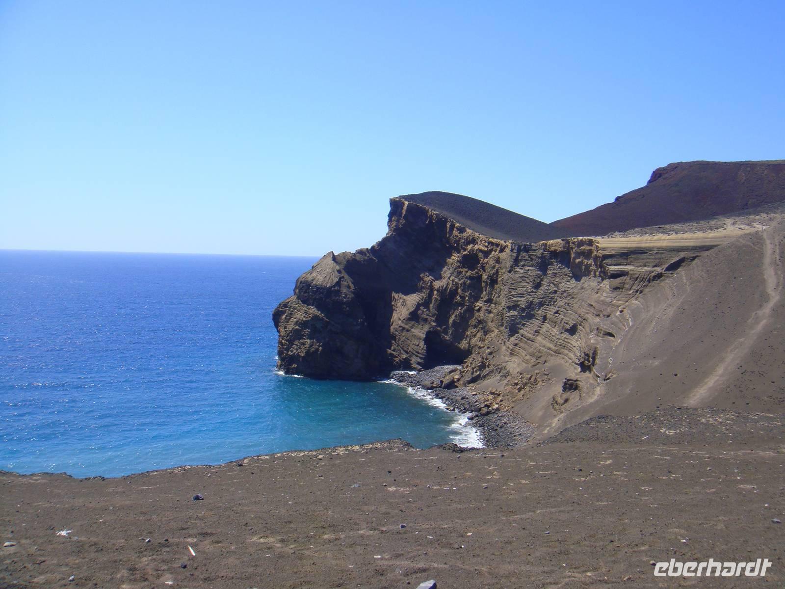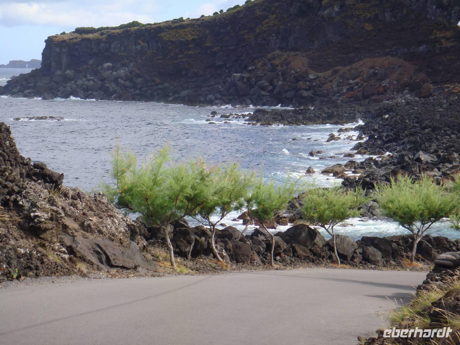 Wir wandern entlang der Küste durch das Weinanbaugebiet „Verdelho". Unser Weg folgt einem alten Versorgungsweg entlang der Legesteinmauern. Unterwegs gibt uns Jose einige interessante Erklärungen zu Pflanzen,Bäumen und früheren Wasserversorgungen. Vorbei an den roten Windmühlen haben wir auch immer wieder den höchsten Berg Portugals den „Pico" im Blick.