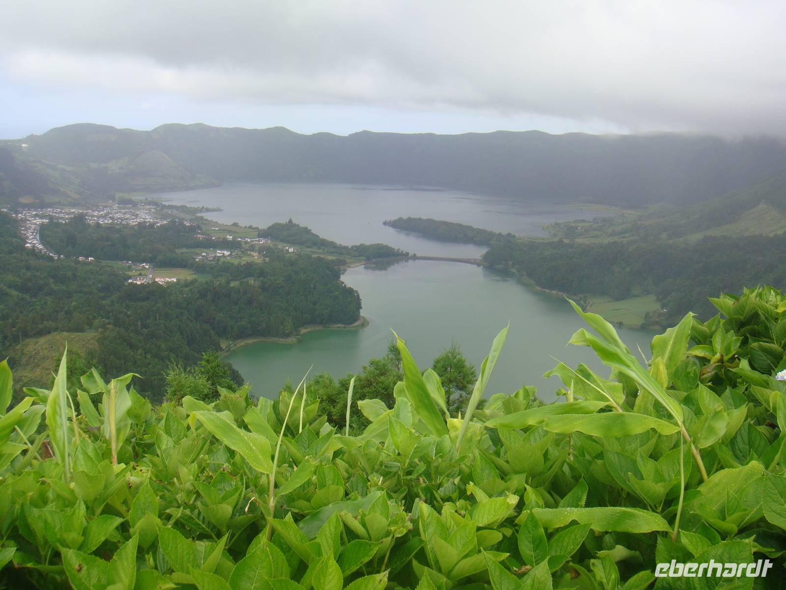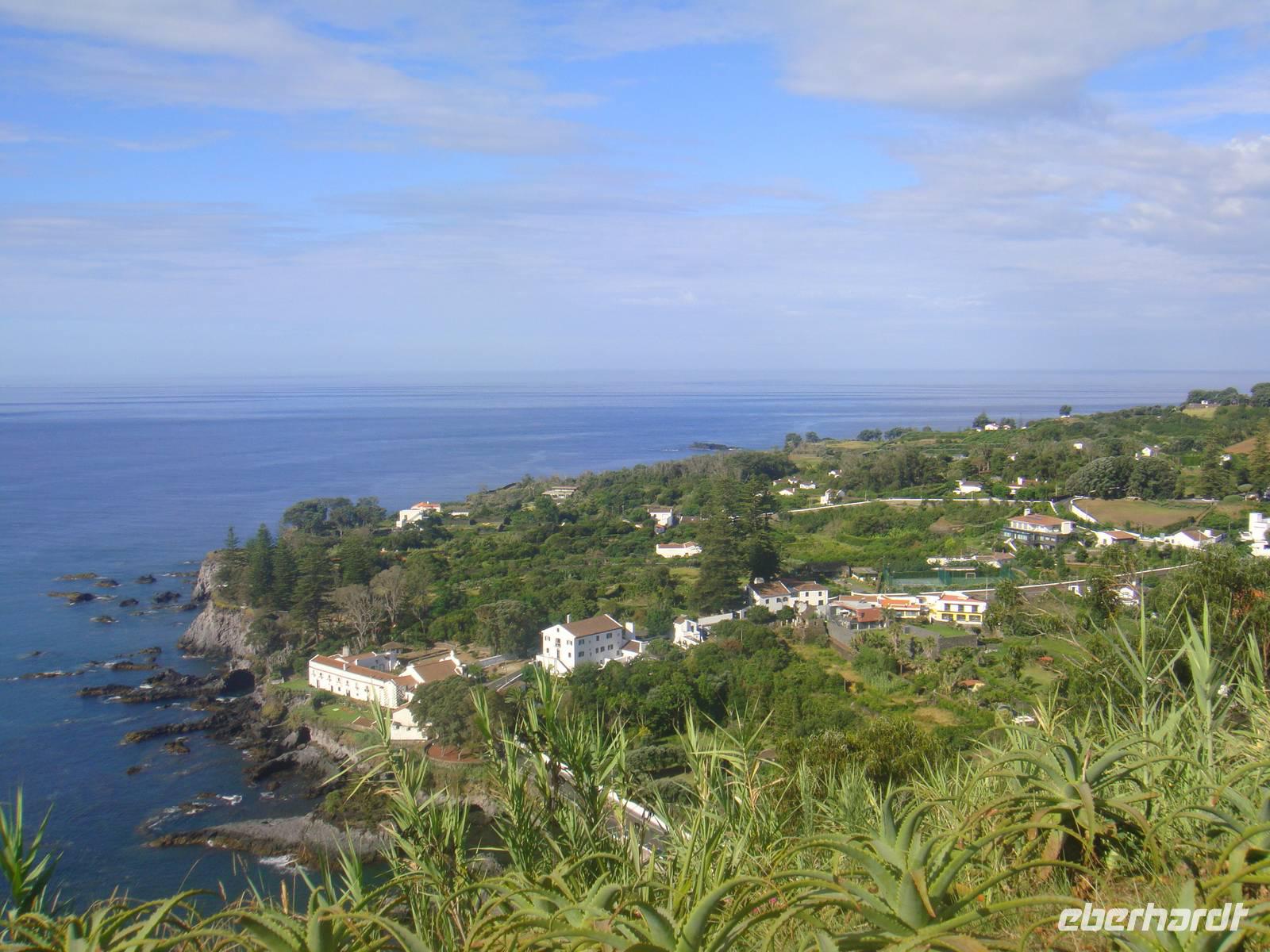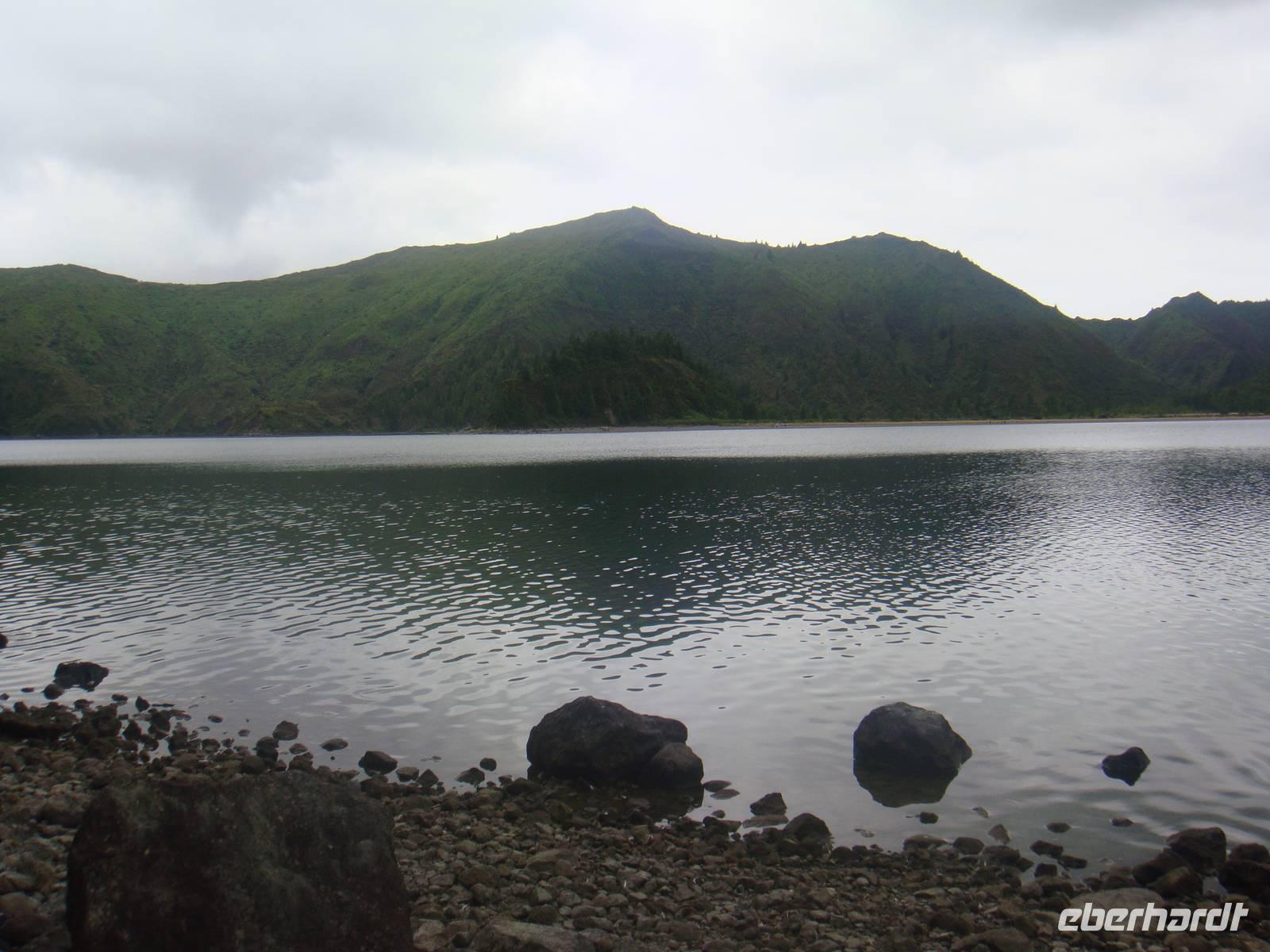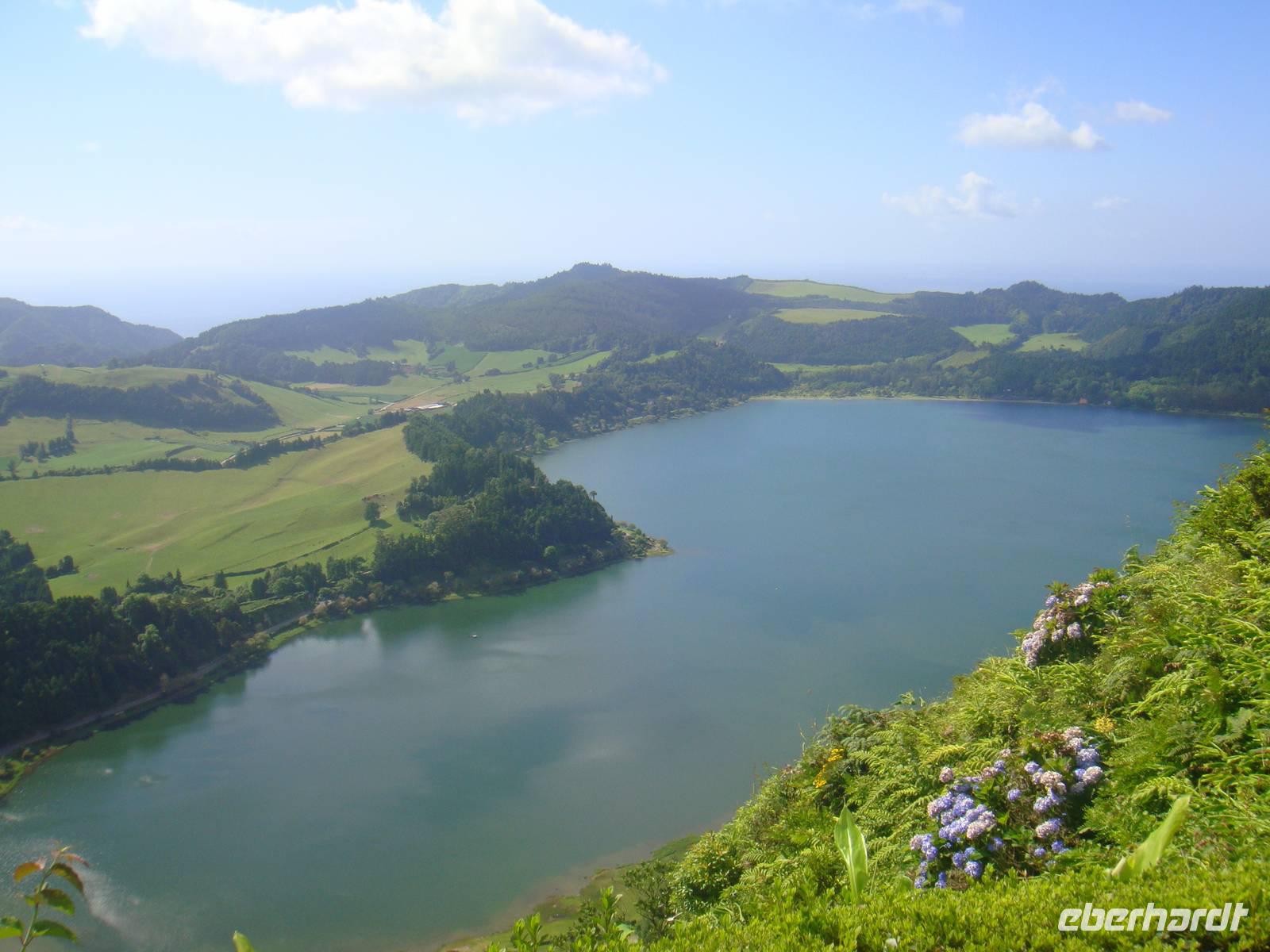 Im kleinen Ort Praia beginnt unsere Tour. Am Anfang gehen wir einen kleinen Anstieg und waren dann von Eukalyptus Bäumen, Akazien und Zier-Ingwer- und Espanda-Pflanzen umgeben. Zur Mittagsstunde erreichen wir den Feuersee „ Lagoa do Fogo". Er liegt auf 600 Metern Höhe und liegt in einem noch komplett naturbelassenen Krater und ist 1563 bei einem Ausbruch des Pico da Sapateira entstanden.