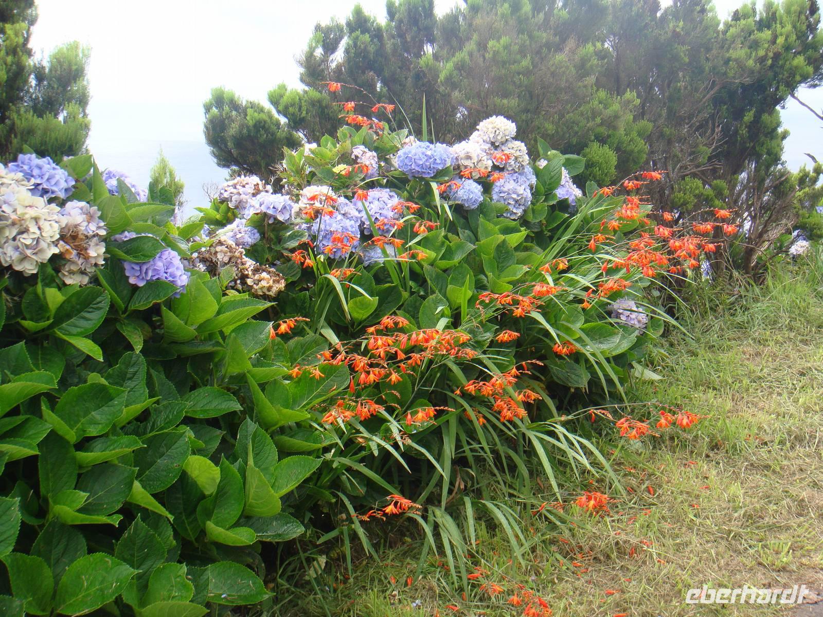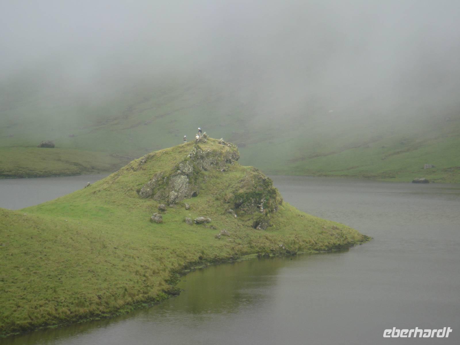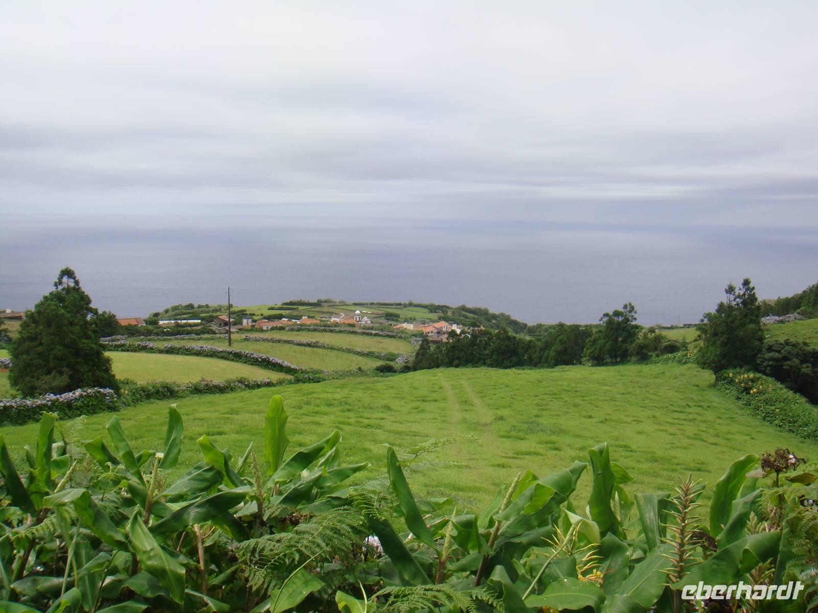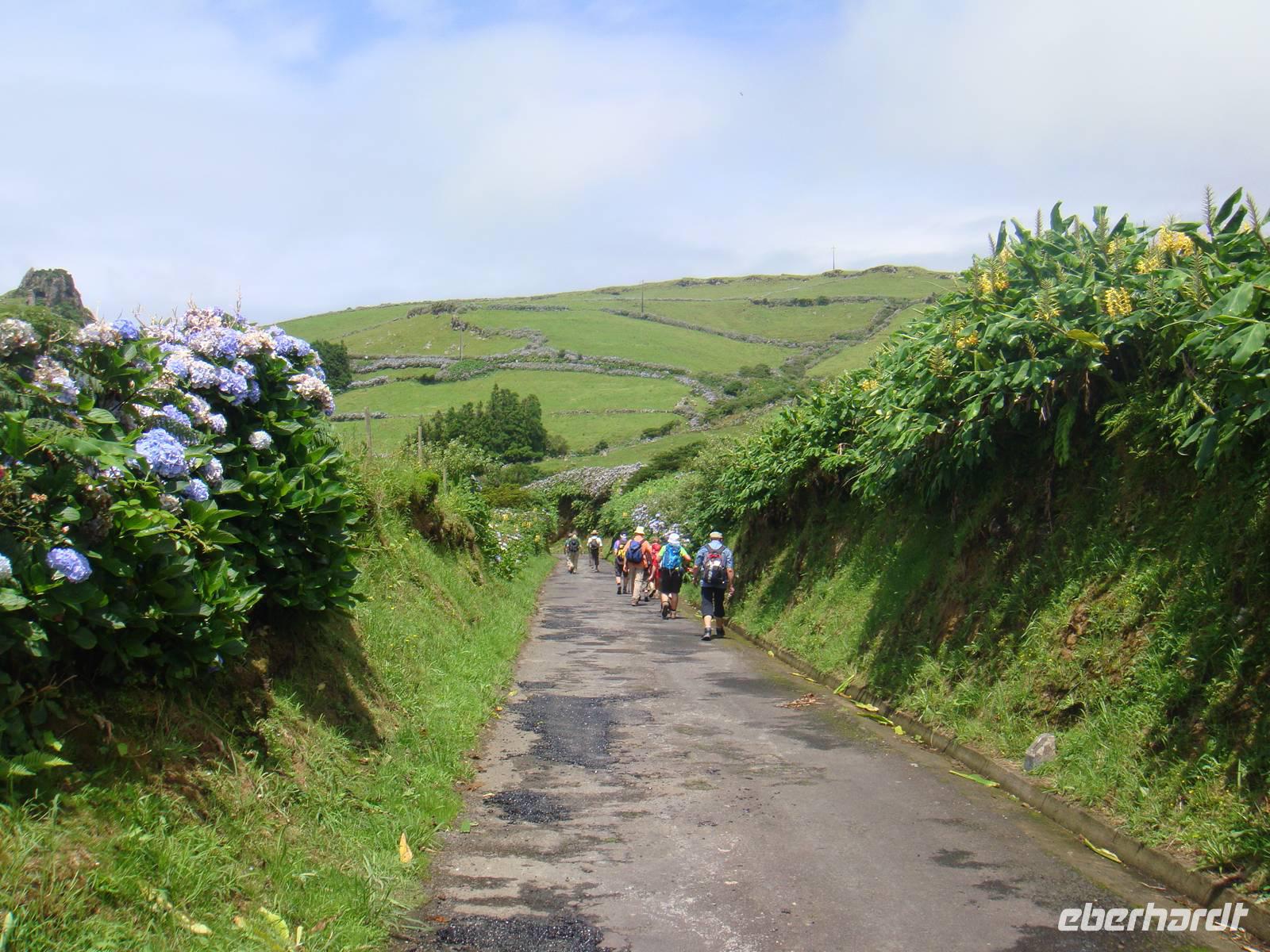 Im kleinen Ort Praia beginnt unsere Tour. Am Anfang gehen wir einen kleinen Anstieg und waren dann von Eukalyptus Bäumen, Akazien und Zier-Ingwer- und Espanda-Pflanzen umgeben. Zur Mittagsstunde erreichen wir den Feuersee „ Lagoa do Fogo". Er liegt auf 600 Metern Höhe und liegt in einem noch komplett naturbelassenen Krater und ist 1563 bei einem Ausbruch des Pico da Sapateira entstanden.