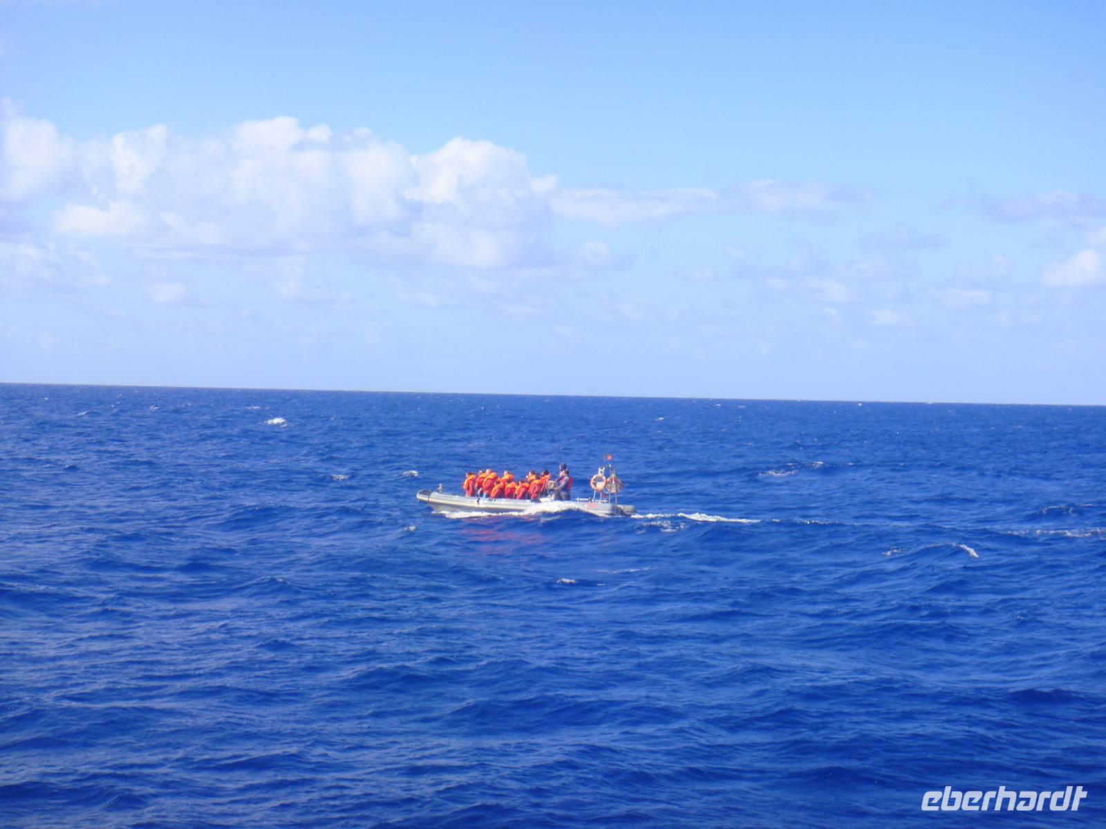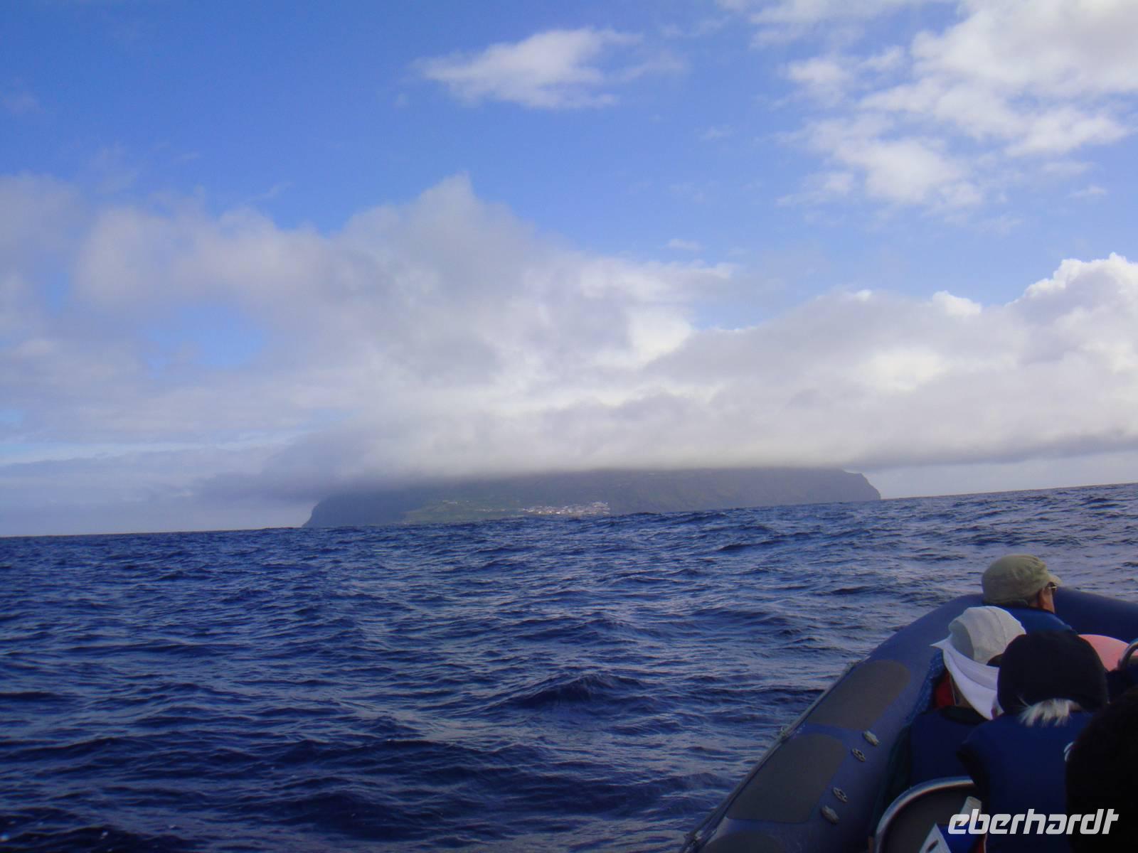Nach dem Frühstück gehen wir zum Hafen, ziehen die Schwimmwesten über und begeben uns an Bord des kleinen Gummibootes, welches uns zur Insel „Corvo" bringt.