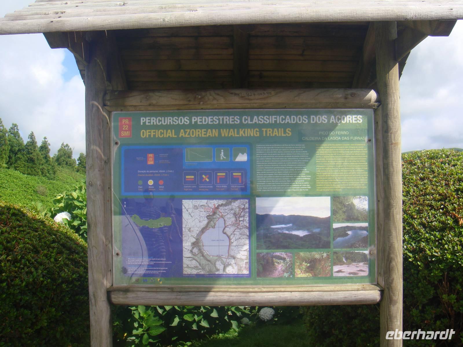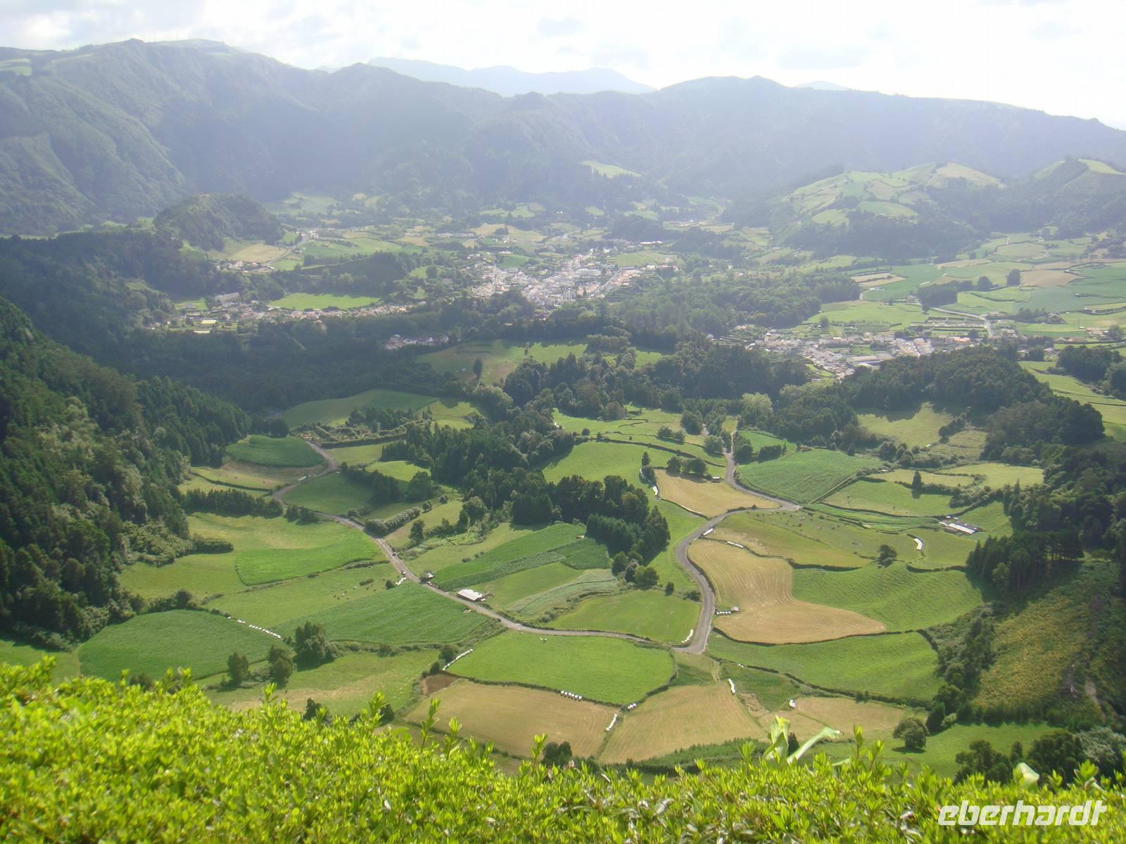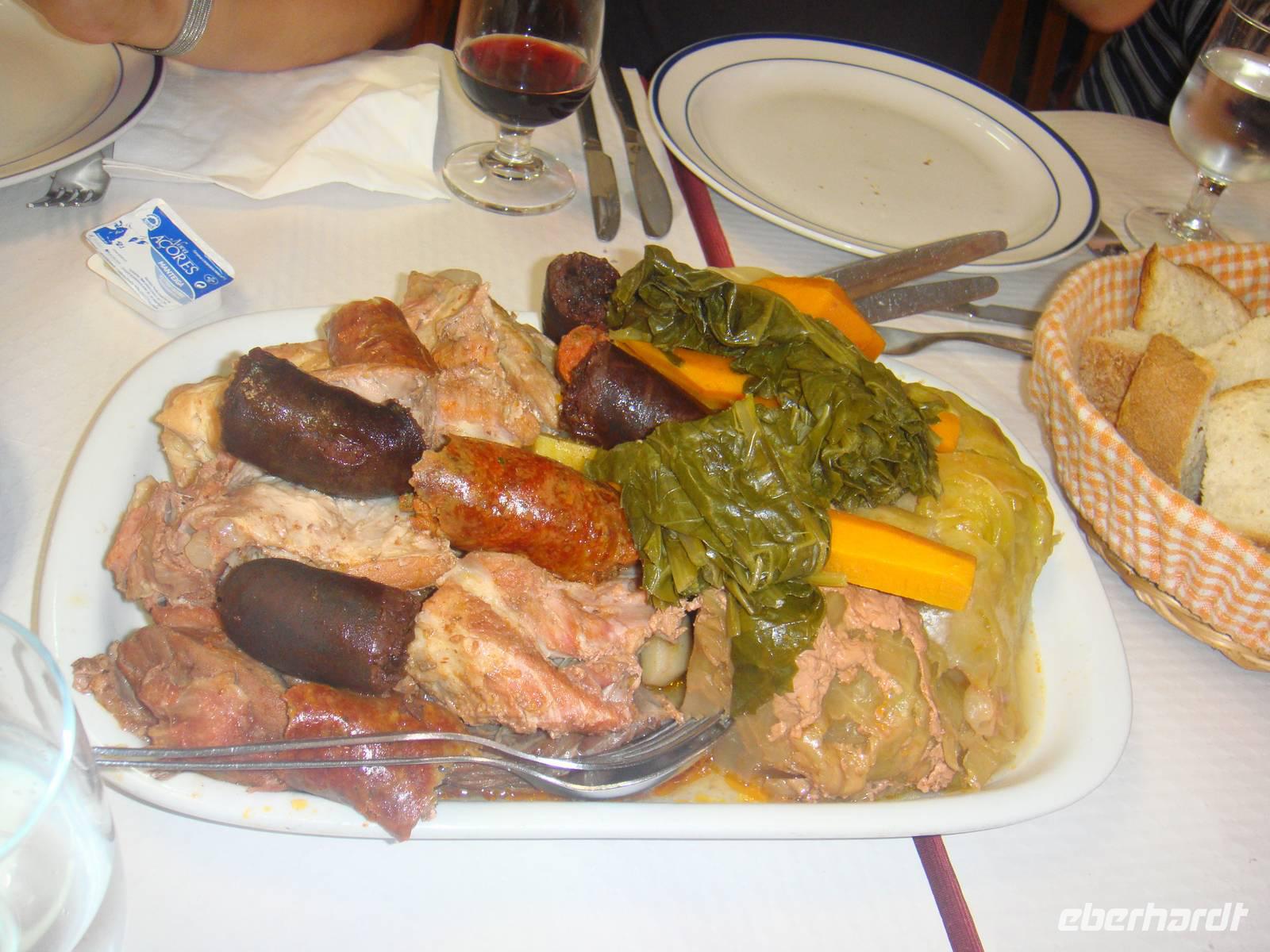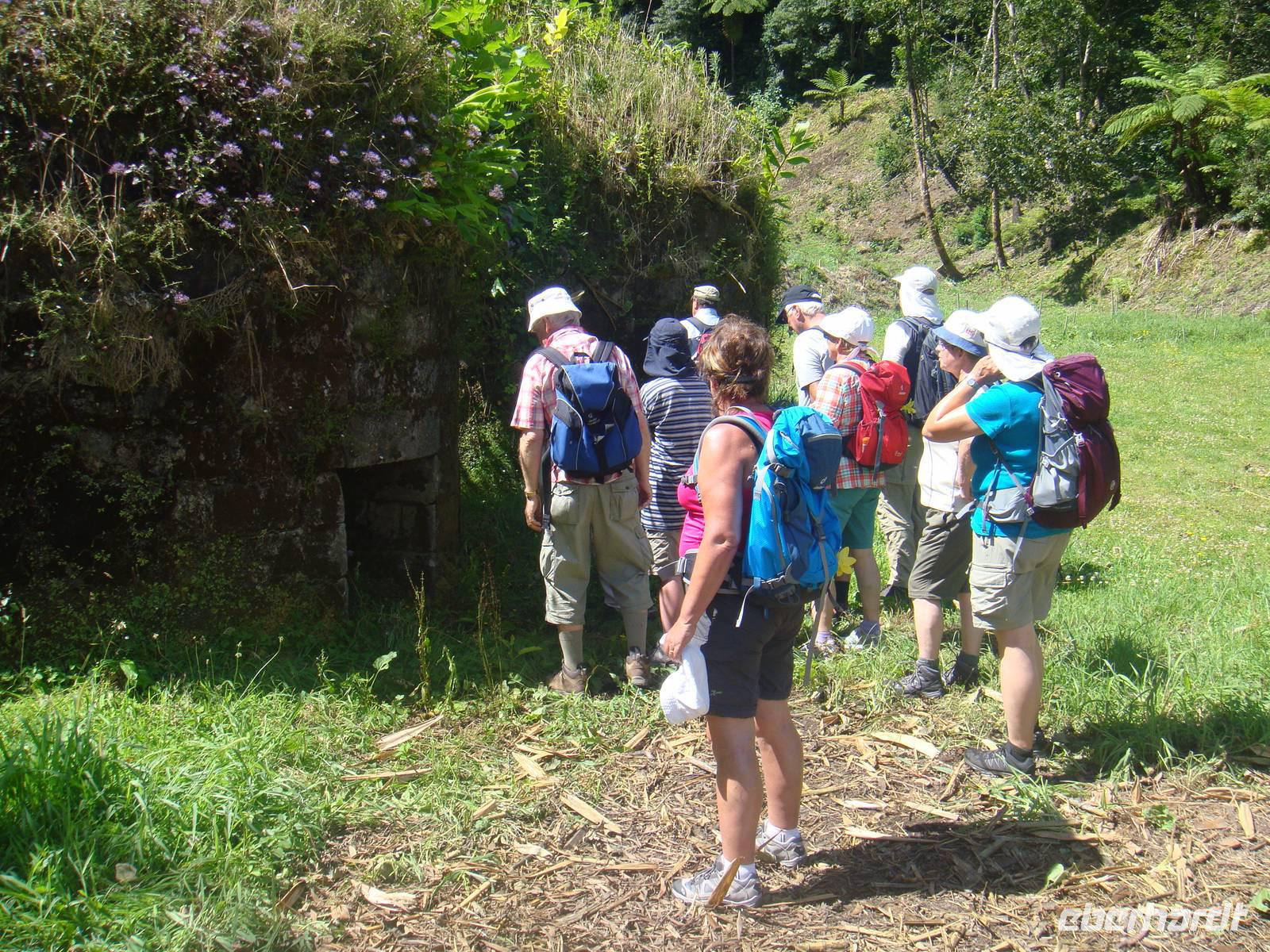 Wir beginnen im Städtchen Furnas. Die Umgebung des Ortes ist durch die geothermischen Vorgänge unter der Oberfläche der Azoren bekannt. Wir wandern am Waldrand entlang vorbei an Wiesen bis wir das Nordwestufer des Sees erreichen. Dort finden wir den Platz an dem die Einheimischen das Nationalessen den „Cozido" in den heißen Quellen kochen. Überall dampft und zischt es aus dem Boden. Wir beobachten wie auch unser Eintopf aus Fleisch, Kartoffeln, Gemüse und noch vielem mehr aus dem heißen Erdloch genommen wird. Bevor wir dies jedoch verzehren können gehen wir durch den Wald entlang am Ufer des Lagoa das Furnas. Wir genießen den Blick auf den See und die prächtigen Villen und deren herrlichen Gärten. Die Wanderung hat uns hungrig gemacht und wir essen vom Eintopf aus den heißen Erdlöchern.