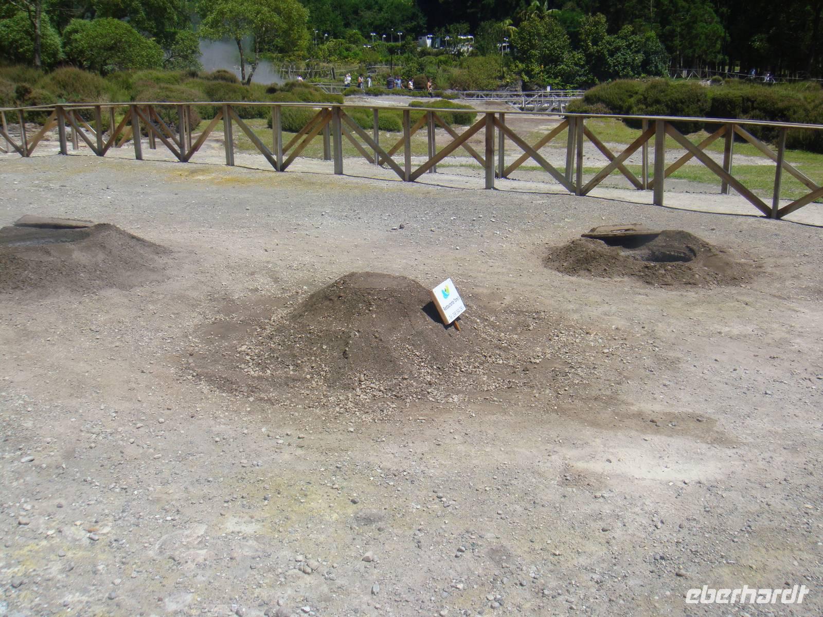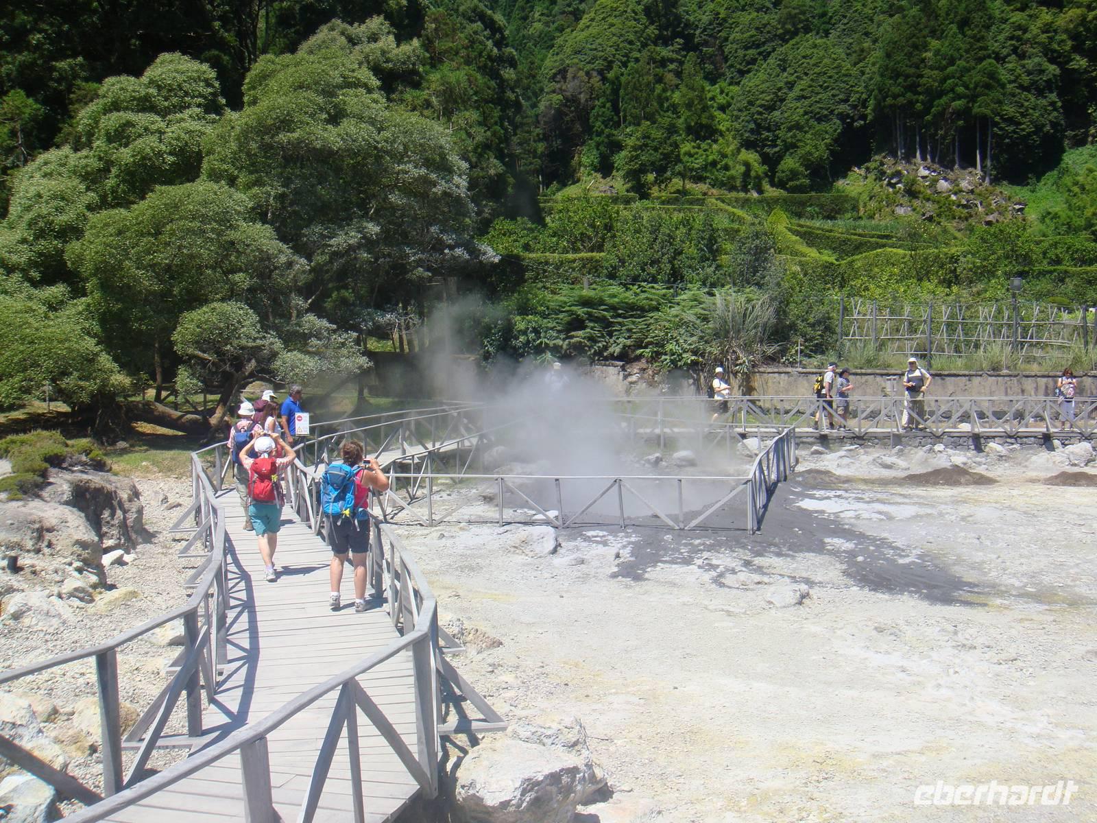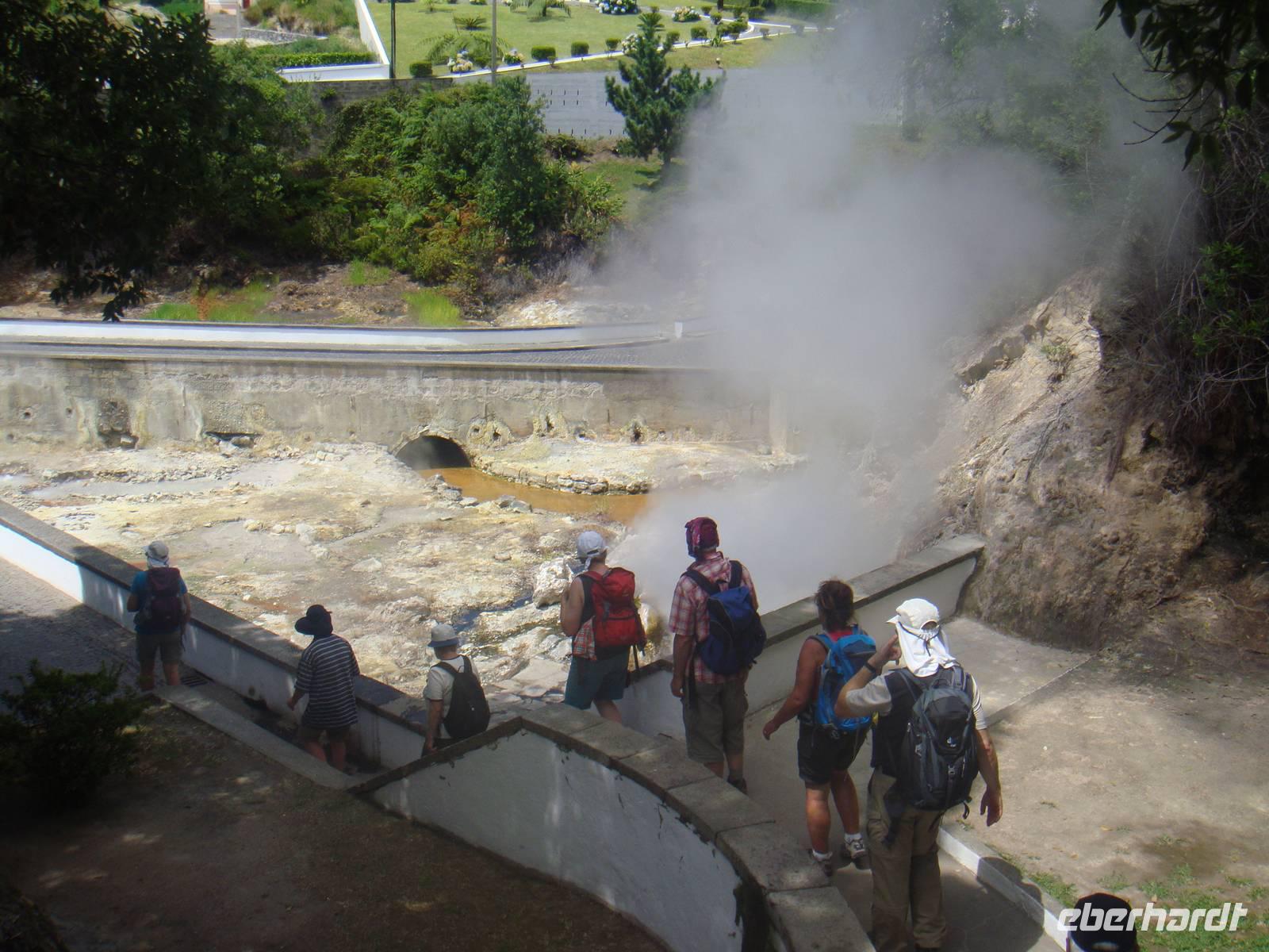 Nach dem Mittagessen besuchen wir die Caldeiras im Ort Furnas, die wegen Ihrer aufsteigenden Dampfschwaden nicht zu übersehen sind. Die größte sprudelt ca. 60 l Wasser pro Minute mit einer Temperatur von 98 Grad Celsius.