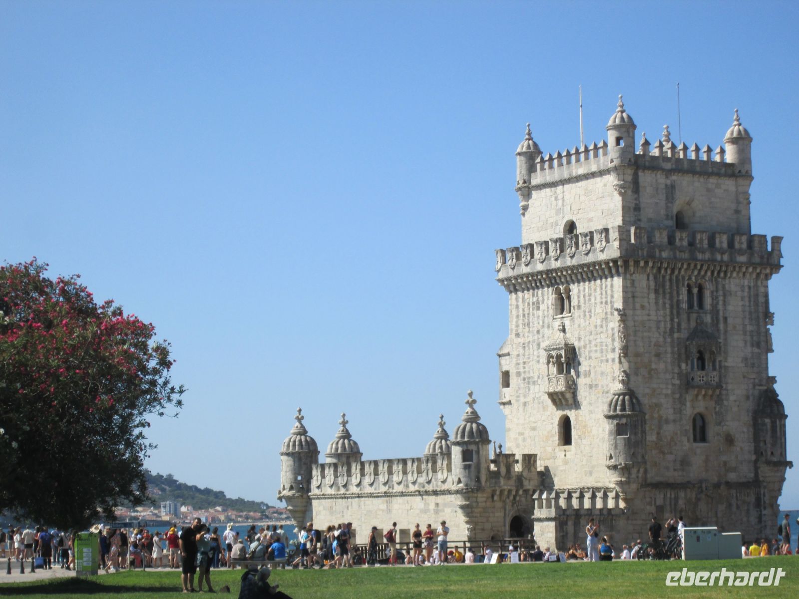 Mit Margarida und dem Fahrer Americo begann der Tag in Lissabon mit einer kurzen orientierenden Fahrt über die knapp 2 km lange Prachtstraße, Avenida da Liberdade mit ihren Jugendstil-Häusern und eleganten Geschäften, Richtung Amoreiras-Hochhaus. Was nach Fertigstellung Anfang der 1990er Jahre zu kontroversen Diskussionen führte, ist heute aus dem Lissaboner Stadtbild nicht mehr wegzudenken. In den 3 Hochhäusern, die sogar den bekannten Valmor-Preis für herausragende Architektur erhielten, befinden sich heute eines der größten Einkaufszentren der Stadt, aber auch Wohnungen und Büros. An der "grünen Lunge Lissabons" vorbei und entlang des Tejo, kamen wir schließlich in Belem an. Schon auf dem Busparkplatz ahnte man, dass wir nicht die einzigen Gäste waren. Der Stadtteil Belem besitzt gleich mehrere Attraktionen. neben den Parkanlagen und Museen, gibt es das Hieronymuskloster, den Belem Turm und das Entdeckerdenkmal.
