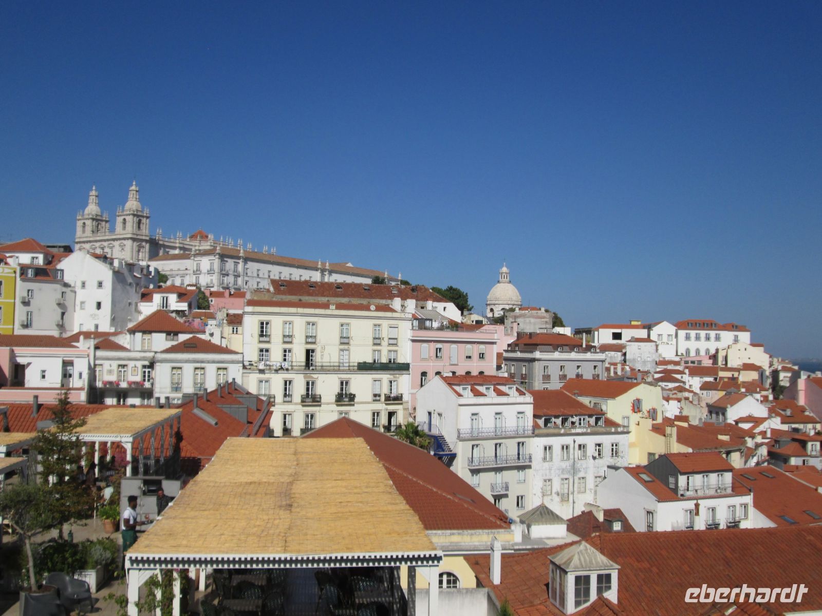 Zurück am Hotel, gab es eine kurze Erholungspause, bevor am Nachmittag ein Spaziergang zur Burg San Jorge und in die Altstadt Alfama auf dem Programm stand. Nicht alle folgten diesem Vorschlag, standen doch andere Wünsche im Vordergrund. Die nunmehr kleine Gruppe sollte einiges leisten, die Wege zur und von der Festung und durch die Altstadt sind mühsam, aber einmal oben, wird man mit einem fantastischen Blick auf den Tejo, auf der anderen Flussseite auf die Christus Statue und auf das Zentrum Lissabons belohnt.