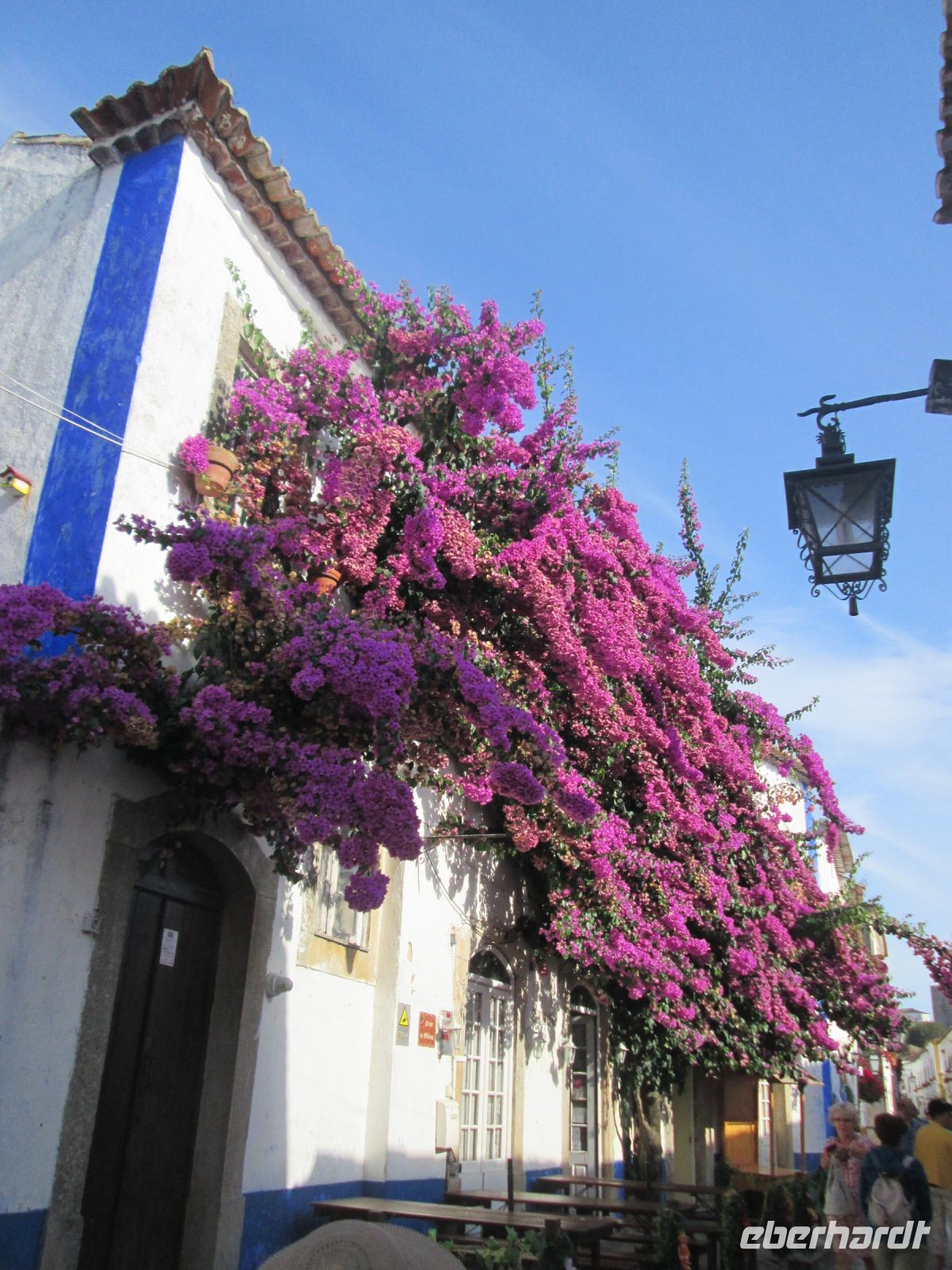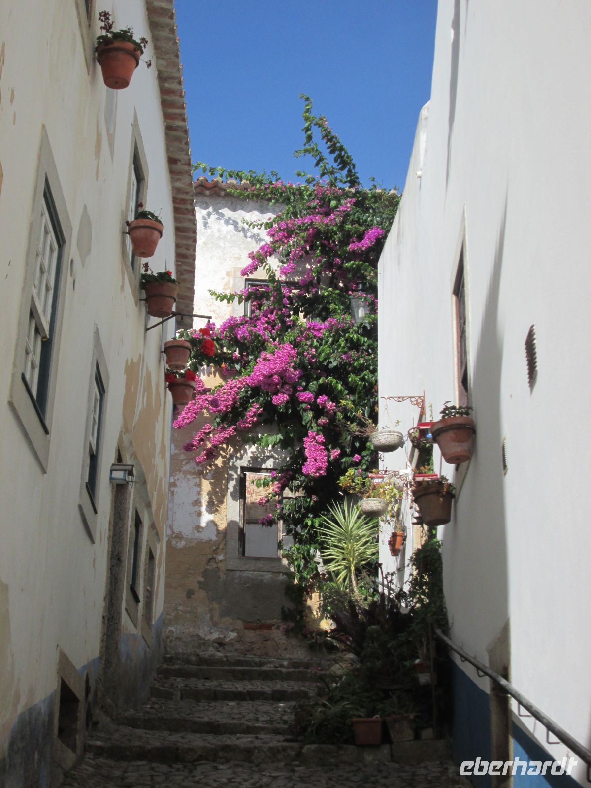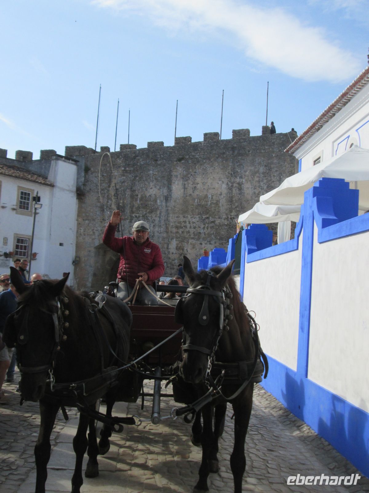 Obidos wird bis heute von einer 1,6 km langen Stadtmauer, die z.T. begehbar ist, umgeben. Viele Könige erweiterten sie. Der Eingang zur Stadt erfolgte einst durch 4 Tore. Für uns war der Eingang durch ein doppeltes Stadttor mit einem Oratorium und seinen typischen Kacheln, den Azulejos. König Diniz hat seiner Frau Isabel die Herrschaft über die Stadt zur Hochzeit geschenkt. Seitdem war die Stadt Eigentum des "Casa das Rainhas"/Haus der Königinnen. Erst im 19. Jahrhundert erlosch dieser Stand.