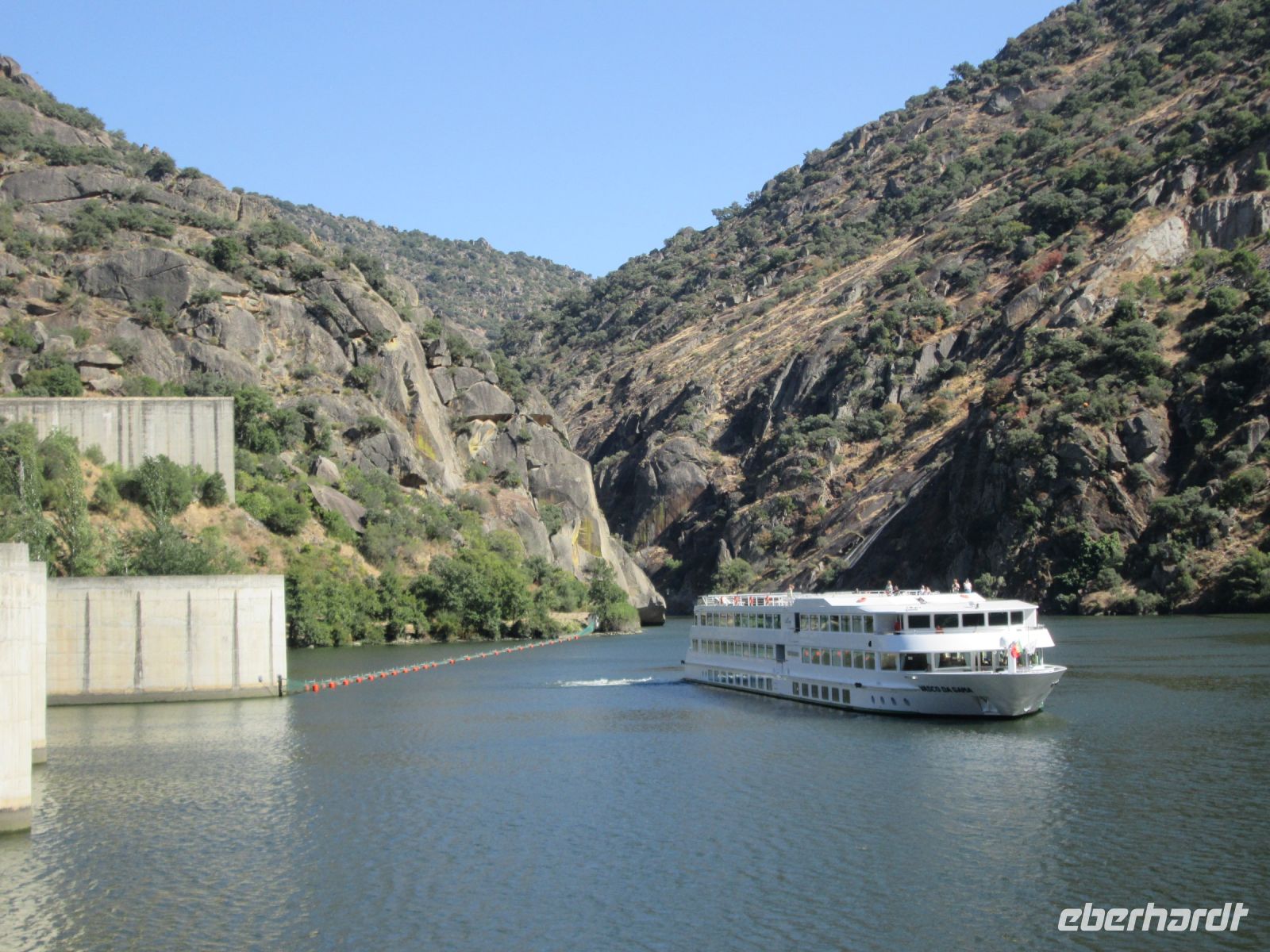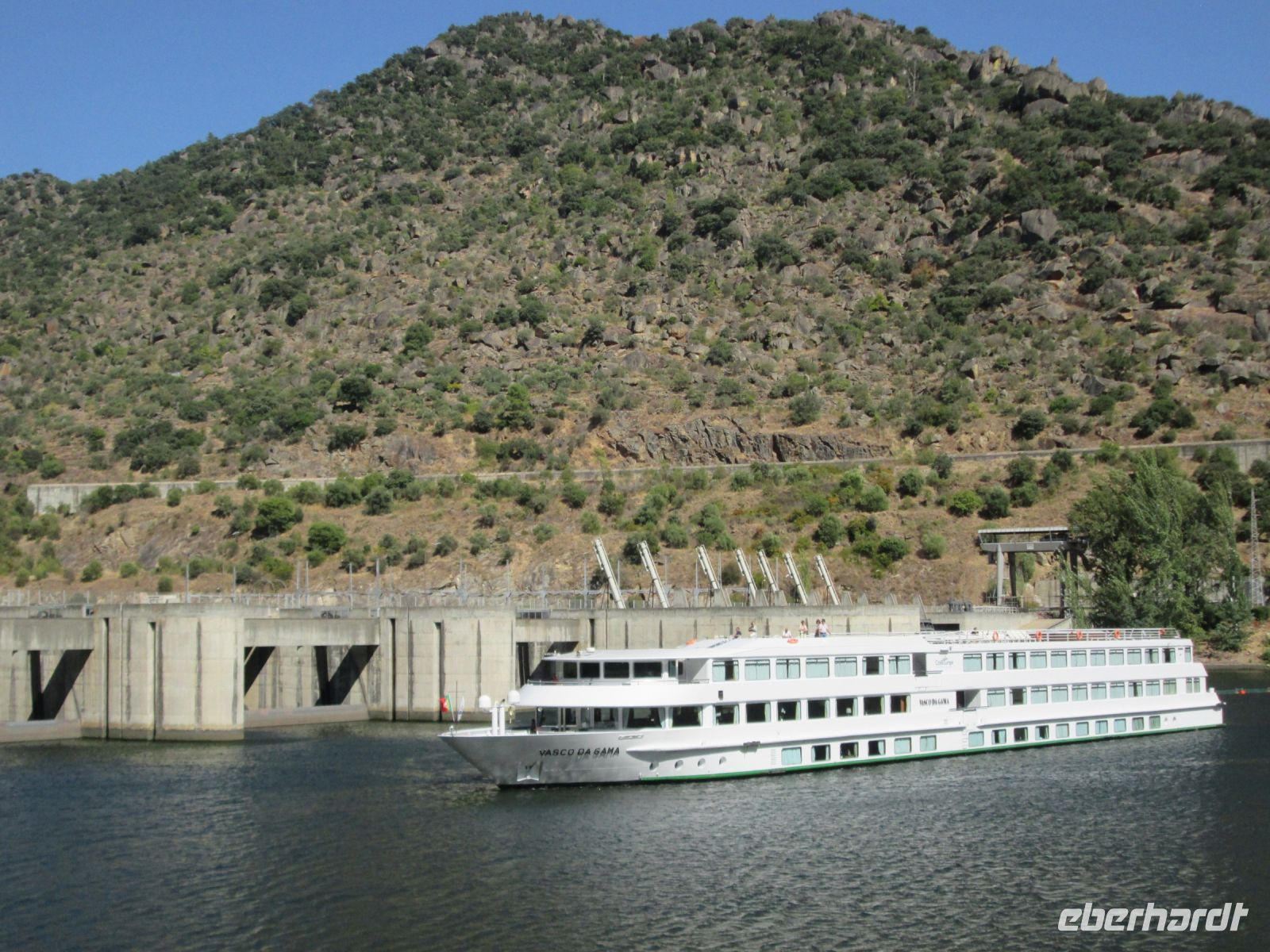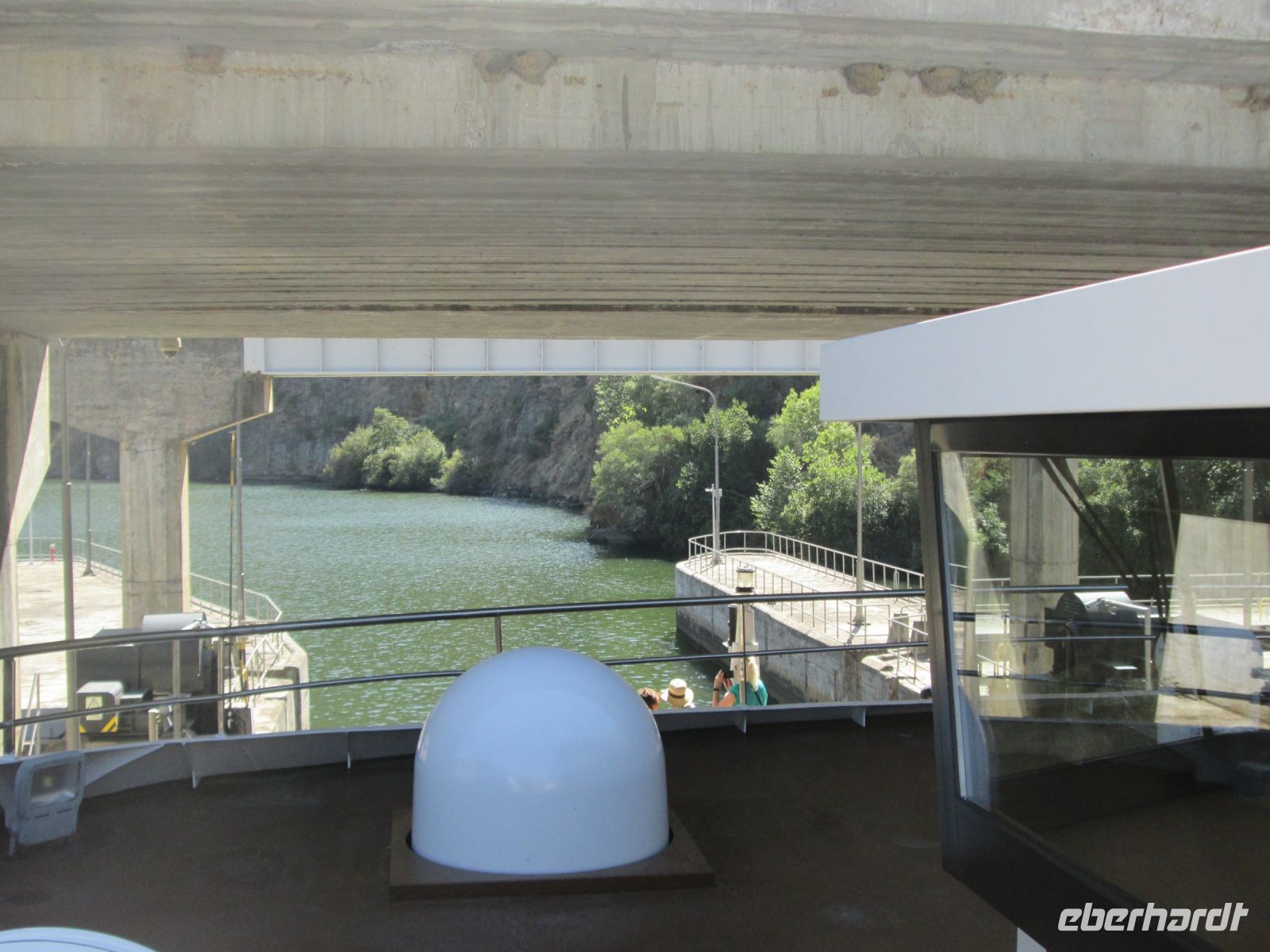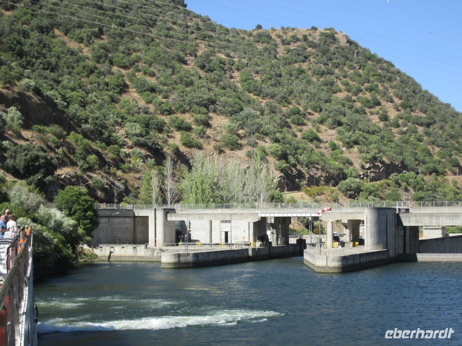 12.15 Uhr verließen wir Pinhao, das Zentrum des Alto Douro Gebietes mit seinen unzähligen Weingütern. Flussaufwärts ging es Richtung spanische Grenze, nahe der wir 18.50 Uhr ankamen. Dazwischen mussten wir an der 4. Schleuse, die von Valeira, etwas warten, weil ein kleineres Freizeitboot uns die direkte Einfahrt versperrt hatte. Die Durchfahrt war aber wieder sehr interessant. Perfekt manövrierte der Kapitän die "Alva" in die Schleusenkammer. Alsbald stieg der Wasserpegel auf 33 m Höhe. Erbaut wurde sie in den Jahren 1971 bis 1976. Dahinter wartete bereits die "Vasco da Gama", ein weiteres der insgesamt 26 Hotelschiffe auf dem Douro. Die Strecke mit der engsten Stelle im Tal nach der Valeira Schleuse war landschaftlich so eindrucksvoll, dass die meisten Gäste an Deck waren.