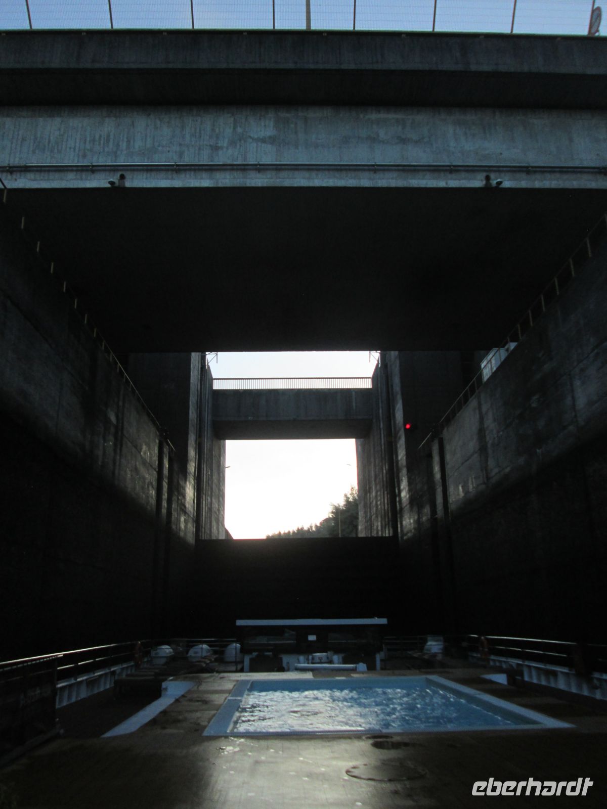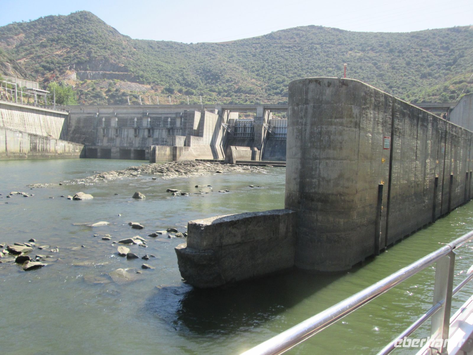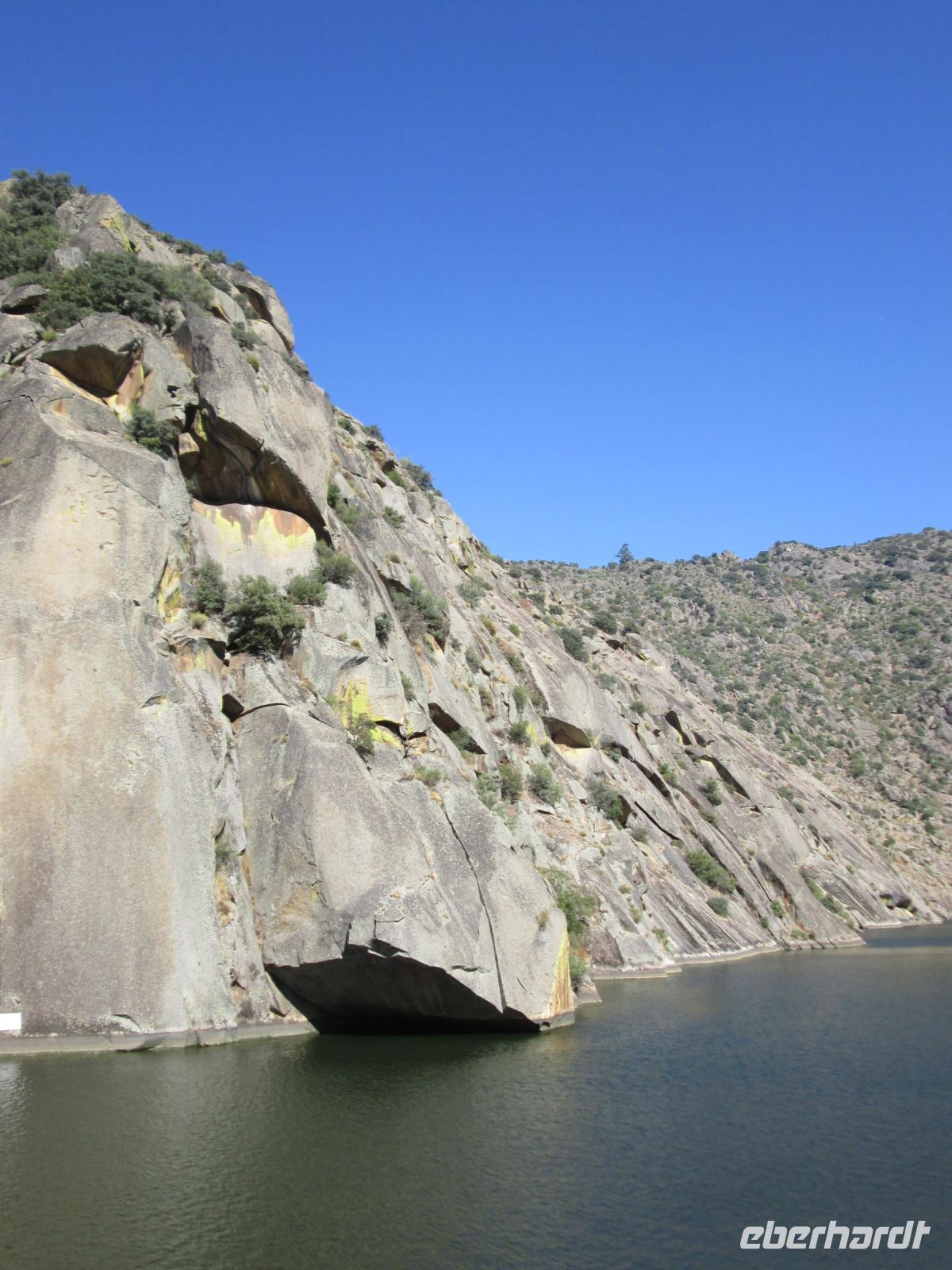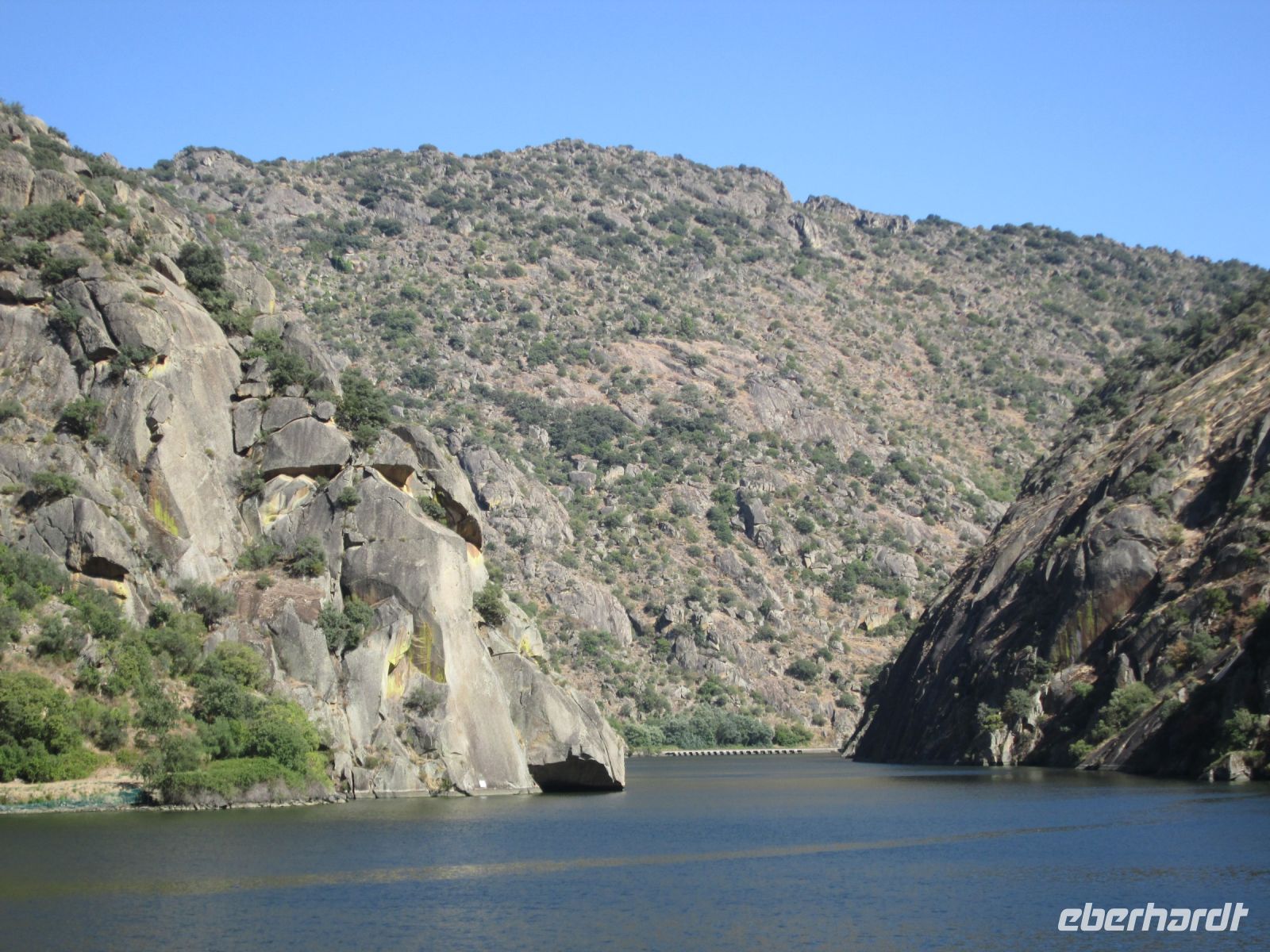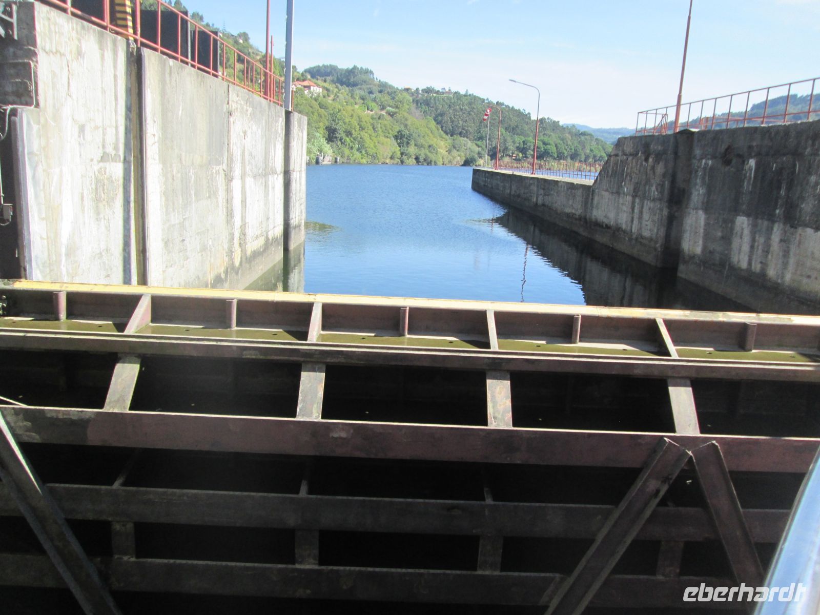 12.15 Uhr verließen wir Pinhao, das Zentrum des Alto Douro Gebietes mit seinen unzähligen Weingütern. Flussaufwärts ging es Richtung spanische Grenze, nahe der wir 18.50 Uhr ankamen. Dazwischen mussten wir an der 4. Schleuse, die von Valeira, etwas warten, weil ein kleineres Freizeitboot uns die direkte Einfahrt versperrt hatte. Die Durchfahrt war aber wieder sehr interessant. Perfekt manövrierte der Kapitän die "Alva" in die Schleusenkammer. Alsbald stieg der Wasserpegel auf 33 m Höhe. Erbaut wurde sie in den Jahren 1971 bis 1976. Dahinter wartete bereits die "Vasco da Gama", ein weiteres der insgesamt 26 Hotelschiffe auf dem Douro. Die Strecke mit der engsten Stelle im Tal nach der Valeira Schleuse war landschaftlich so eindrucksvoll, dass die meisten Gäste an Deck waren.
