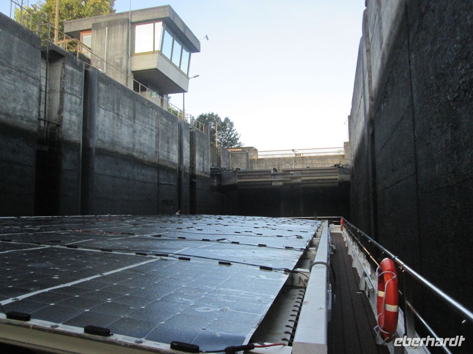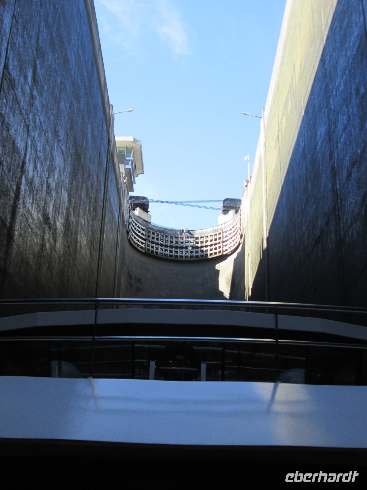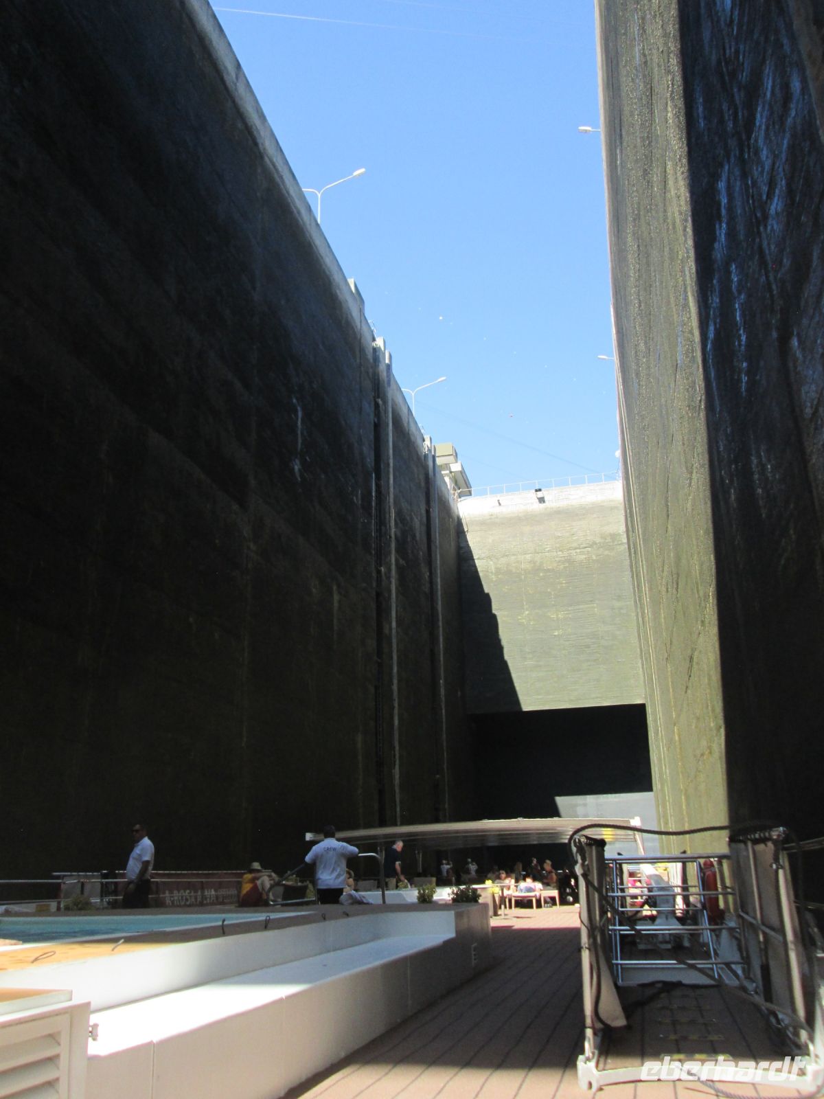 Es hat eine Länge von fast 80 m und eine Breite von 11,40 m . Letzteres muss so bleiben, da sonst keine Schleusendurchfahrt mehr möglich sein würde. Alle 5 Schleusen auf dem Douro sind 12 m breit. Unser Kapitän, der Portugiese Diogo Martins, hatte mit Hilfe seiner Crew natürlich alle Schleusenein-und ausfahrten mit Bravour gemeistert. Jede Schleusendurchfahrt muss bezahlt werden: eine Einmalzahlung von je € 43,09 plus