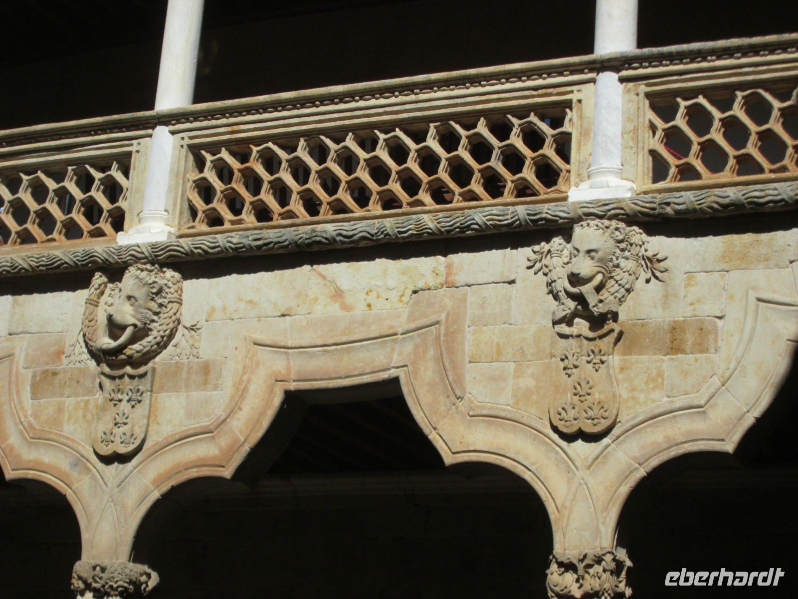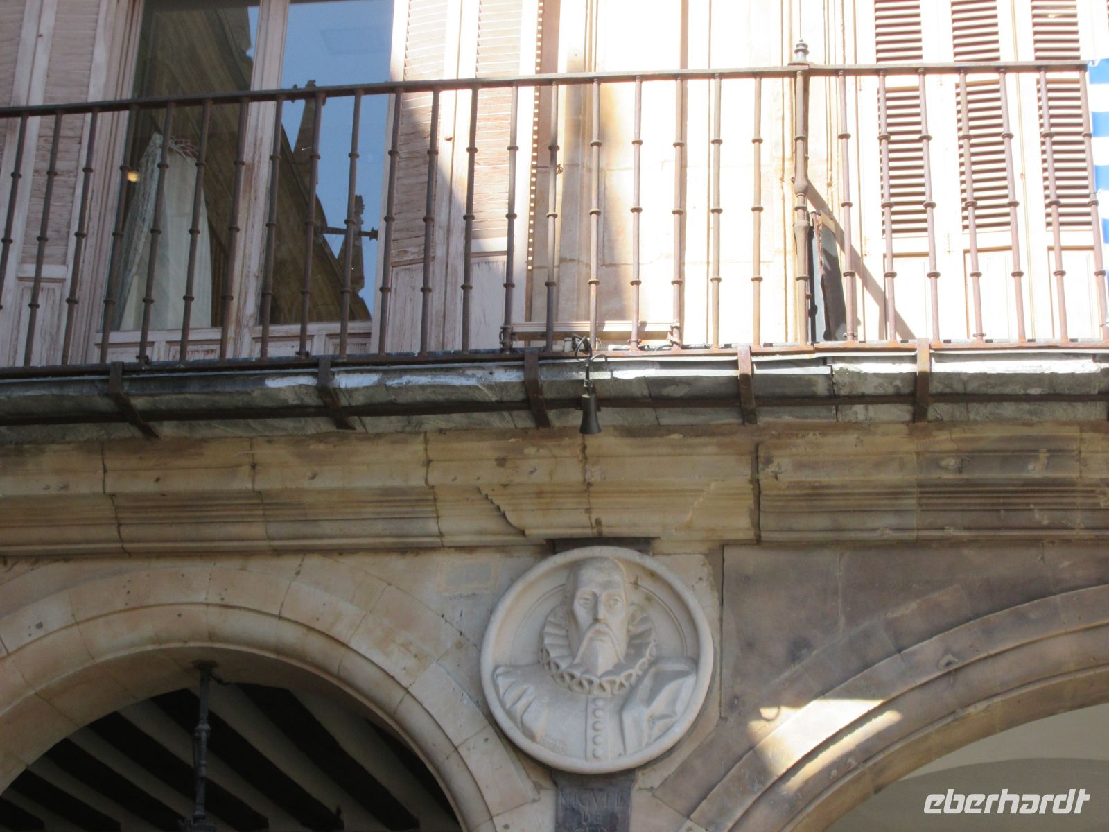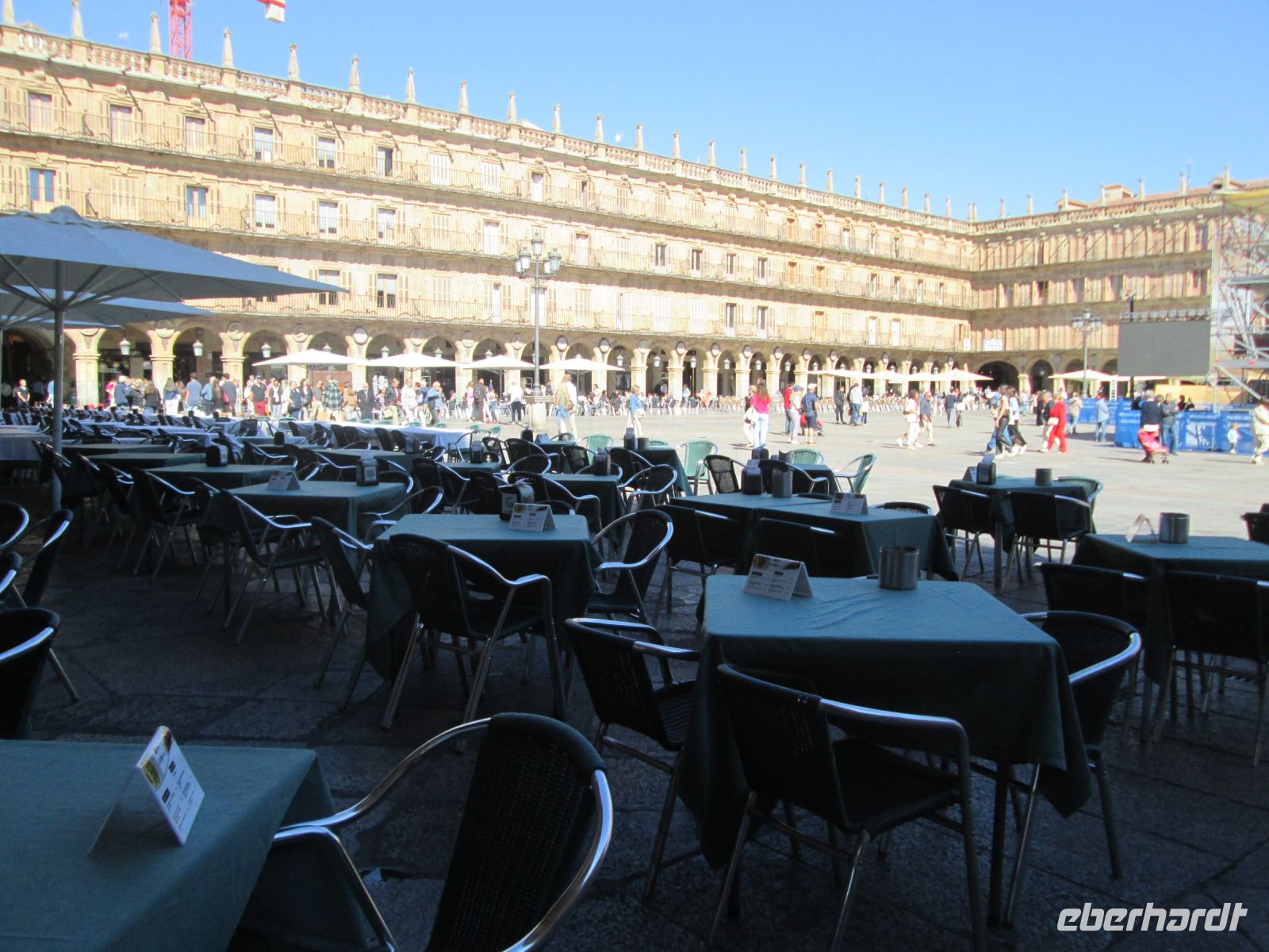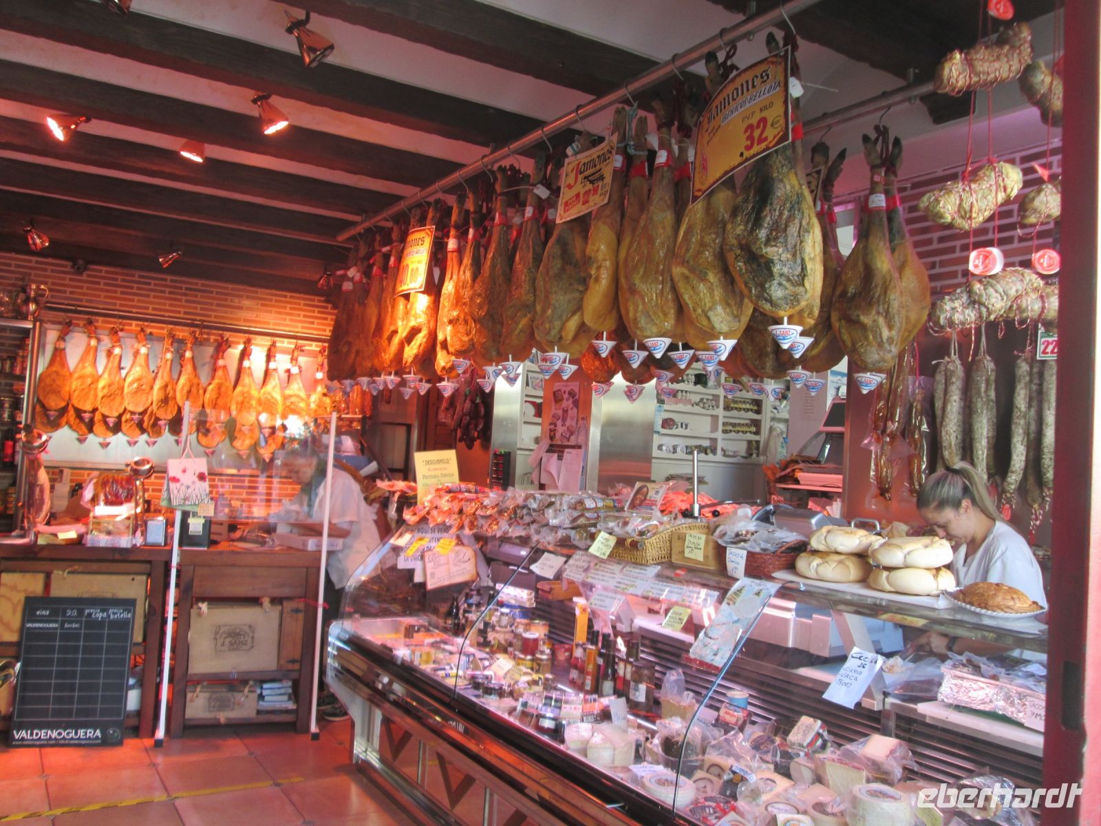 Das 16. Jahrhundert war für Salamanca prägend, mit Prachtbauten wurde die Stadt größer und berühmt. Der Hauptplatz, Placa Major, ist das beste Beispiel dafür. Unsere Stadtführerin Alicia berichtete uns, sobald der Stier über der Flagge auf dem Rathaus zu sehen ist, wird in den nächsten Tagen ein Stierkampf stattfinden. Wir konnten tatsächlich einen Stier sehen. Zu sehen waren außerdem die vielen kulinarischen Köstlichkeiten, allen voran der iberische Schinken.