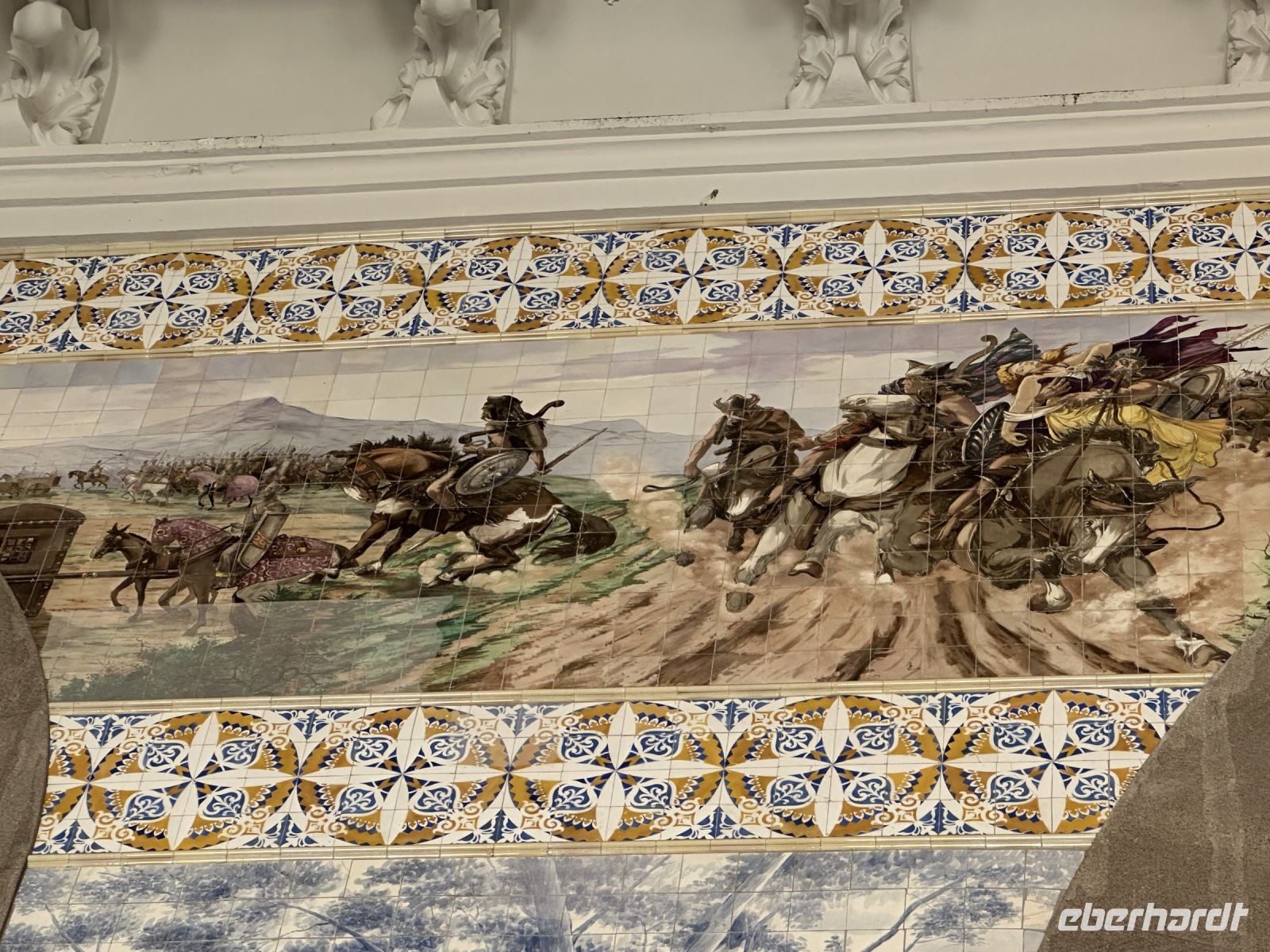 Als wir nach Porto kommen, fallen uns sofort die beeindruckenden Brücken auf. Unsere Reiseleiterin Sylvia hat zu jeder Brücke etwas zu berichten. Die Ponte Dom Luís I ist eine doppelstöckige Eisenbogenbrücke, entworfen von einem Schüler Gustave Eiffels, die berühmteste Brücke Portos und ein Wahrzeichen der Stadt. Die obere Ebene wird von der Metro und Fußgängern genutzt und bietet eine fantastische Aussicht, während die untere Ebene dem öffentlichen Verkehr, Taxis, Fahrrädern und Fußgängern dient. Die Ponte de Arrábida ist eine elegante Betonbogenbrücke und war bei ihrer Fertigstellung die längste ihrer Art weltweit. Sie verbindet Porto mit Vila Nova de Gaia. Eine der neuesten Brücken Portos ist die Ponte Infante Dom Henrique. Sie zeichnet sich durch ihr modernes Design aus und ist nach Heinrich dem Seefahrer benannt, der in Porto geboren wurde. Jede Brücke von Porto (es gibt noch mehr) hat ihren eigenen Charakter, ihre eigene Geschichte und trägt zum einzigartigen Charme und zur Identität Portos bei. Während der Stadtrundfahrt, die bis zur Mündung des Douro in den Atlantik führt, kommen wir unter anderem am Straßenbahnmuseum vorbei. Dieses Museu do Carro Eléctrico befindet sich in einem ehemaligen Elektrizitätswerk am Ufer des Douro. Es beherbergt eine beeindruckende Sammlung historischer Straßenbahnen und anderer Fahrzeuge des öffentlichen Nahverkehrs von Porto, darunter auch eine Pferdebahn. Leider reicht unsere Zeit nicht aus, um hier einen Stopp einzulegen. Dennoch verlassen wir bald den Bus und gehen zu Fuß weiter. Auf dem Platz der Freiheit begegnen wir dem Reiterstandbild für König Dom Pedro IV. Dieser war König von Portugal, aber auch Kaiser Pedro I. von Brasilien und spielte in beiden Ländern eine wichtige Rolle. Wir spazieren zum Vorplatz der Kathedrale von Porto. Hier gibt es eine schöne Aussicht auf die Altstadt. Vor der Kathedrale befindet sich ein riesiger Schandpfahl, der Pelourinho do Porto. In der Vergangenheit hatten solche Schandpfähle eine düstere Funktion im gesellschaftlichen Leben. Hier wurden verurteilte Straftäter öffentlich zur Schau gestellt und gedemütigt. Laut unserer Stadtführerin Sylvia wurde dieser Schandpfahl jedoch nie benutzt und ist heute nur noch eine dekorative Säule. Wir kommen nun zum berühmten Bahnhof von Porto – dem Sao Bento. Berühmt ist dieser für seine wundervollen Azulejo Wandbilder in der Eingangshalle, die wir, gemeinsam mit vielen anderen Touristen, ausführlich betrachten. Diese Wandbilder bestehen aus 20.000 bemalten Keramikfliesen, die bedeutende Szenen aus der Geschichte Portugals darstellen. Es werden verschiedene Gruppen von Menschen dargestellt, die in unterschiedliche Aktivitäten vertieft sind. Es gibt ein Marktgeschehen zu sehen oder Bauern, die am Tisch sitzen, essen und trinken oder eine Versammlung abhalten. Frauen bei der Obsternte, auf Booten oder ins Gespräch vertieft. Stundenlang könnte man vor den Bildern verweilen und diese studieren. Im oberen Teil des Bahnhofs gibt es einen farbigen Wandfries zu sehen. Dieser erinnert an militärische Auseinandersetzungen, in dem er zahlreiche Reiter darstellt, die Rüstungen und Waffen tragen, Banner und Wappen. Die abgebildete Landschaft und die Figuren erscheinen durch die Farbigkeit noch bewegter und lebendiger. Nun bleibt uns eine halbe Stunde Freizeit für eigene Erkundungen bis wir unseren Weg Richtung Douro fortsetzen. Wir besuchen die Kellerei Burmester in Vila Nova de Gaia, direkt gegenüber von Porto. Diese ist bekannt für ihre traditionelle Portweinproduktion. Wir nehmen an einer Führung teil, die letztendlich auch mit einer Verkostung endet. Selbstverständlich darf der gute Tropfen auch gekauft werden. Zum Mittagessen sind wir zurück an Bord und der Nachmittag steht in Porto zur freien Verfügung.