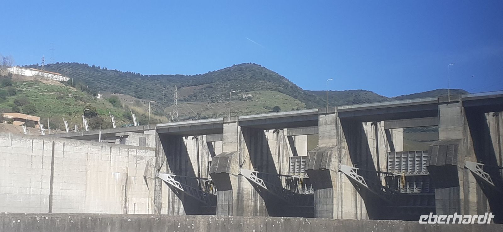 Der Tag stand ganz im Zeichen des Douro. Um am nächsten Tag noch Porto erreichen zu können, mussten wir viele Flusskilometer schaffen. Wir passierten die niedrigste Brücke, die den Fluss überspannt und mehrere Schleusen. Wir genossen total entspannt den Flusslauf, der sich heute in seiner ganzen Fülle präsentierte. Unterwegs wechselten tagsüber die Landschaftsformen, der Fluss wurde schmaler, dann wieder breiter. An den Ufern wechselten Olivenhaine mit Weinbergen, Kiefern mit farnbewachsenen Steilhängen. Mitunter stürzten Wasserfälle in den Douro hinab oder gleiteten Nebenflüsse sanft in den Douro hinein. Unterwegs ließen wir uns von Mahlzeit zu Mahlzeit mit Leckereien verwöhnen oder schlürften kühlende Cocktails auf dem Sonnendeck. Am Abend erreichten wir Caia de Leixa kurz vor der letzten Schleuse.